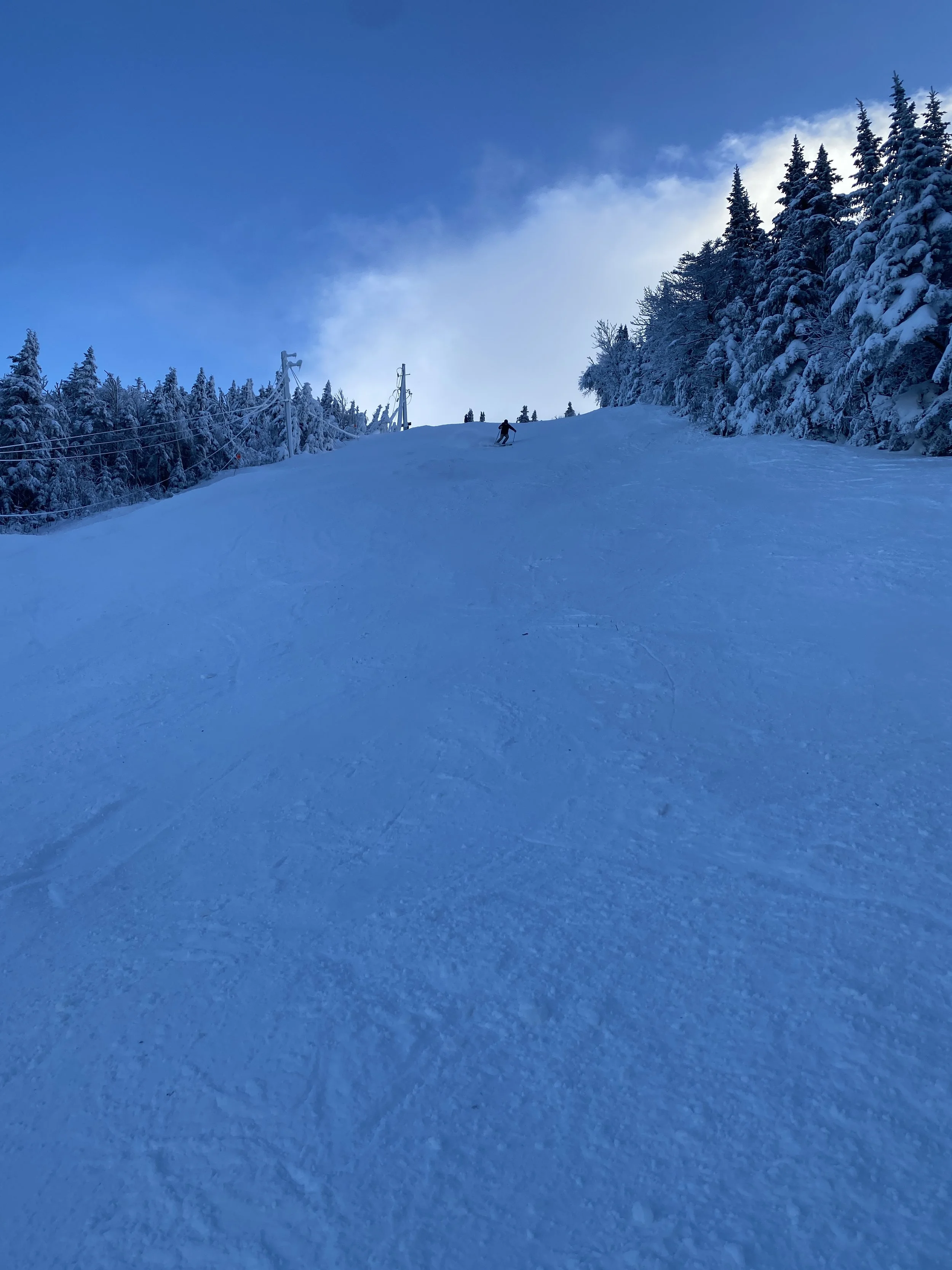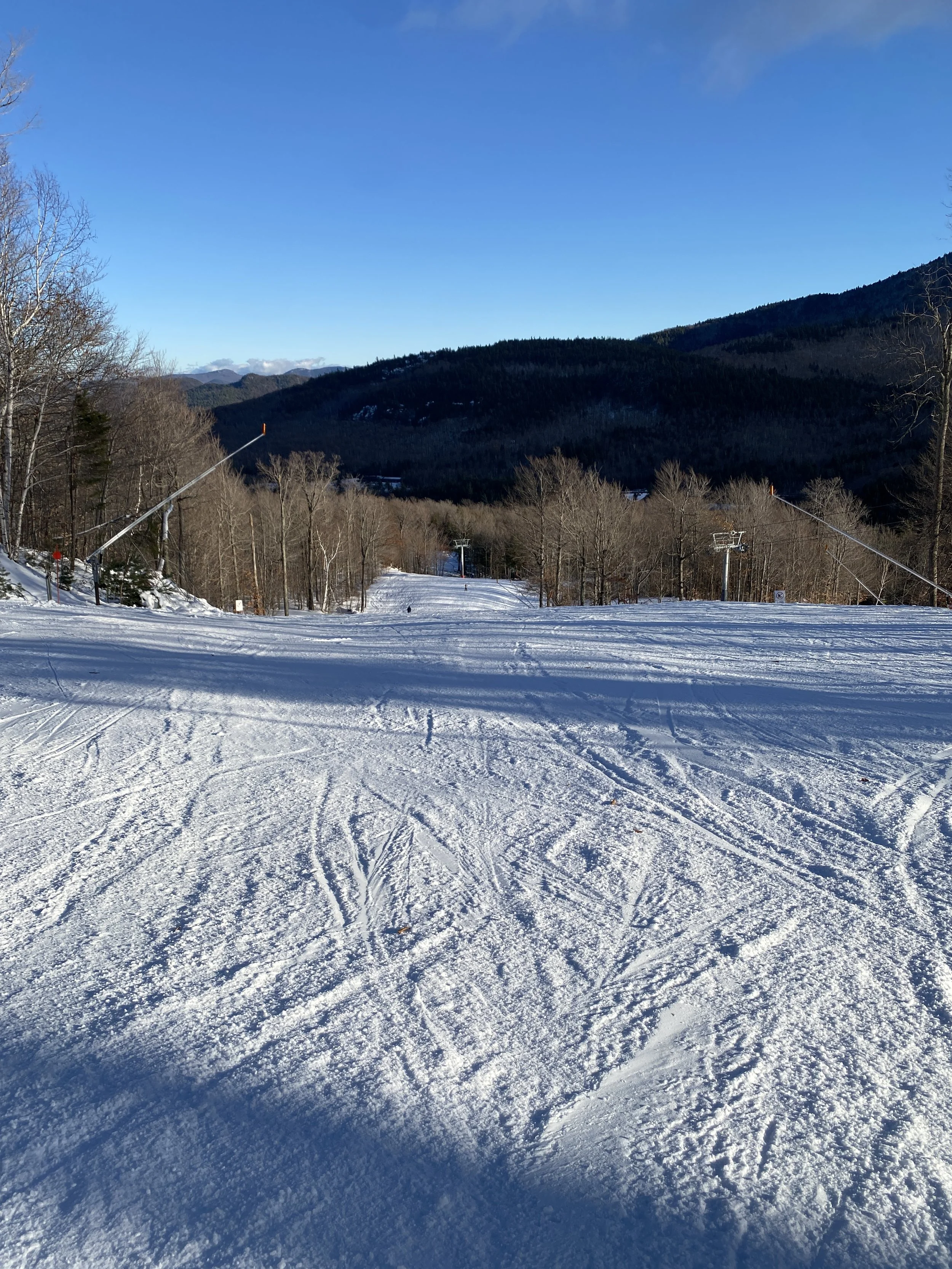 The snow was pretty good, too. Across the mountain, it was a mix of packed powder and some firm spots here and there. The edges had plenty of snow to play in. They were spinning the gondola and the Summit Quad, which, combined, provided access to a total of 14 runs. Of the group, I found the snow on Paron’s Run to be the best. It was a dream to ski. I also really enjoyed the left edge of Essex, which is the only black diamond terrain open on the mountain right now.