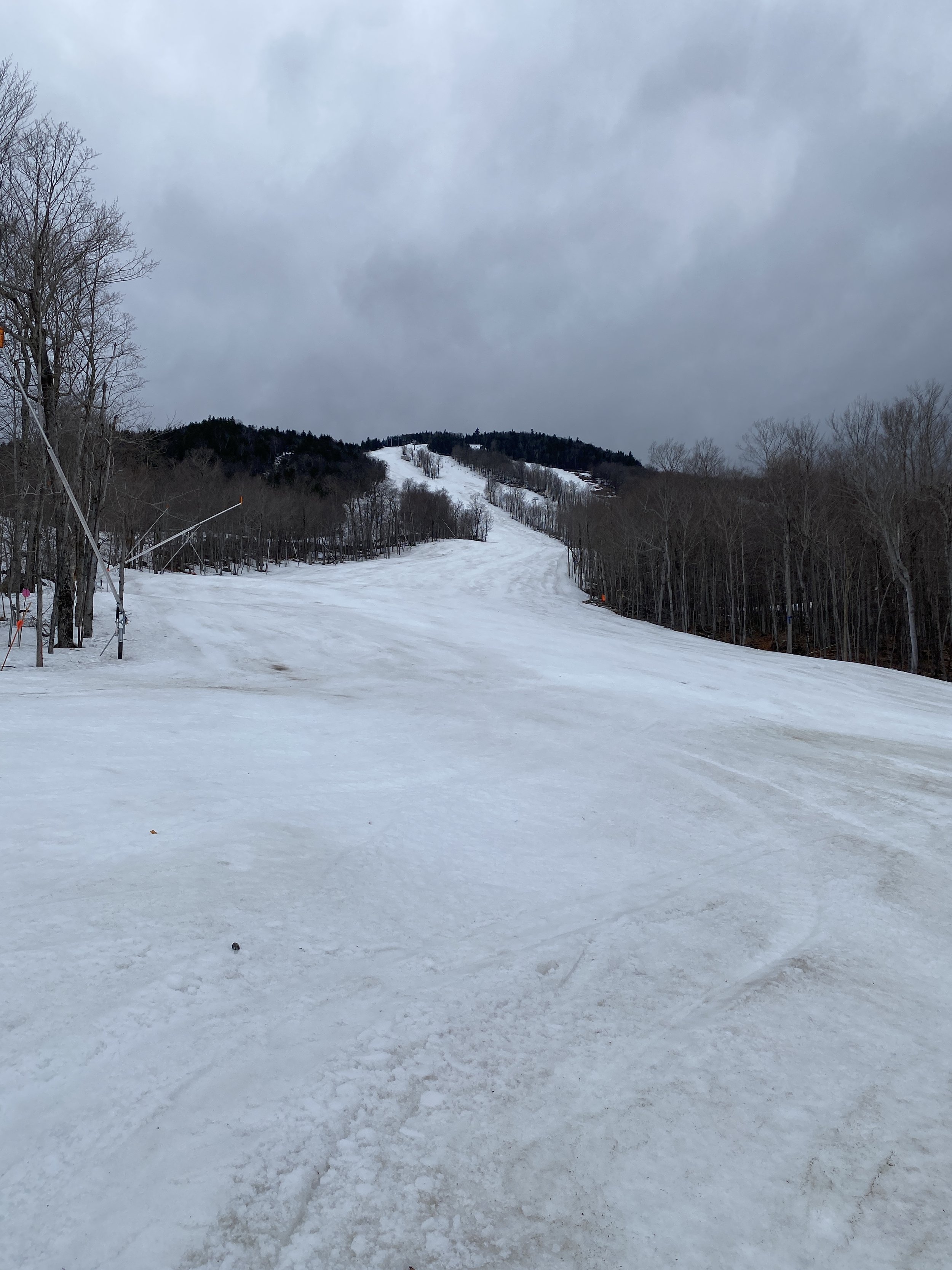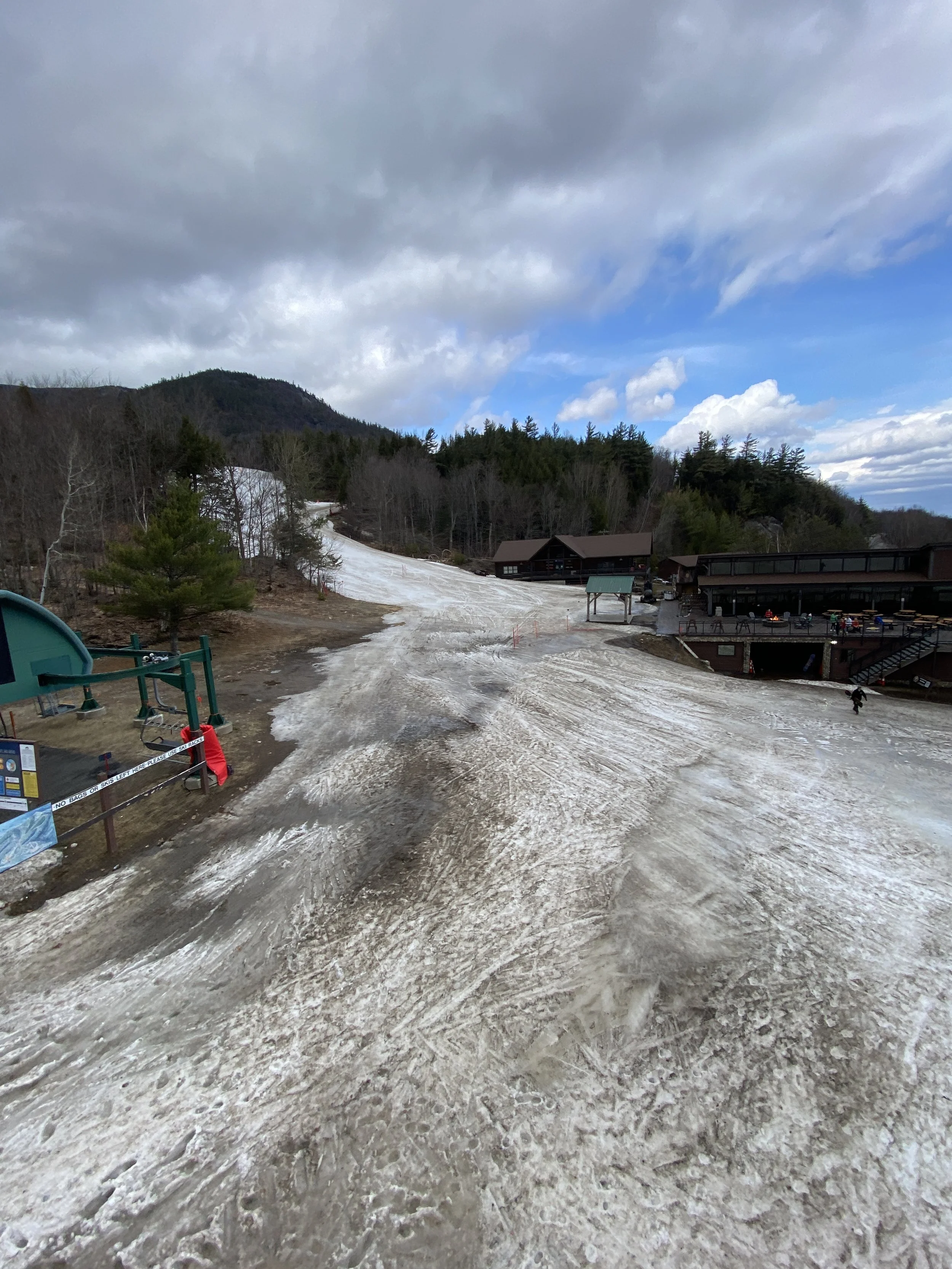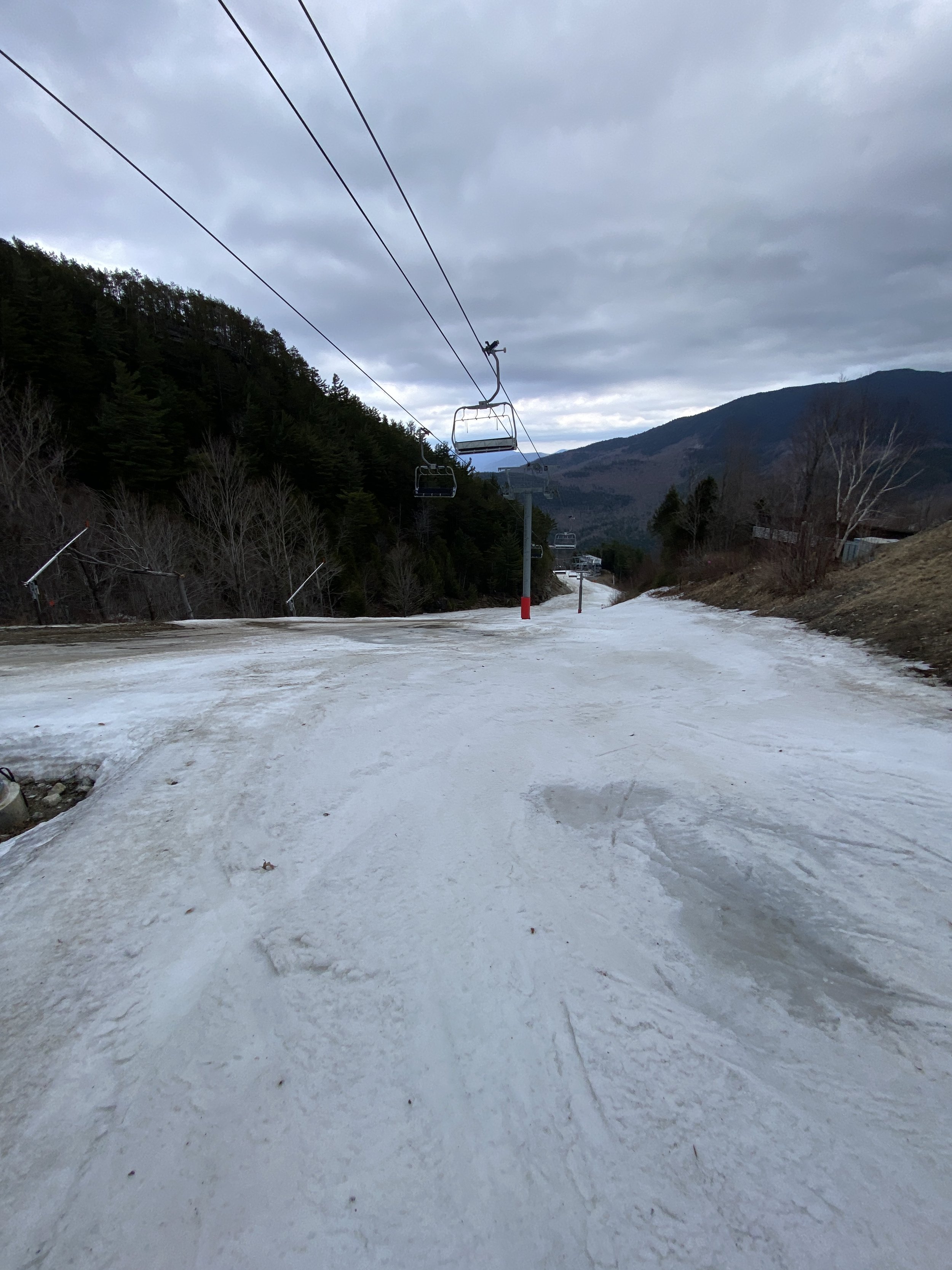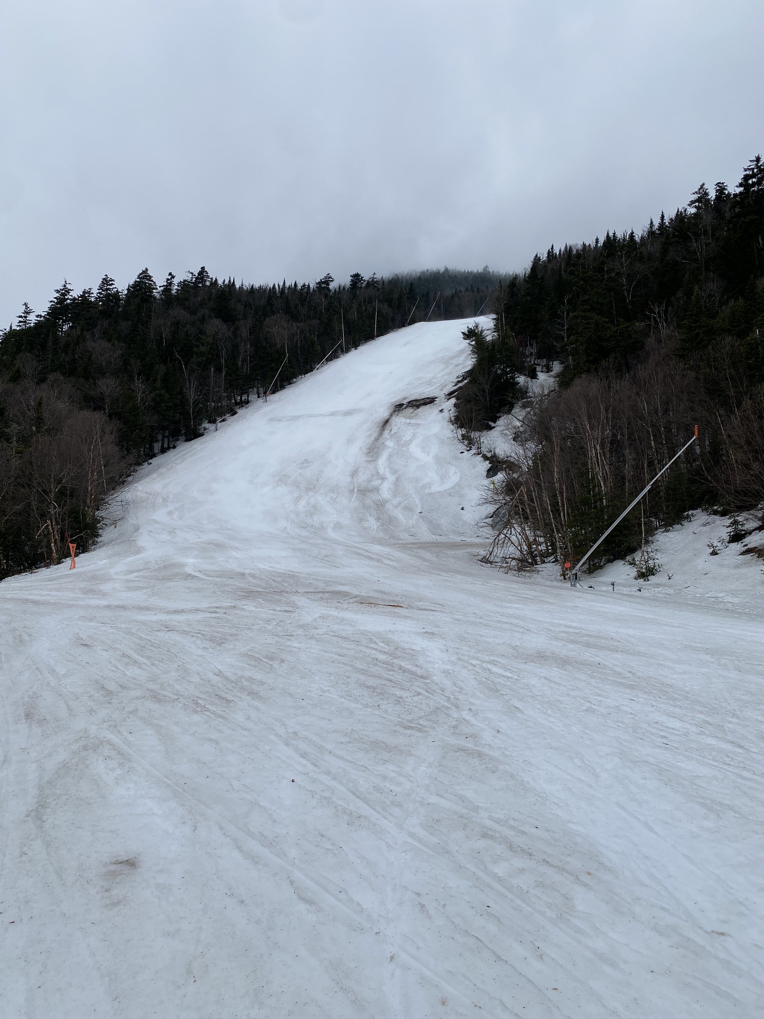 While the top layer of snow was soft, with cloudy skies, the secondary layer of snow was surprisingly firm in a lot of places up high, and there were even a couple of patches of blue ice out there. East Coast ice is tough like that. It won’t go down without a fight! As you descended the mountain, the firmness gave way to more typical spring conditions, and at the base there were areas where you were skimming through water to get to the gondola.