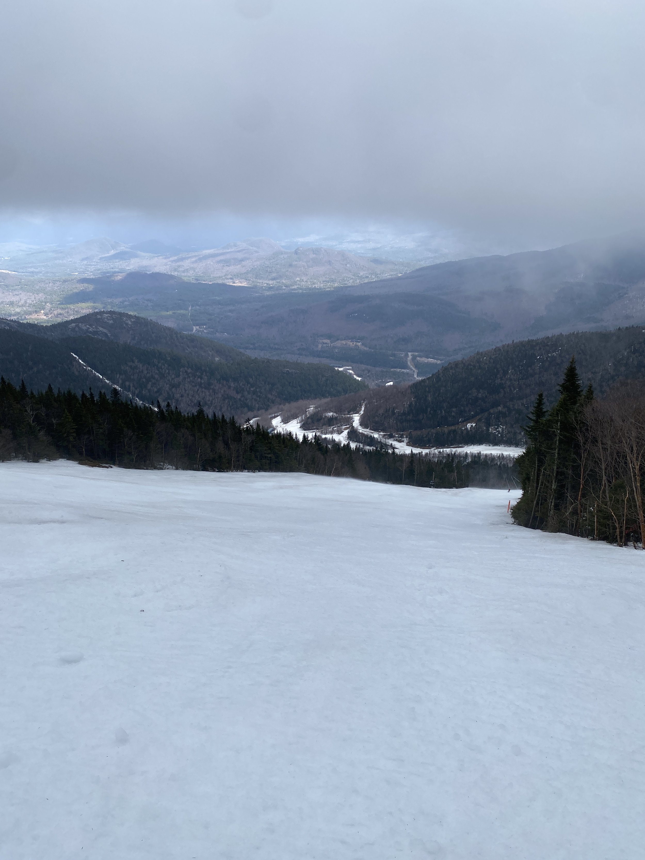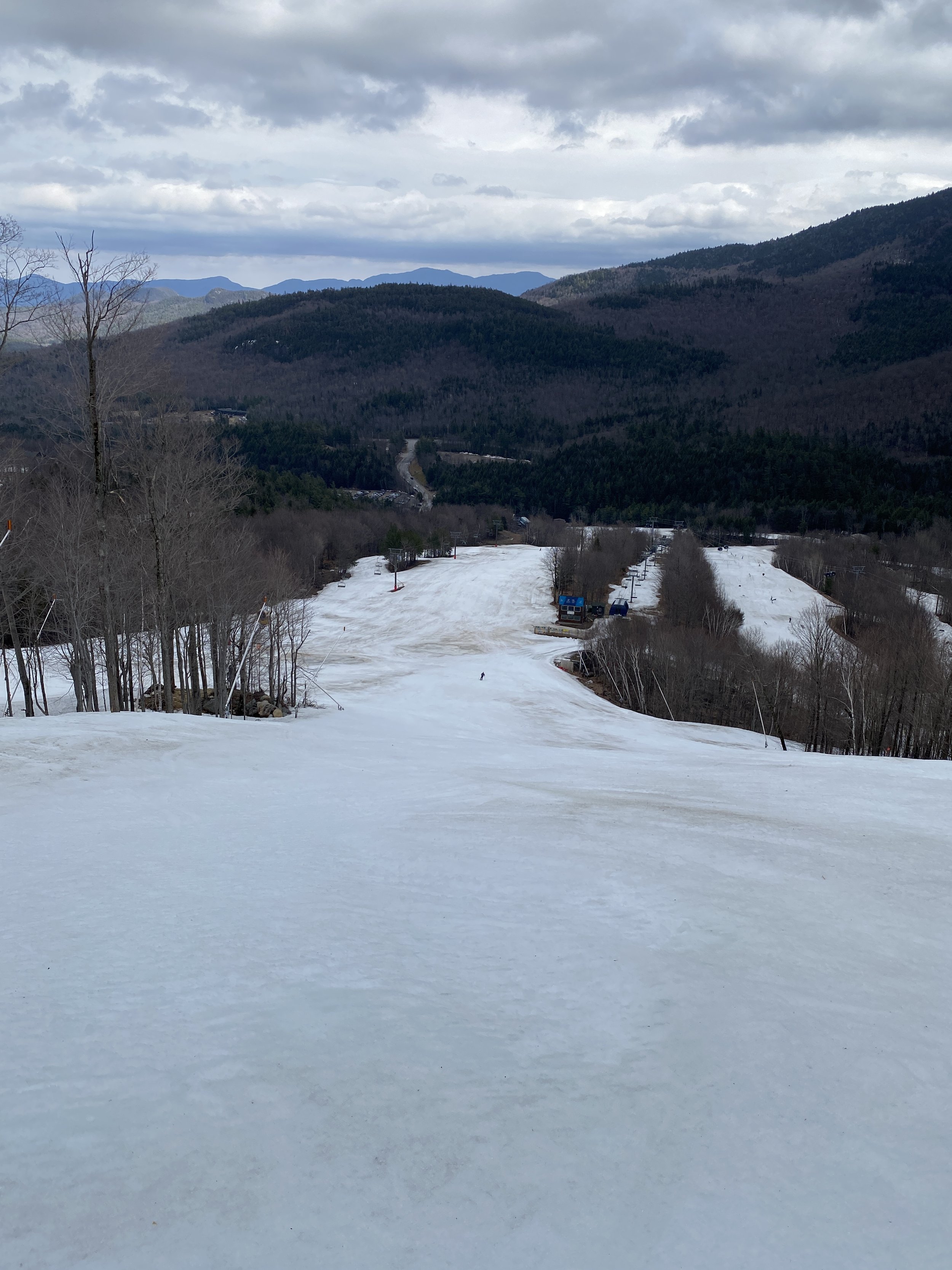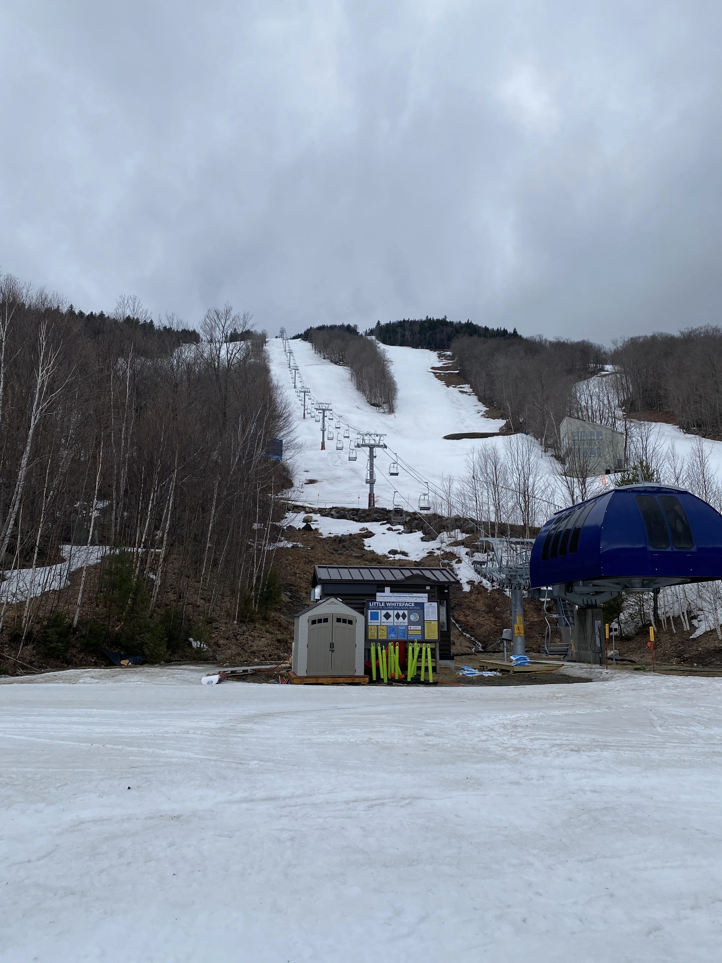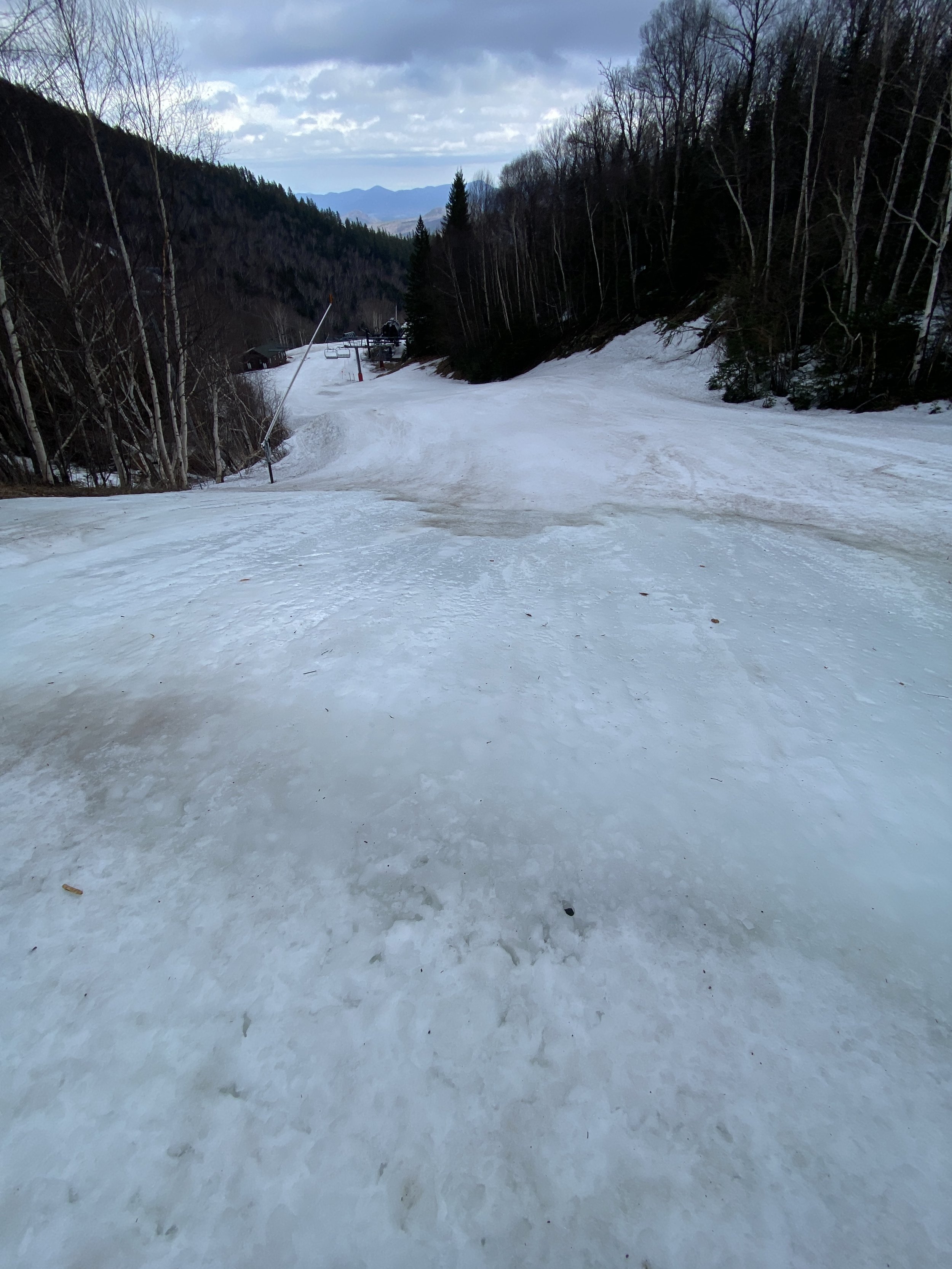 While the top layer of snow was soft, with cloudy skies, the secondary layer of snow was surprisingly firm in a lot of places up high, and there were even a couple of patches of blue ice out there. East Coast ice is tough like that. It won’t go down without a fight! As you descended the mountain, the firmness gave way to more typical spring conditions, and at the base there were areas where you were skimming through water to get to the gondola.