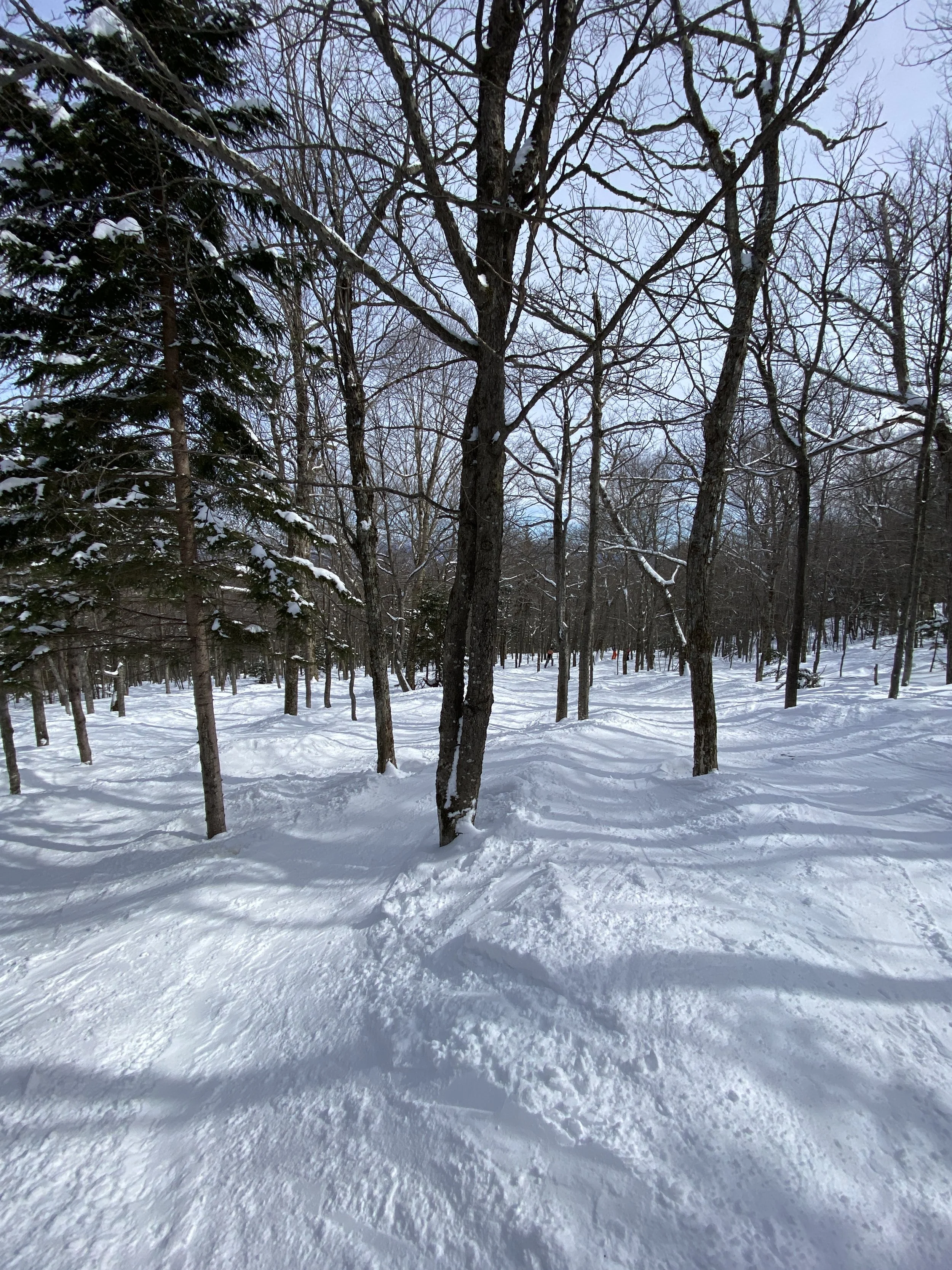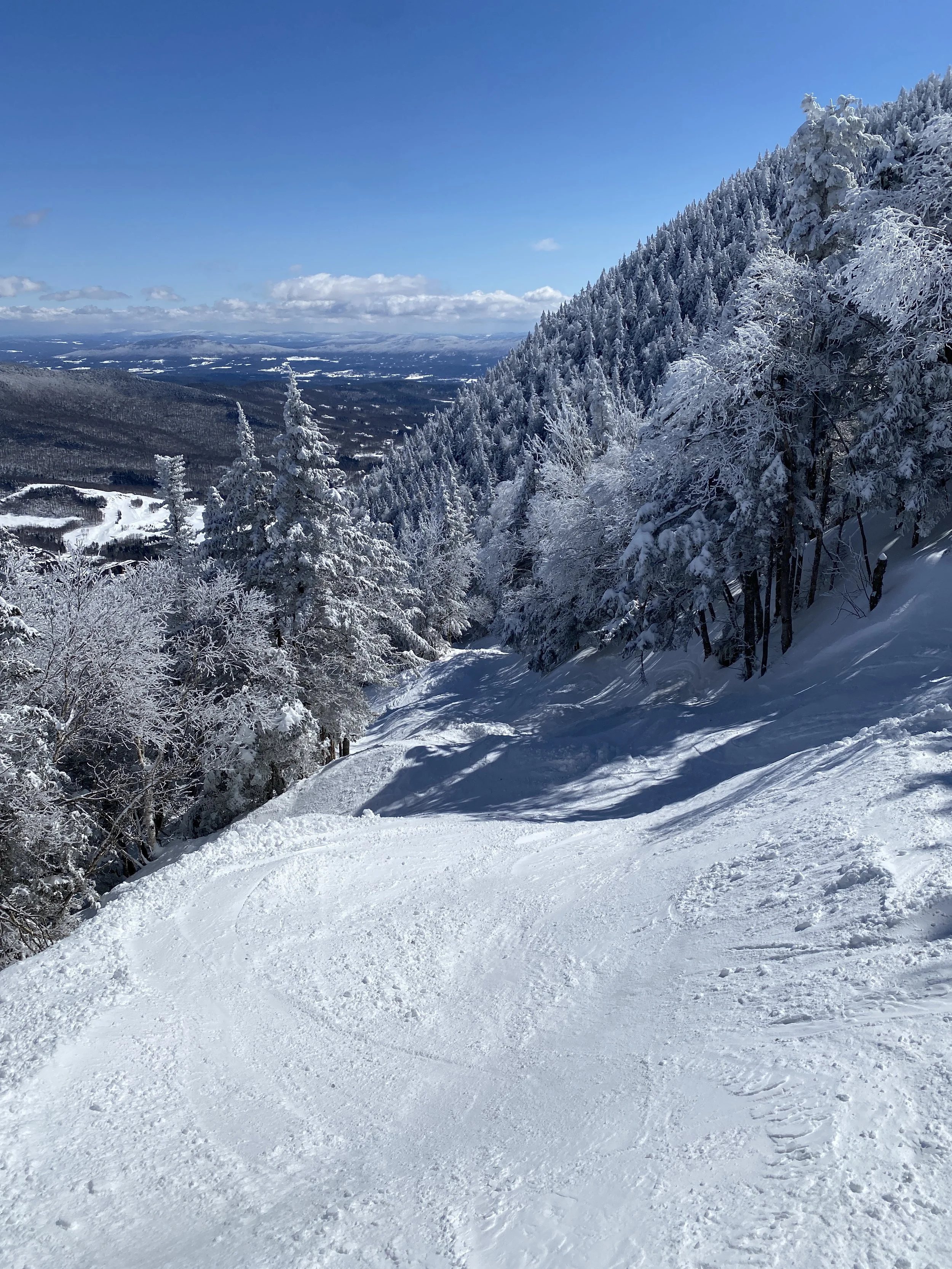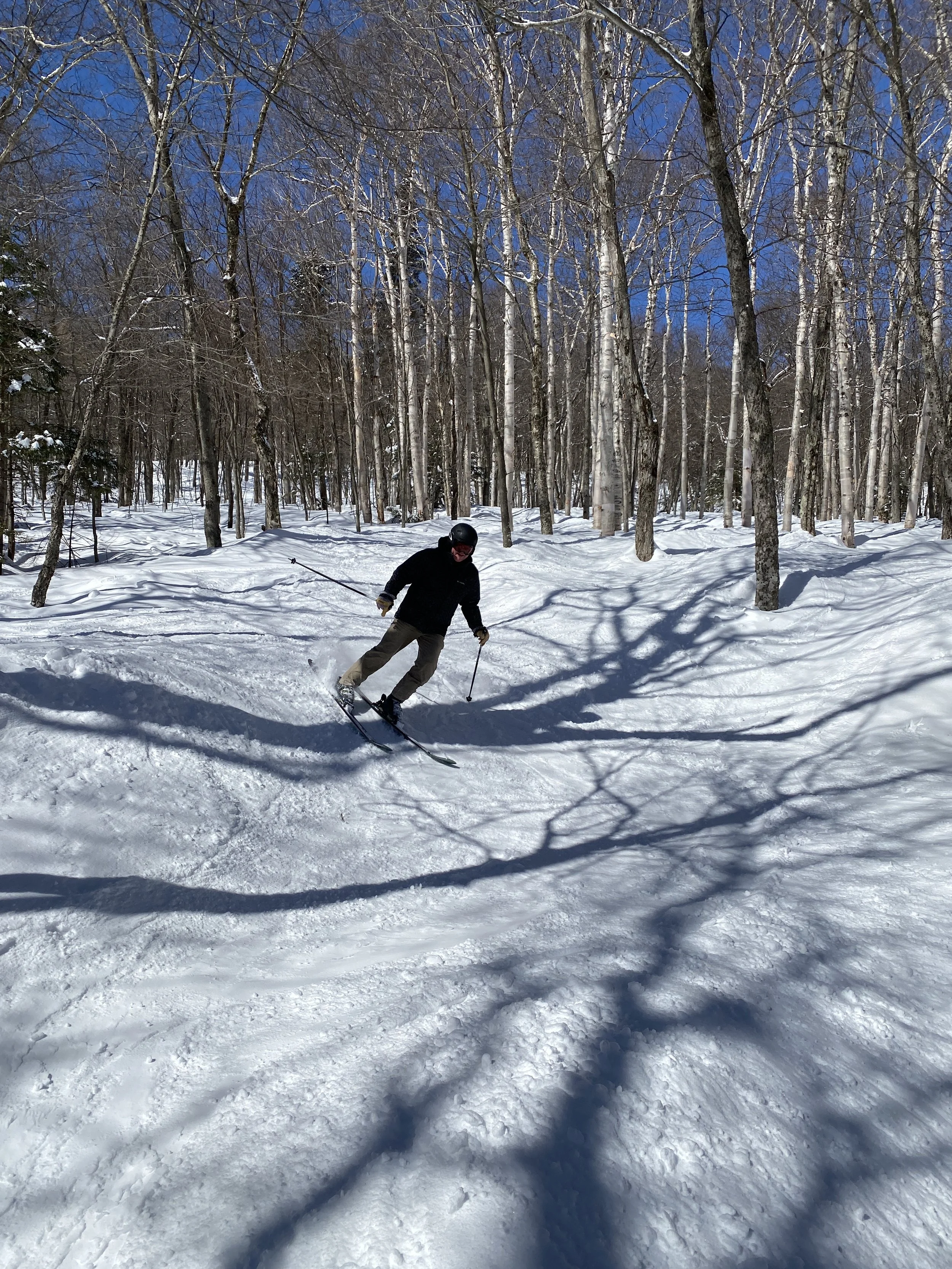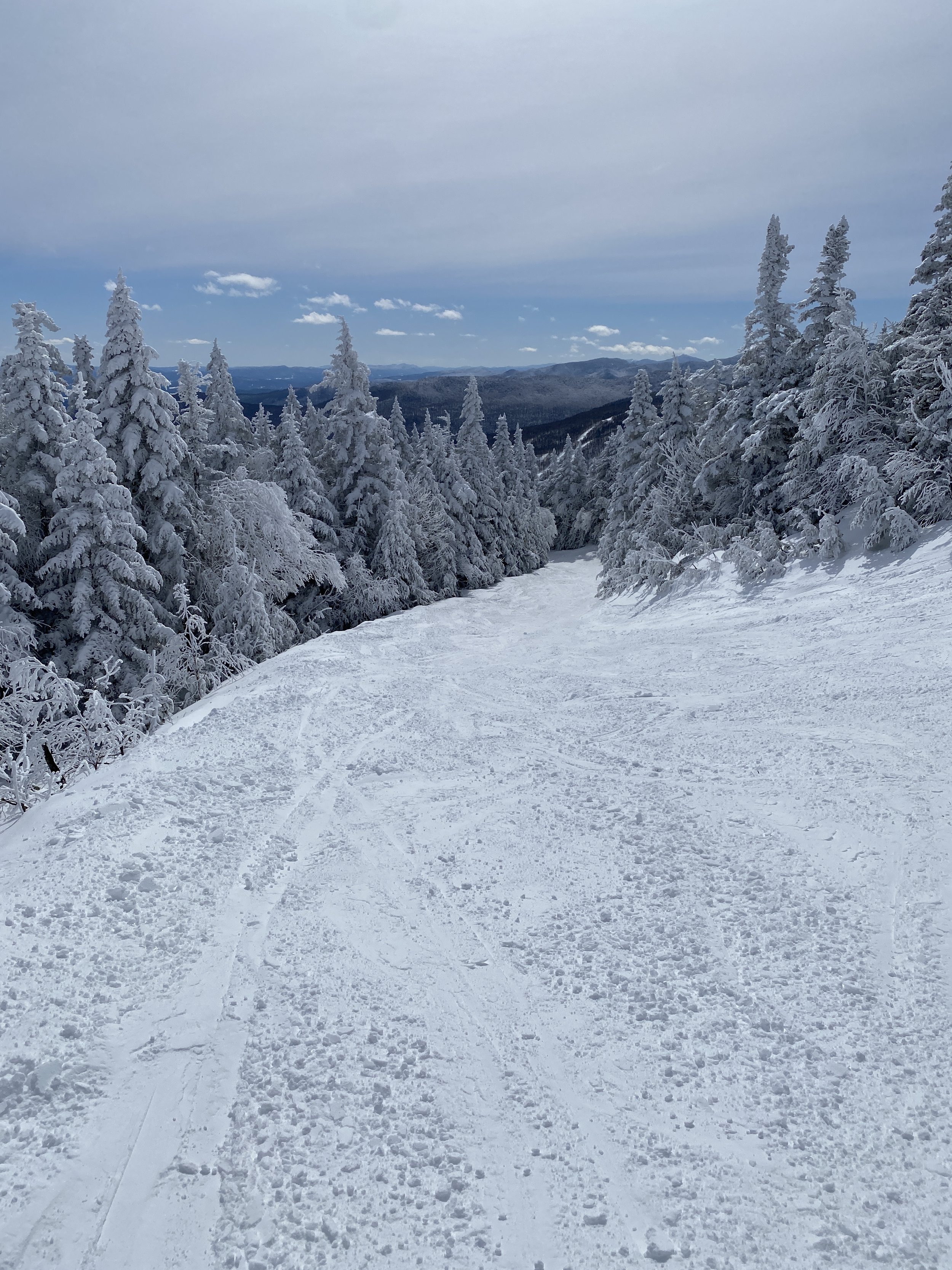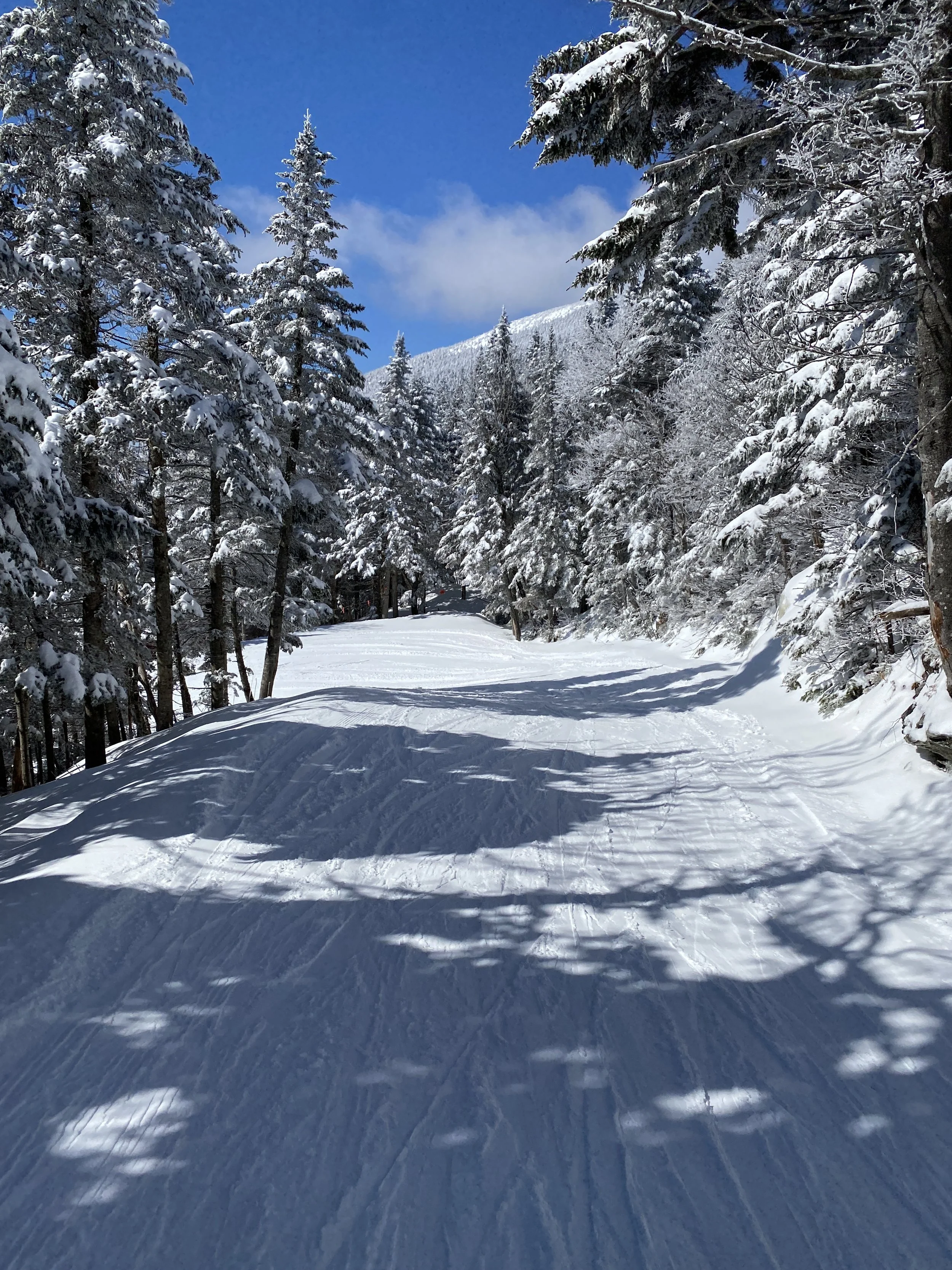 At Spruce Peak, we headed straight to the Sensation Quad. We skied Main Street in full and Smugglers in full, before getting a couple of laps in off the Sunny Spruce Quad. Of those two runs off the Sensation Quad, Upper Smugglers and Smugglers were probably my favorite today. These are classic narrow New England runs, and I believe they’re natural snow only, so they just ski a certain way that I really enjoy. Part of Main Street is used for racing, and it was fun, but the snow on it was a bit springy and it skied slower as a result.