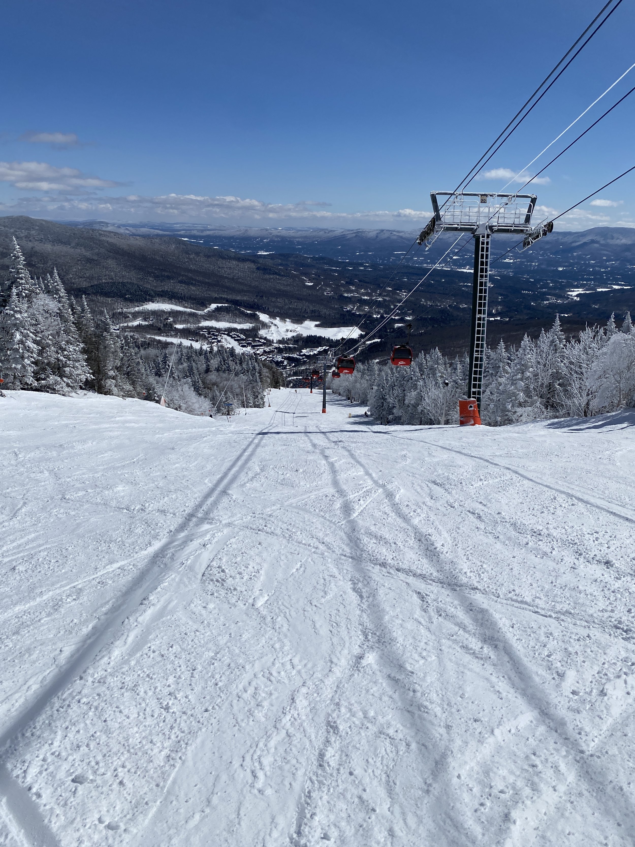 At some point, we decided to head to the gondola. We proceeded to ski Gondolier before heading over to Spruce Peak. I really enjoy Gondolier, because you ski under the gondola for most of the run and it’s just an interesting view as you’re skiing down. The run was a ton of fun today with how great the conditions were.
