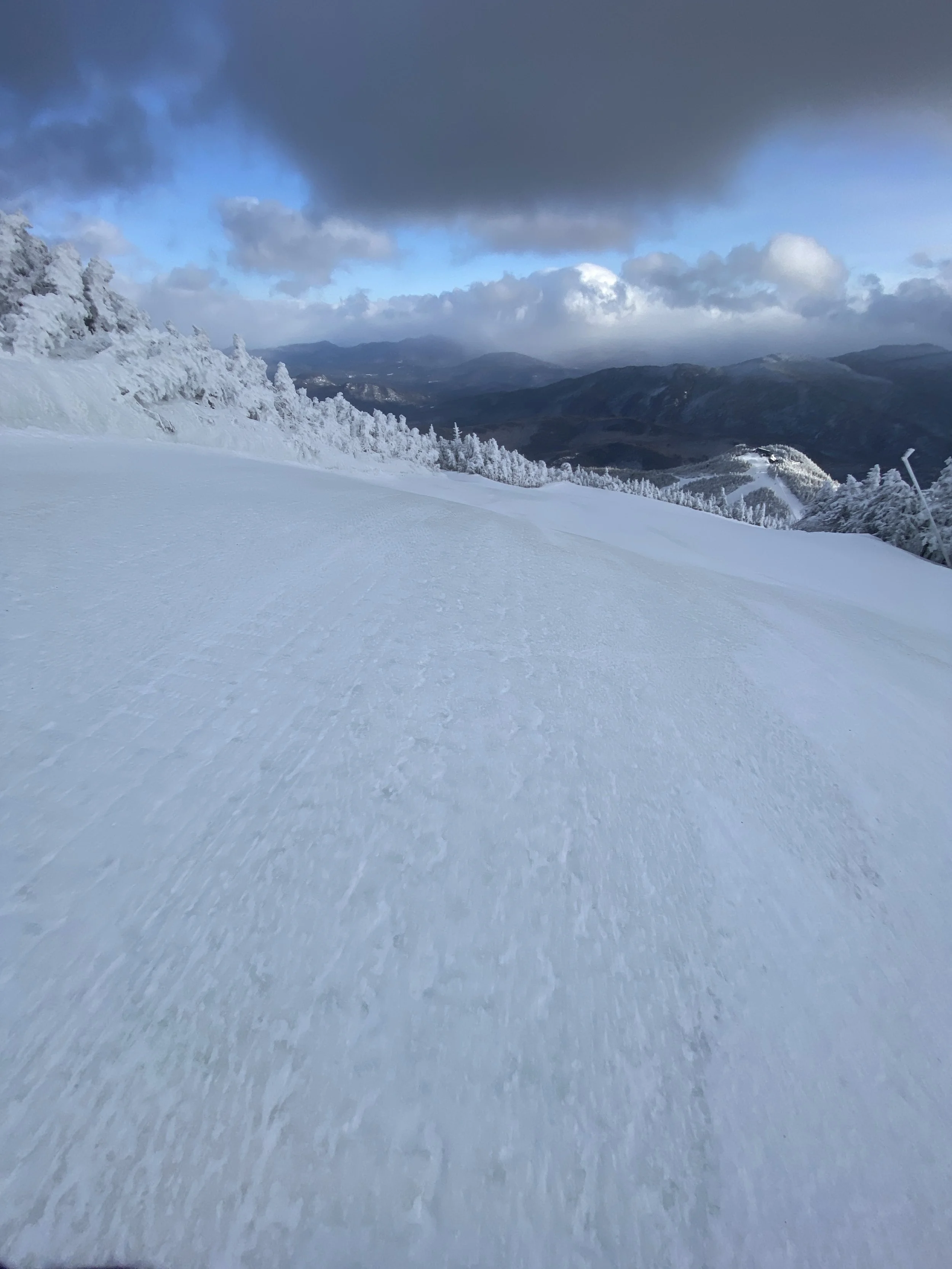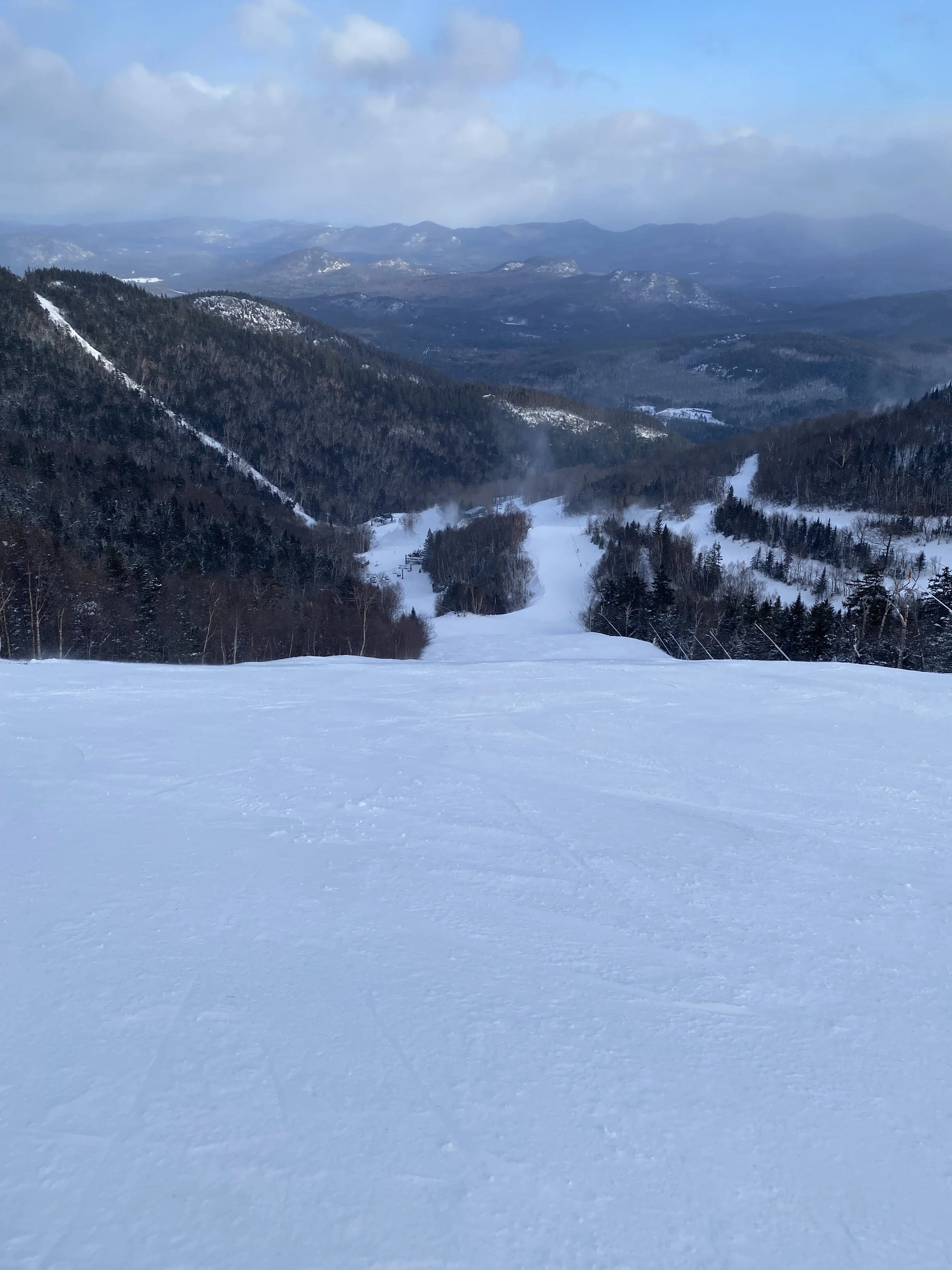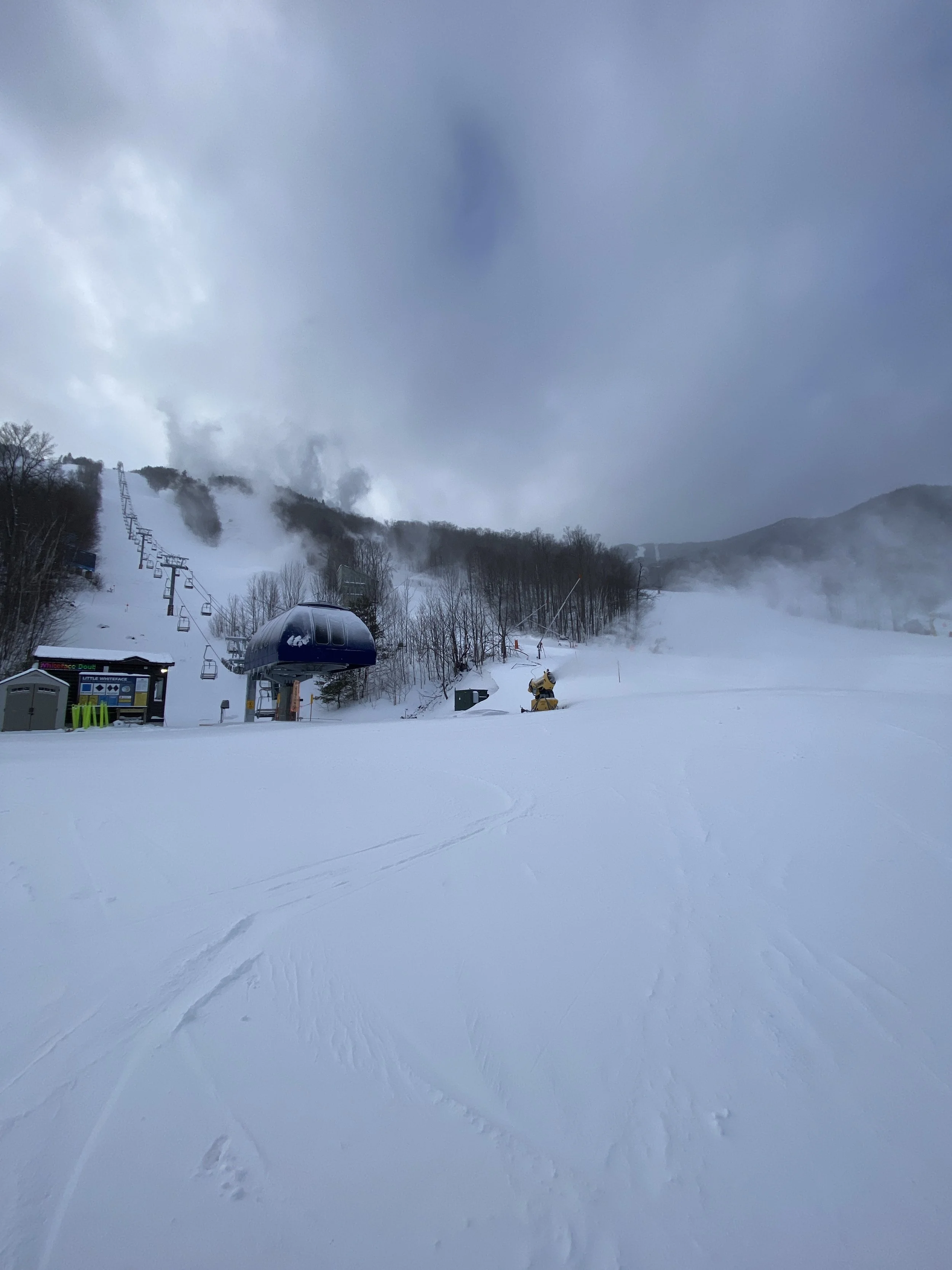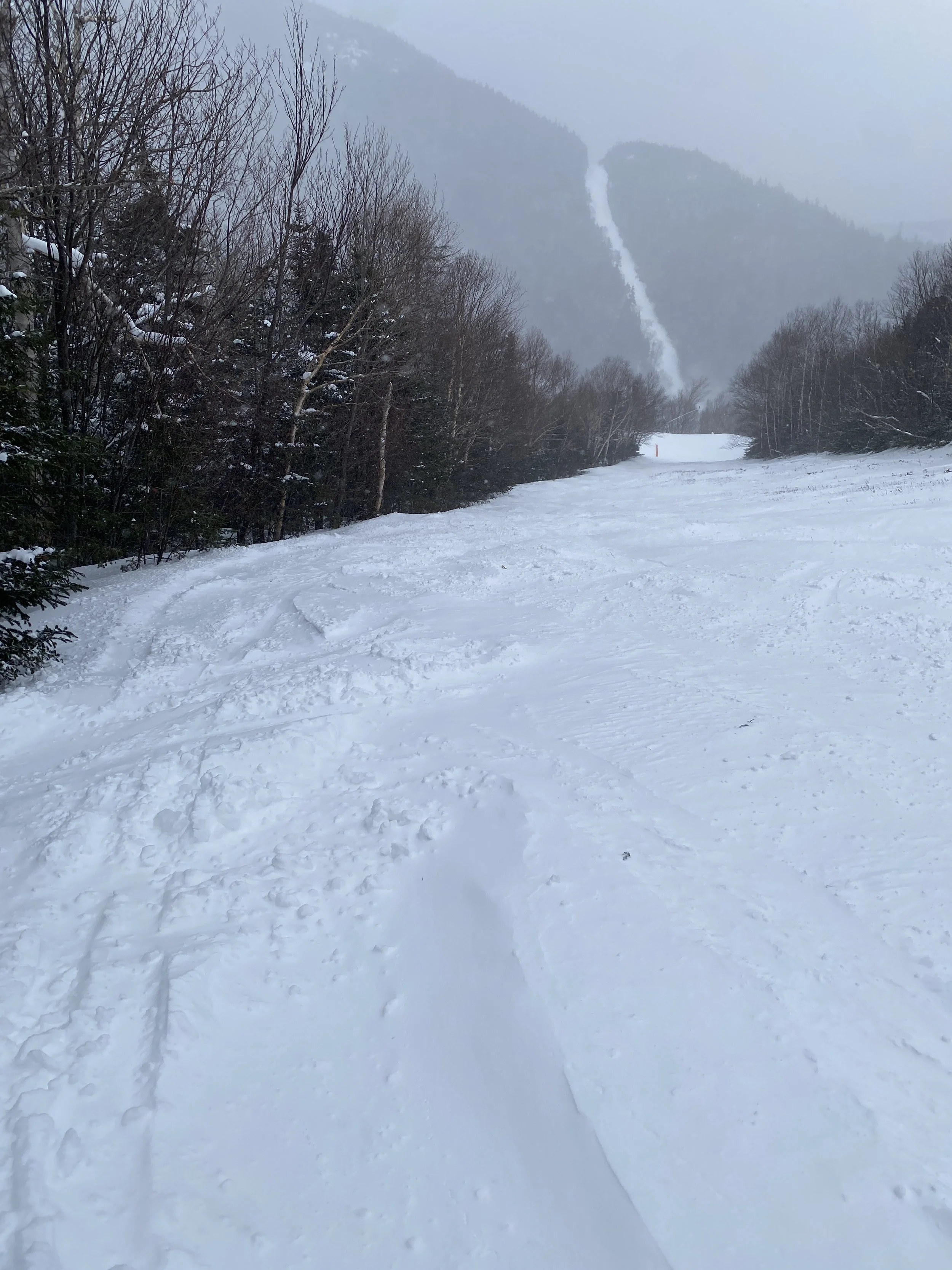 They had all but the Little Whiteface double spinning. There were more than 80 runs and glades open, and they received two to four inches of fresh snow overnight. Despite the new snow, though, it was fairly windy, and you could find some firm spots and ice patches here and there. Upper Skyward was even closed, presumably due to firm conditions. That being said, I’d say the conditions were mostly packed powder, with wind-blown powder in the mix in random spots and along the edges. Some runs were firmer, like Paron’s Run, and others were nice and soft, like Excelsior, the left side of Victoria and the top part of Upper Parkway.