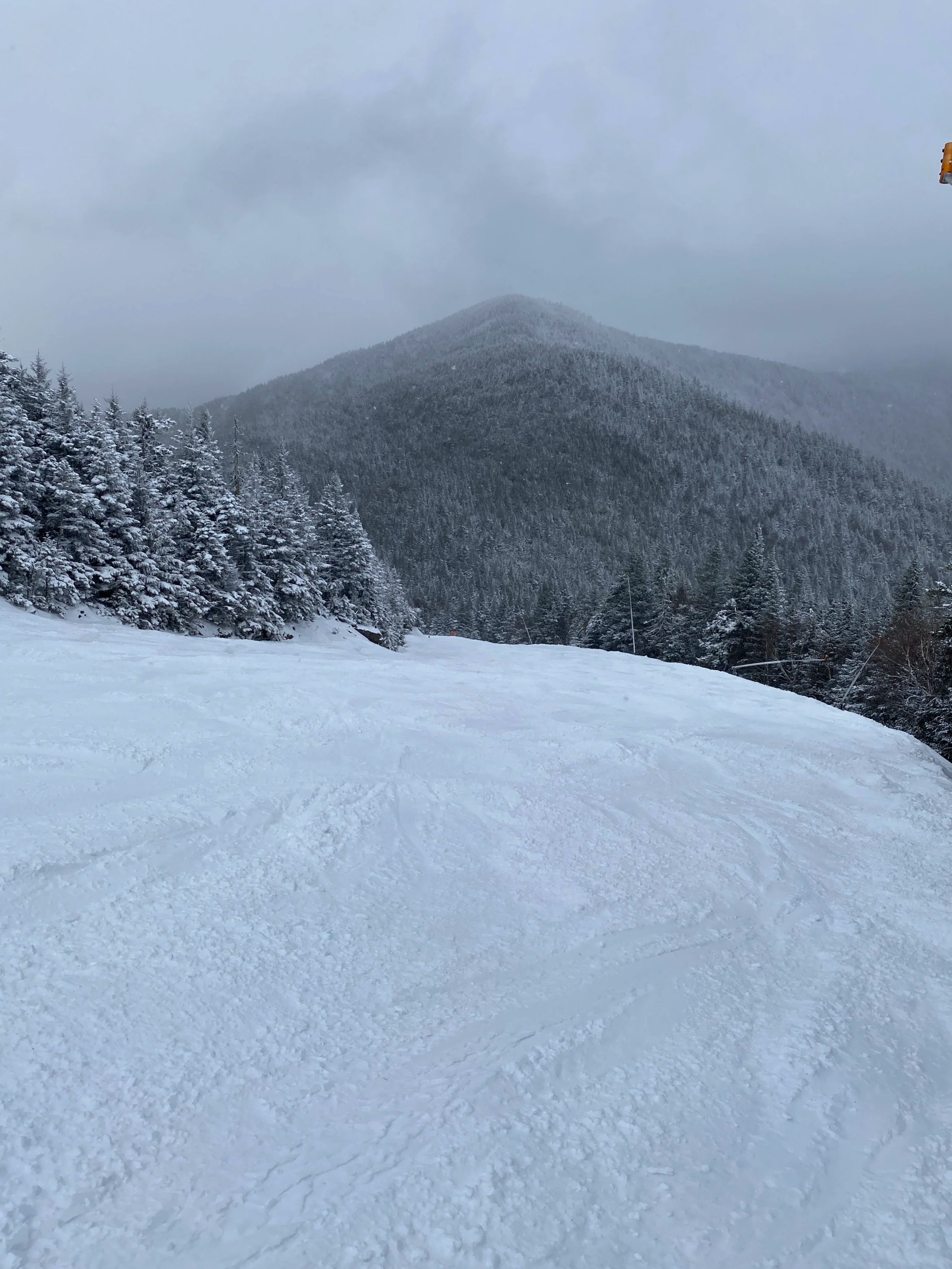 Around 1:30, I decided to head over to Sterling Mountain to see if Highlander Glade had opened. Highlander Glade is fairly high up on Sterling Mountain, and it’s one of the first glades at Smuggler’s Notch to open each year, in my experience, so I know it’s prone to have snow when others may not. Anyways, my first run of the day was off Sterling, and it wasn’t open then, but coverage looked good from the lift, so I assumed it was closed due to firm conditions.