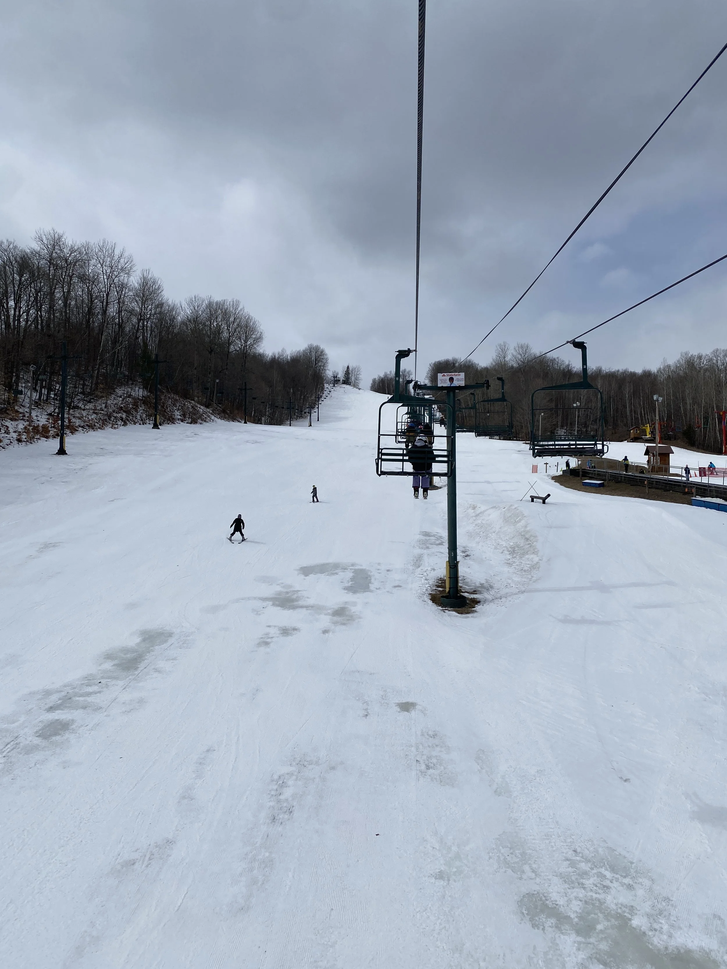 With it being the last day of the season, they had 14 of 54 runs open, all of which were in the lower and middle mountain. Upper was not open today. They had four lifts spinning, including a beginner lift and a magic carpet. It was a winter-like day, with temperatures in the 20s, and there was snow in the air at times.