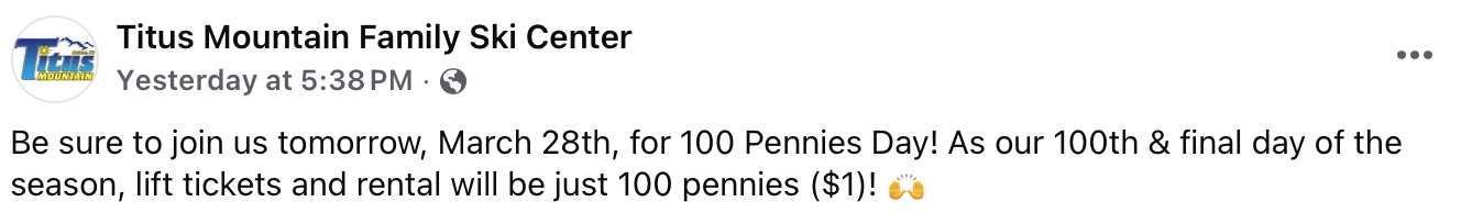 Today was the 100th day of the ski season for Titus Mountain in northern New York. It was also their last day of the season. To celebrate hitting triple digit ski days, yesterday they announced that lift tickets today would cost just 100 pennies or $1. That’s right. A lift ticket today was only a dollar.
