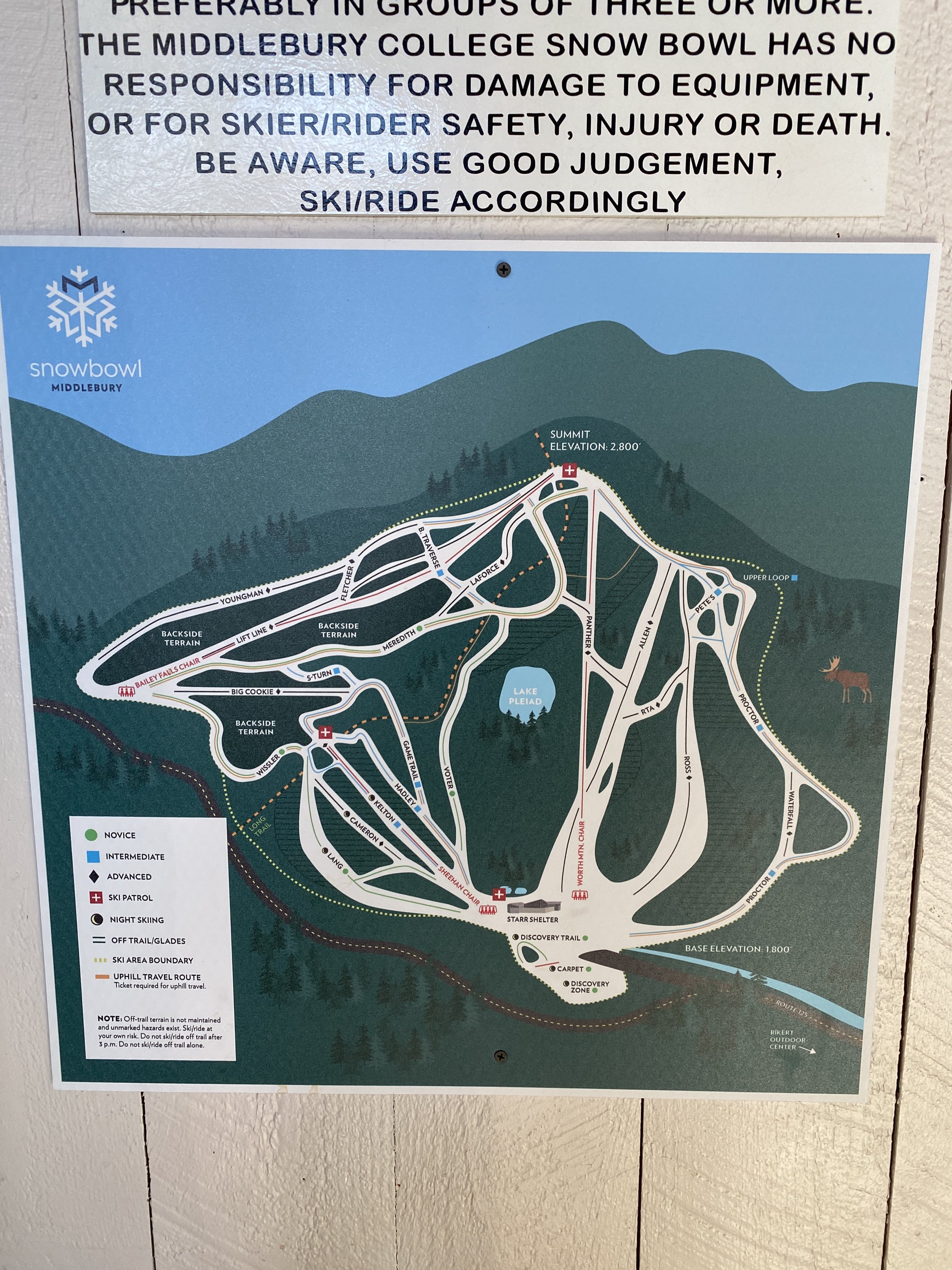 Admittedly, I didn’t know much about Middlebury Snowbowl going into the ski day, aside from the fact it’s owned by Middlebury College, and it’s a smaller ski area. The mountain has a little more than a thousand feet of vertical, four lifts, and 28 runs. There are also a bunch of glades that are marked on the map, but they don’t appear to be named. More on the glades in a minute.