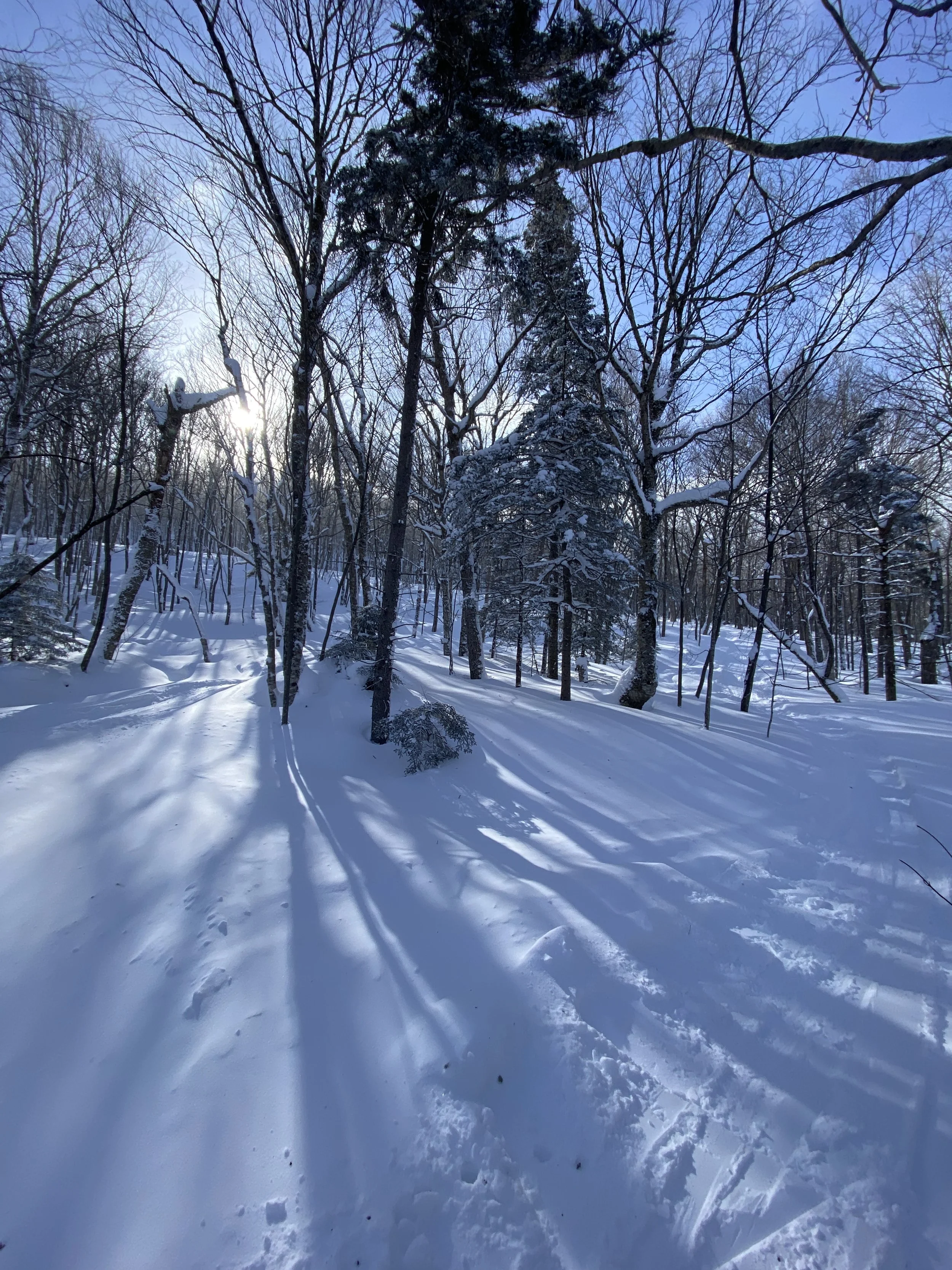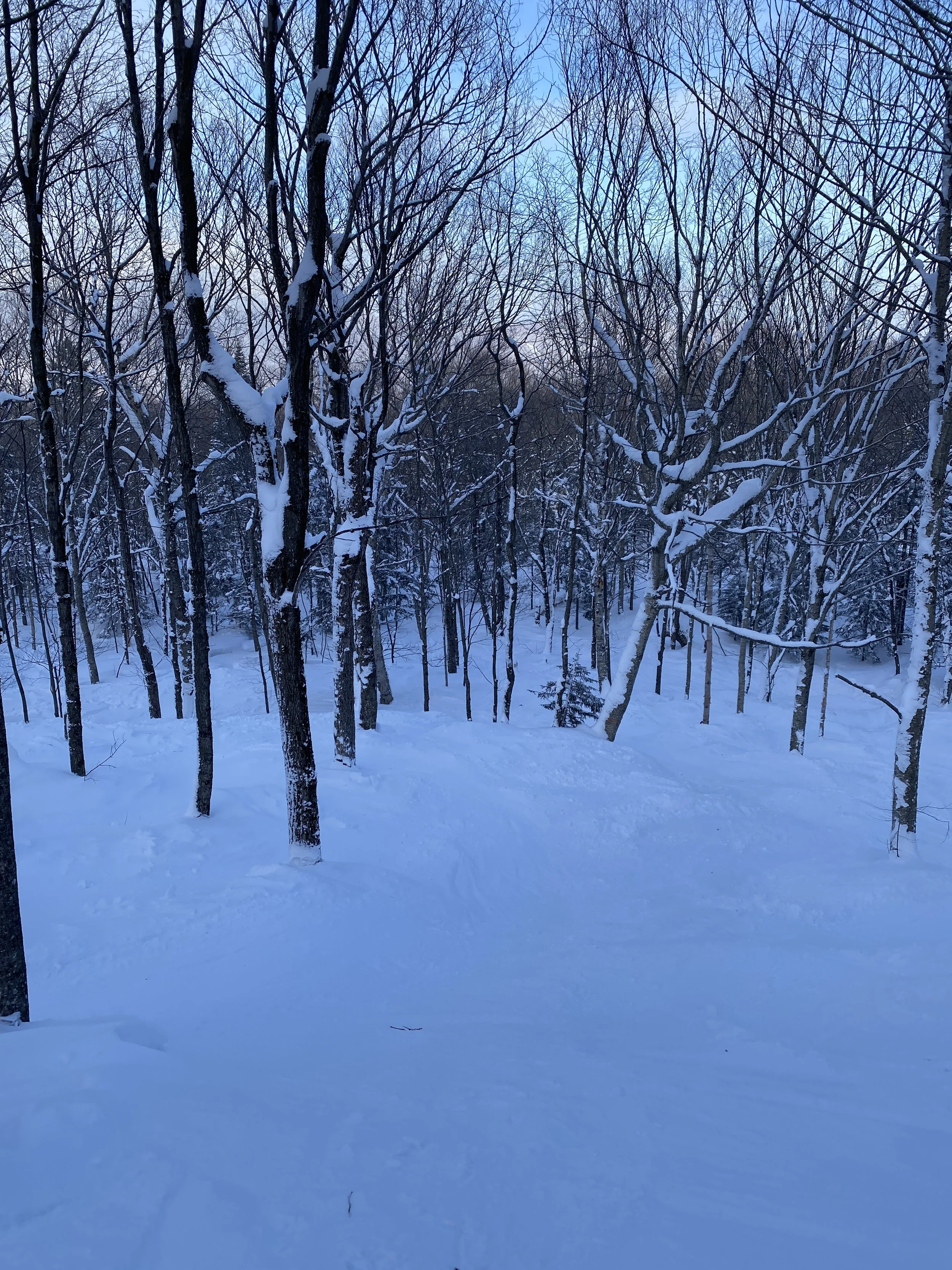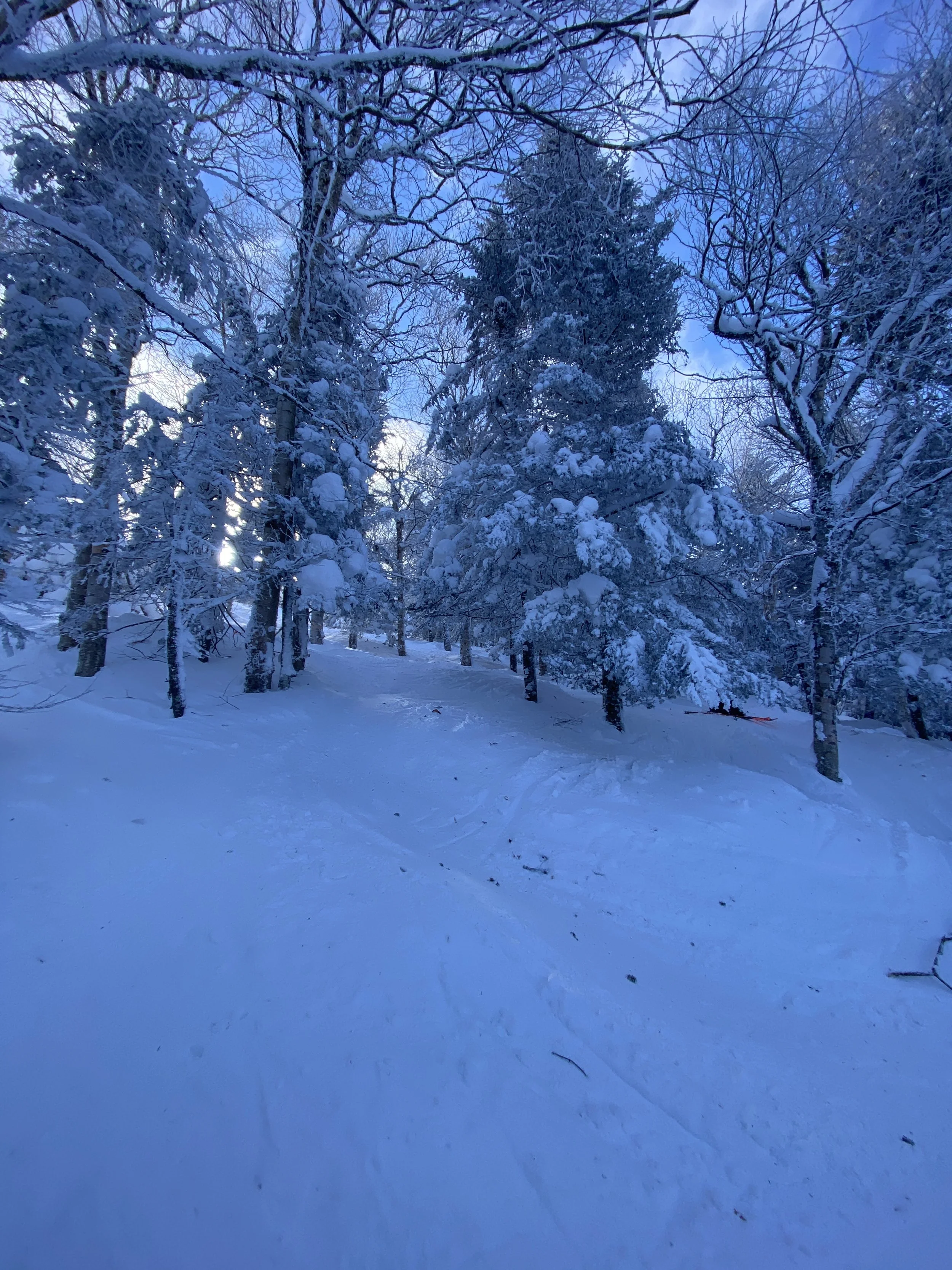 The cold ride on the Flyer was well worth it after seeing the snow in the woods. There was a storm at the start of this week that dropped a decent amount of snow across the region, and the snow was very light and fluffy, translating to lots of fluffy powder in the trees. To my surprise, some of the glades, like North Glade, weren’t all tracked out either. You could get fresh tracks in some areas if you wanted. That’s the wind I mentioned earlier working in the skiers favor! All this to say, conditions were excellent. I even found the few groomers I ended up on to be fun to carve down.