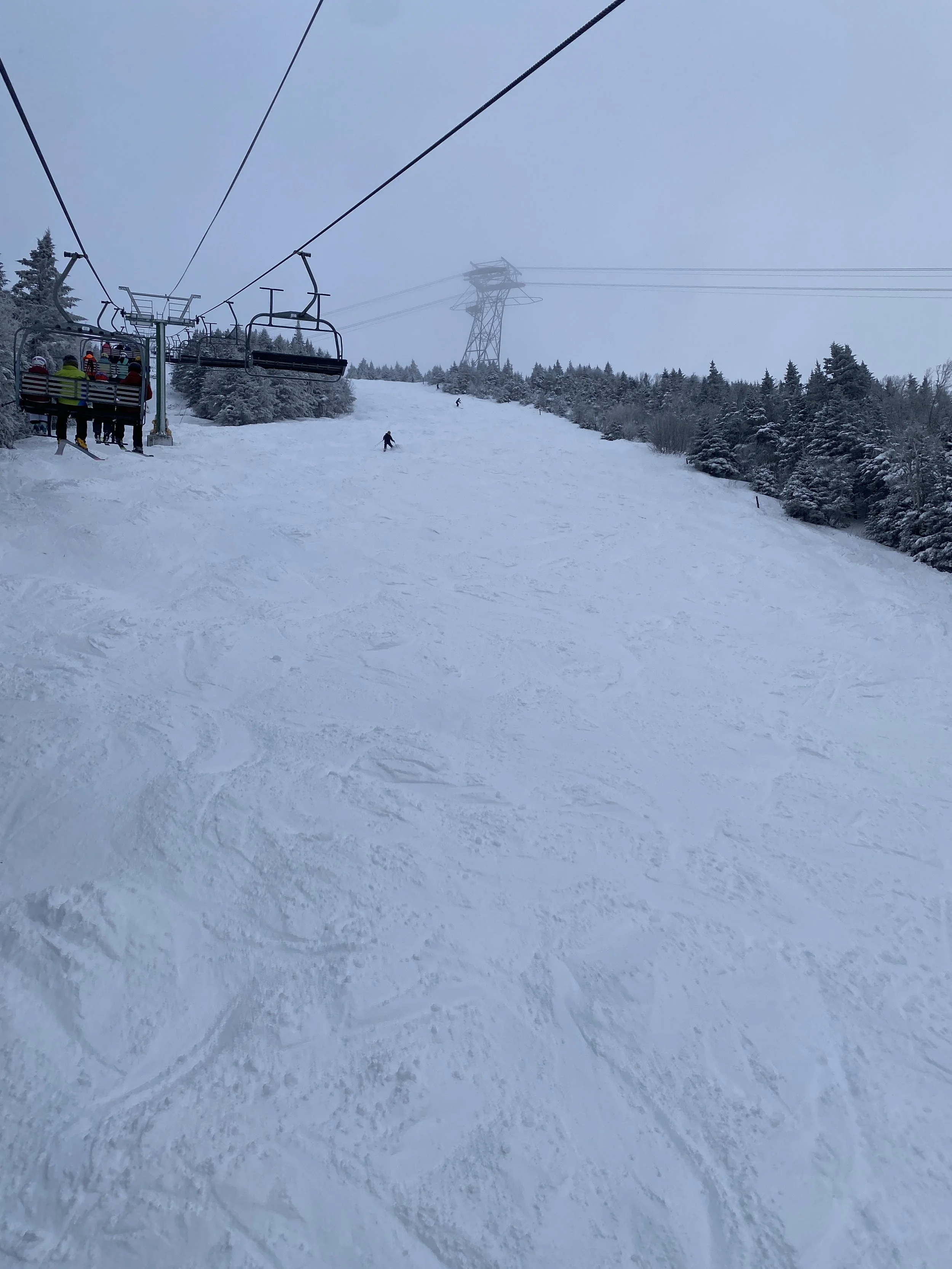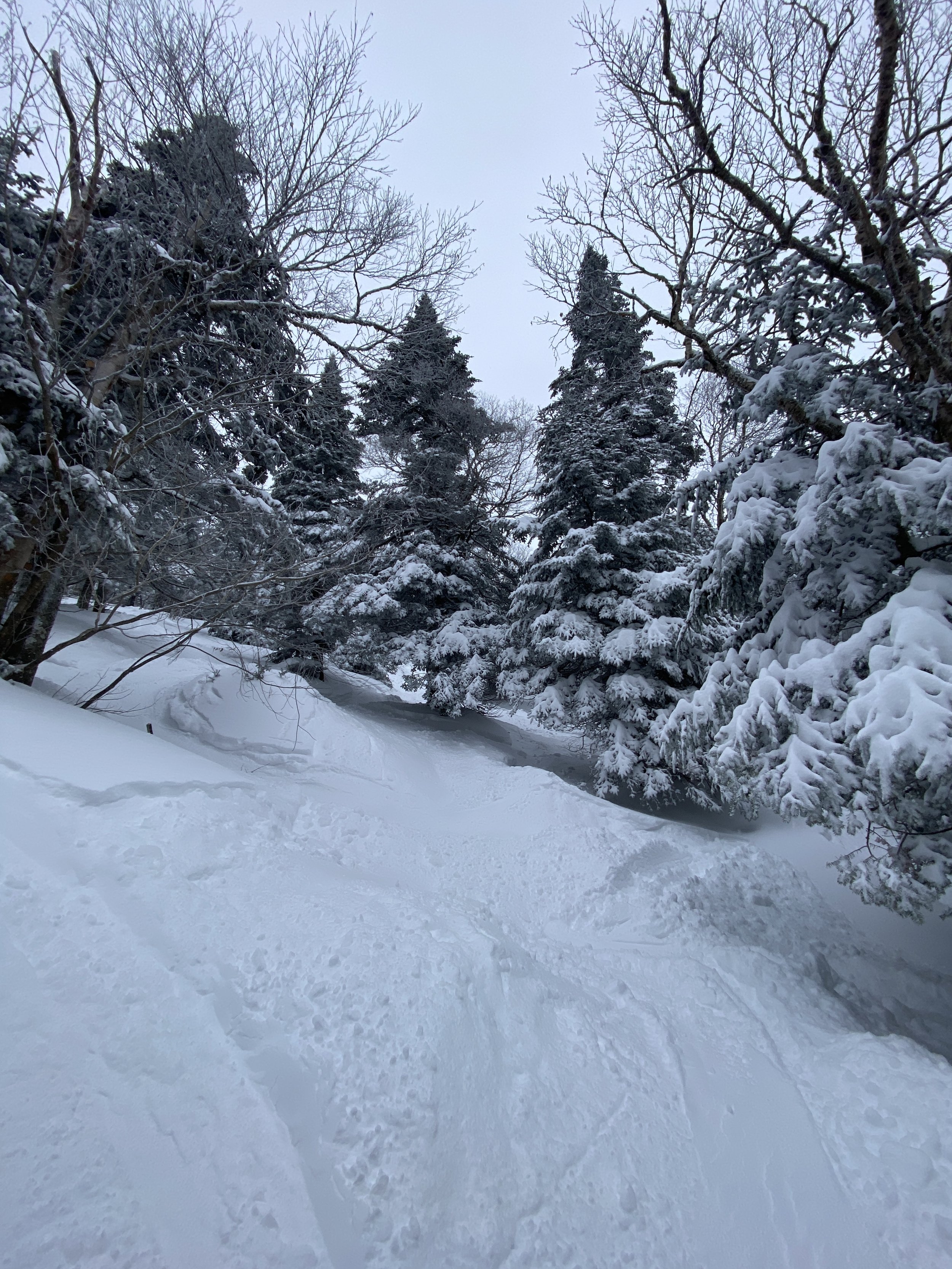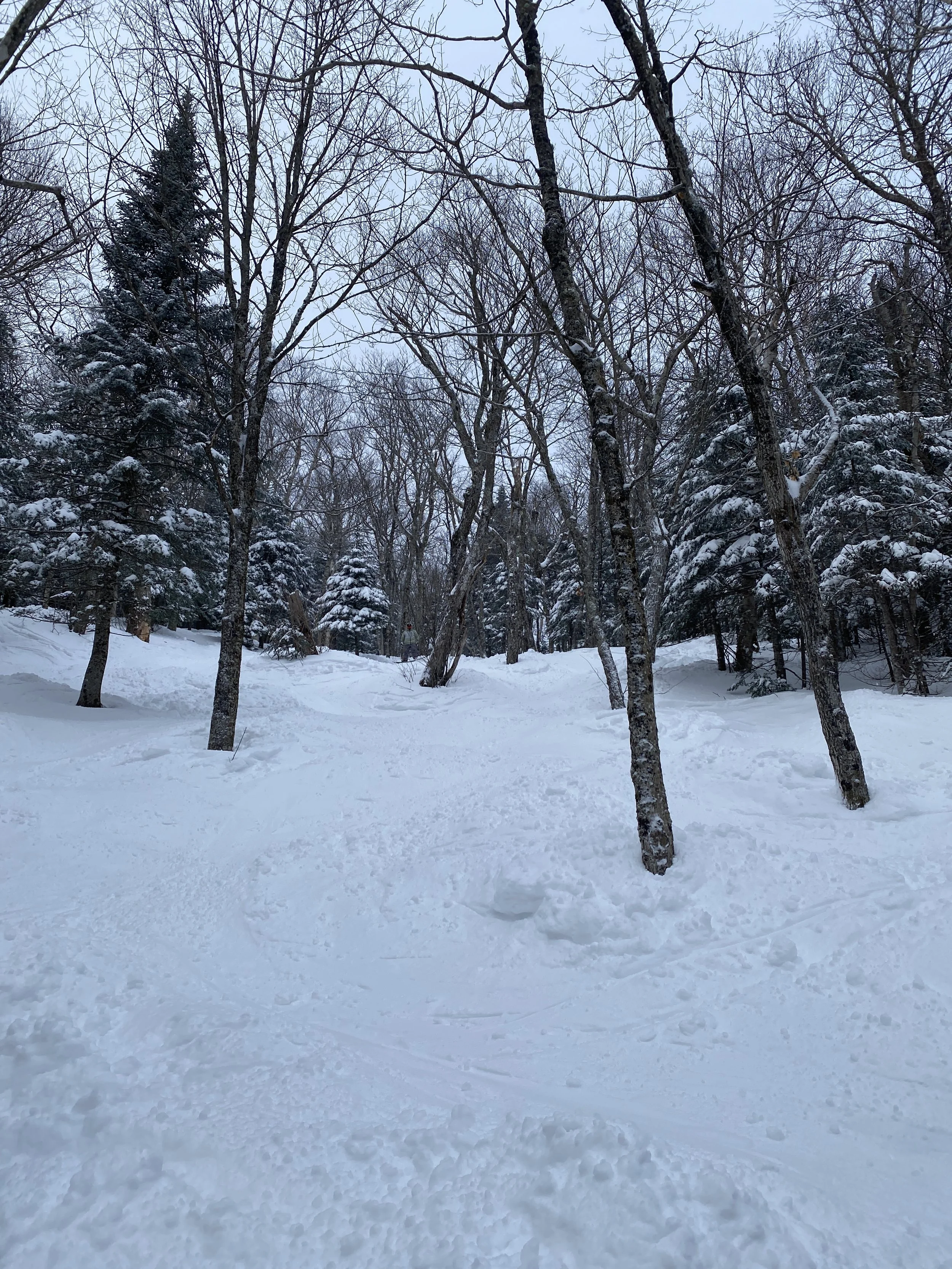 I spent most of my day skiing the trees, but I did ski some groomers and cut trails to reach the glades. Conditions everywhere were fantastic. It was essentially a powder day. Despite a little warm spell this week, Jay has received more snow since and it was actively snowing today, so all of the terrain was covered in quite a bit of light and fluffy snow.