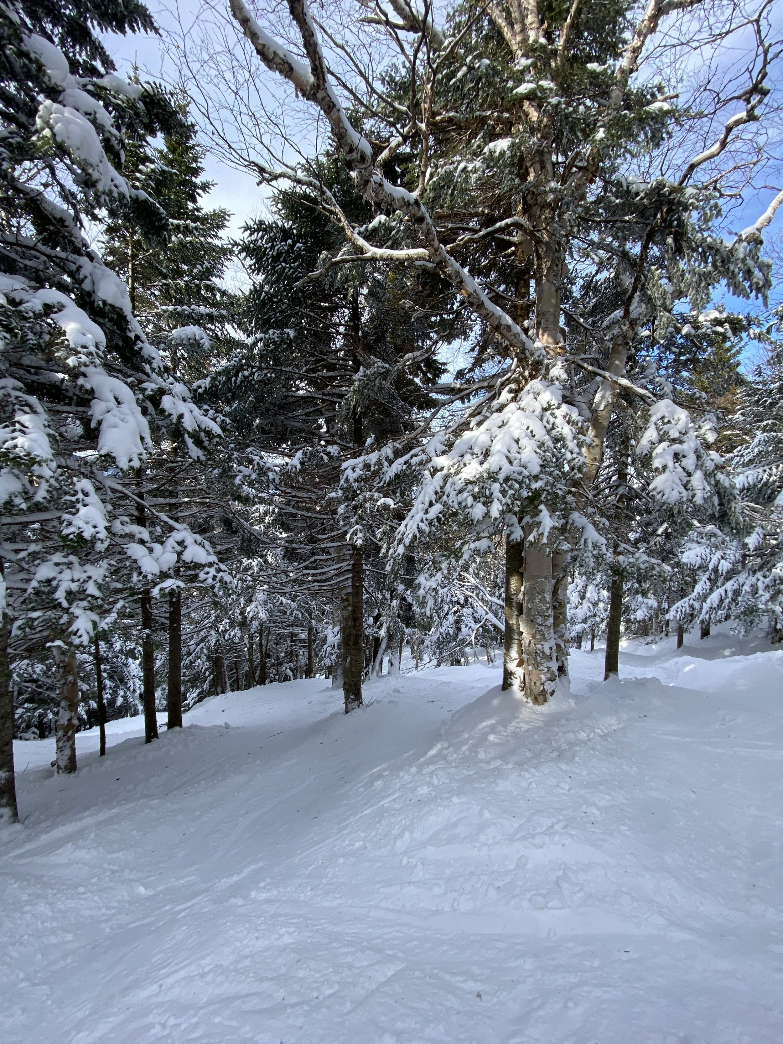 Coverage in the trees was overall pretty good, though there were some thin spots here and there, especially in glades lower down on the mountain like the Moonshiner’s Glade, or Poacher’s Woods on Sterling mountain. My favorite glades today were probably Doc Dempsey’s Glades and Shakedown. The entrance to Doc Dempsey’s was rocky, but after that the snow was pretty nice. This is a glade that’s more of like a cut trail with trees on it. As for Shakedown, I actually struggled through the first part of it. The trees were tight, and there were some thin spots. I’m not the greatest glade skier, so this meant I was being overly cautious with every turn. Eventually, the tight evergreens gave way to nicely spaced trees and I really enjoyed it from then on. The snow was pretty good as well. I’m looking forward to returning to it.