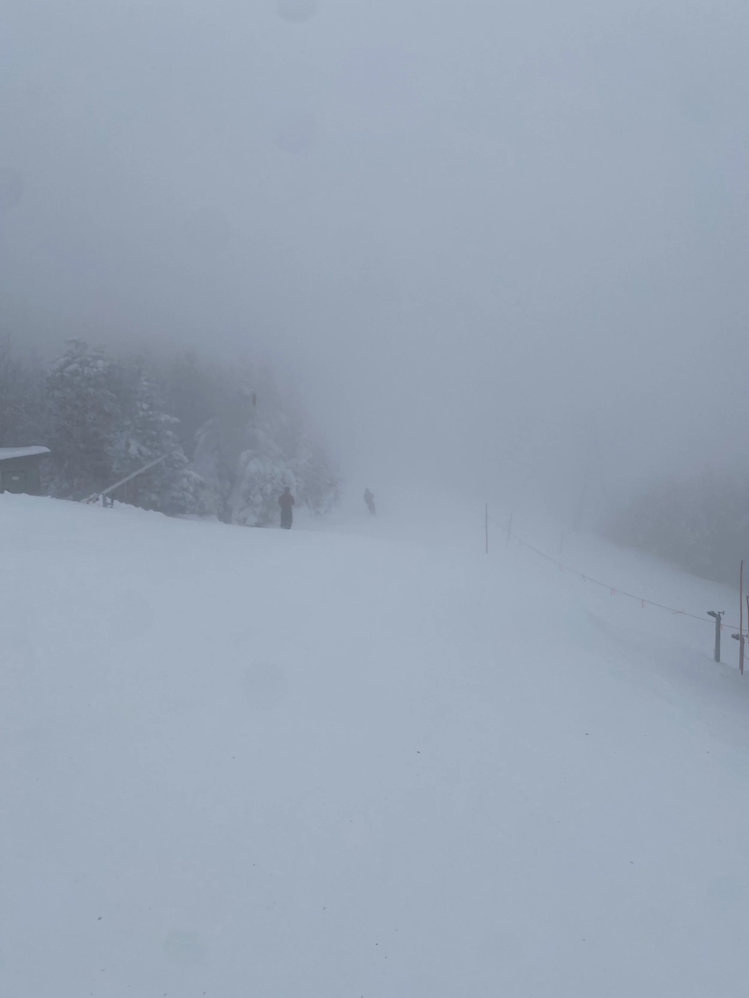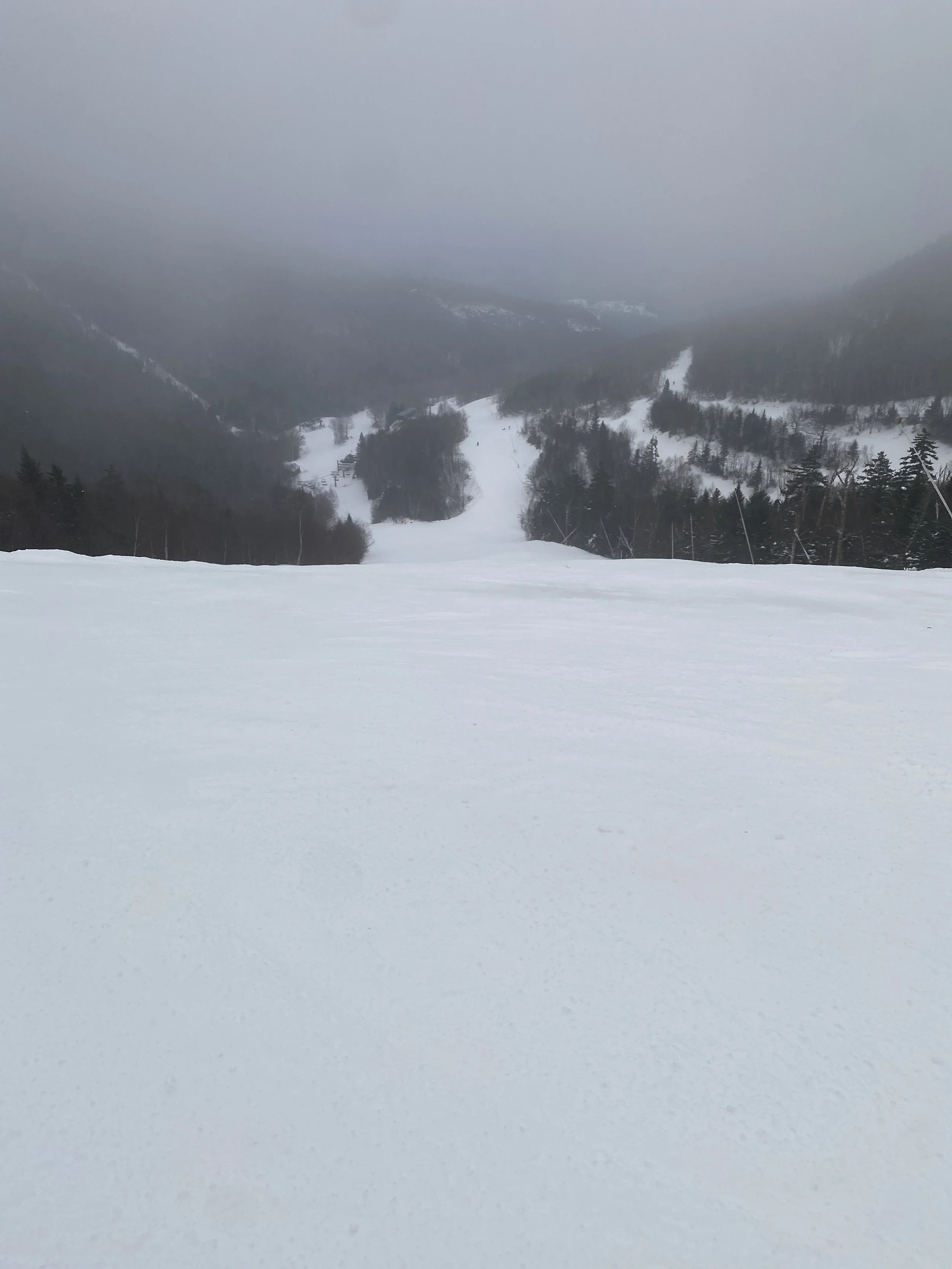Snow conditions varied depending on where you were on the mountain. Like yesterday, some runs had some slicks spots, such as Approach and Essex, while other runs had soft and forgiving snow. The snow wasn’t sloppy anywhere today, although that could happen tomorrow or Friday with warmer temperatures and rain expected. With the low visibility up high, I found myself really having to pay attention to the snow surface, especially with the thin layer of ice that kept forming. Fortunately, my gloves have a squeegee on them, but it’s not ideal to have to constantly clear my goggles during a run.