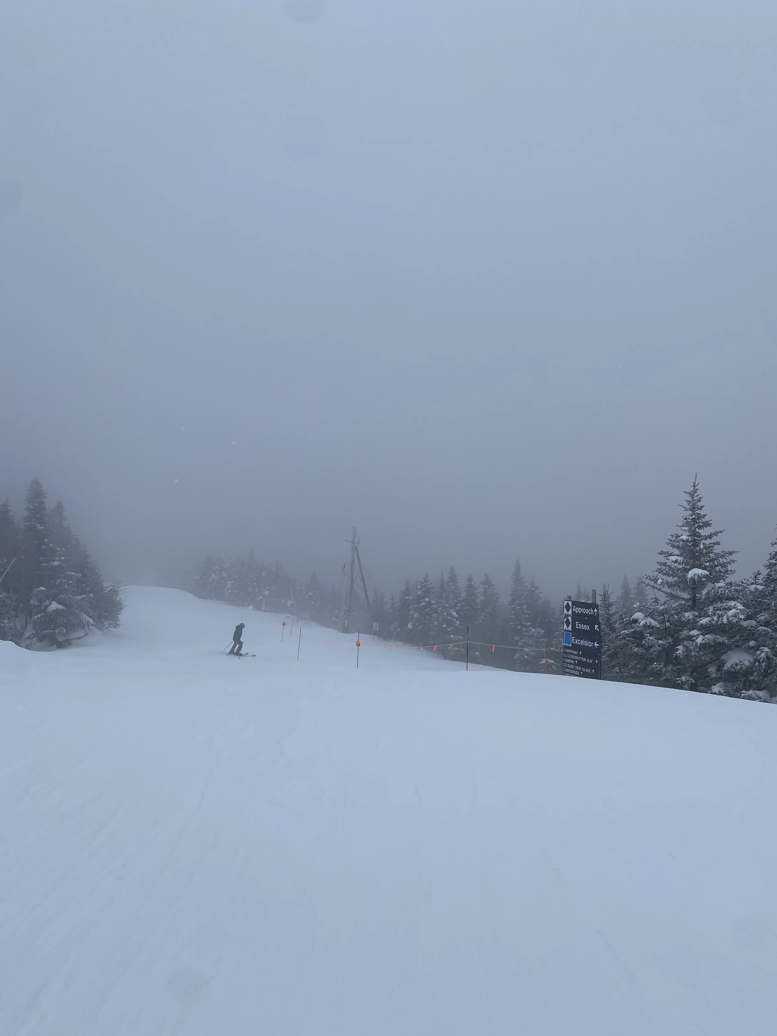 As mentioned, there was snow in the air. I’d say the mountain had received an inch or two by the time I left, which really helped freshen up the groomers, especially the steeper ones, which were firm yesterday. It wasn’t a particularly cold day with temperatures in the 20s. Visibility was low up high, but it was fine below 3,500 ft. elevation.
