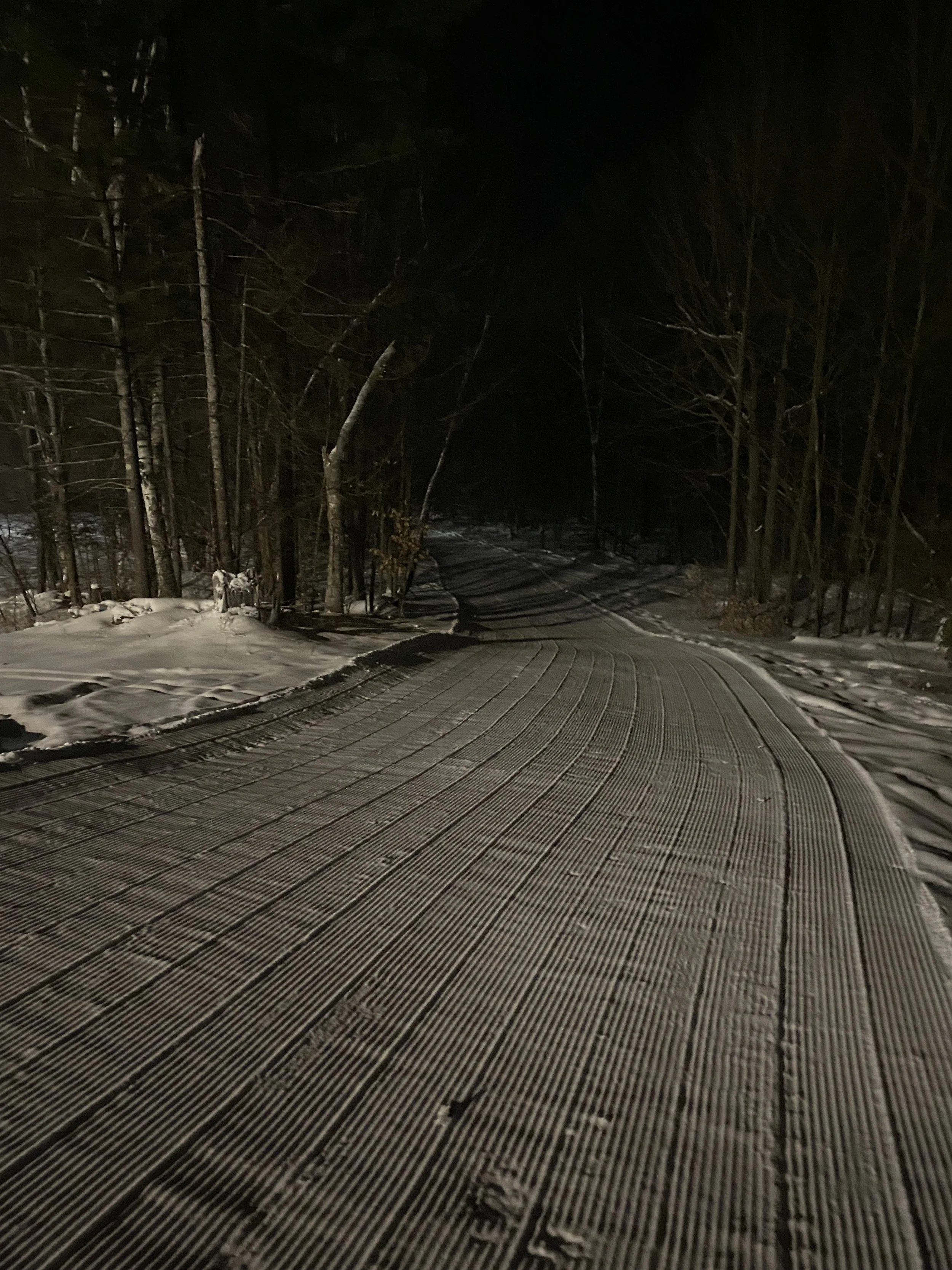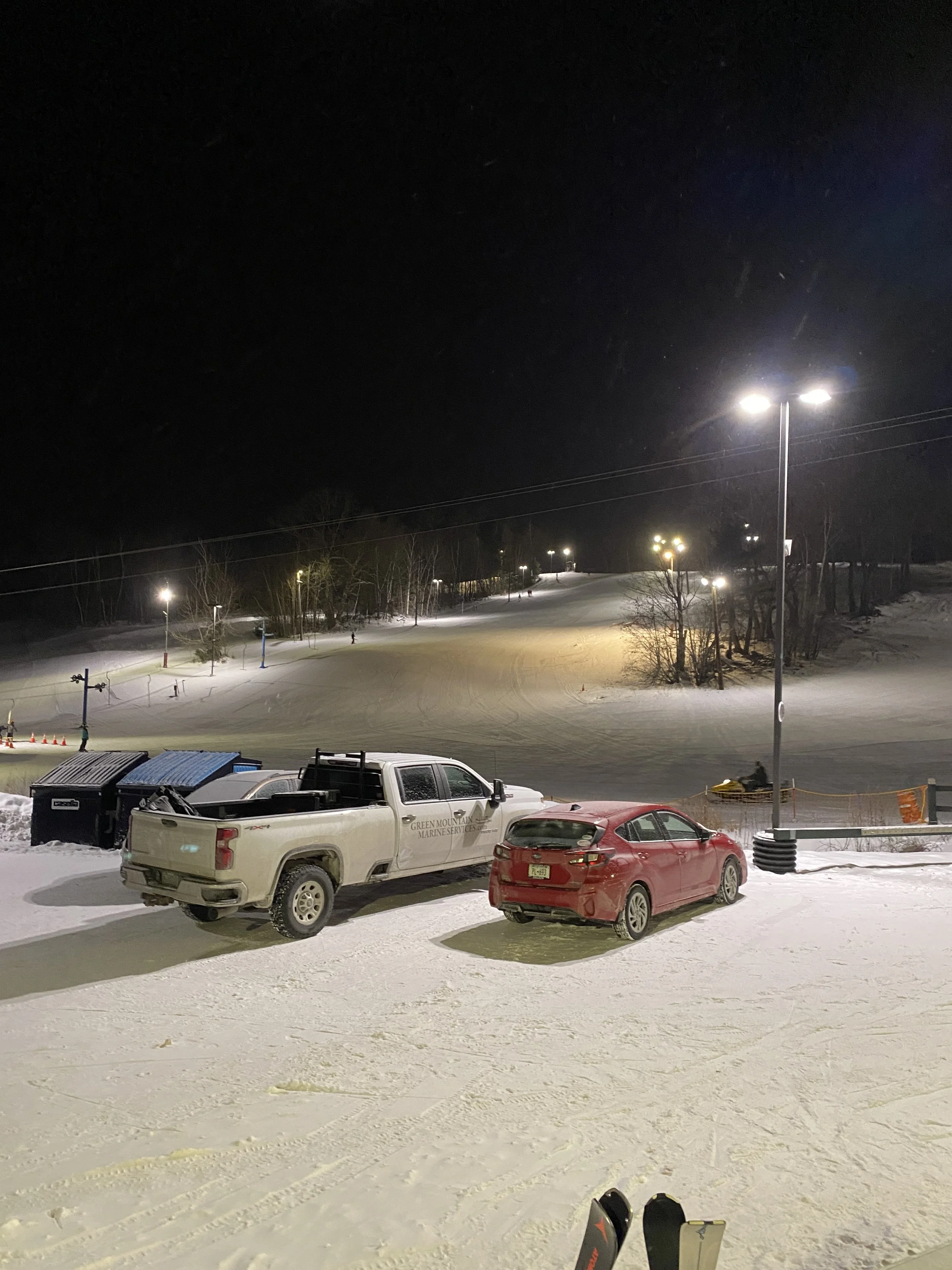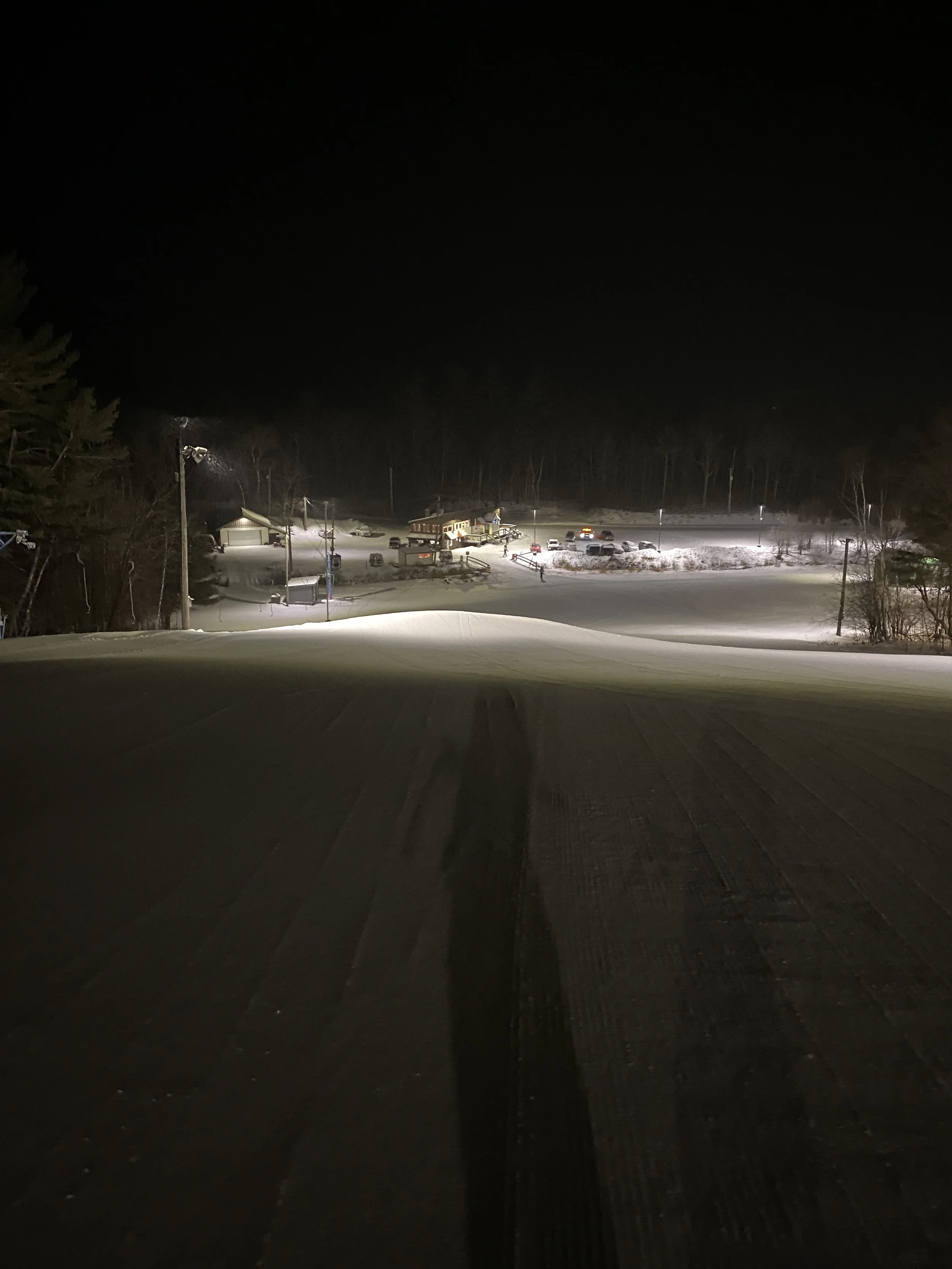 Conditions were outstanding, with packed powder and powder everywhere, and plenty of fresh corduroy, thanks to the hill being quiet. I know it’s a small ski area, but you can get decent speed and some nice turns in, and I had a great time doing just that. My run of the day was probably Orchard, which doesn’t have lights, but the lights on the hill lit it up just enough for it to be skiable. I found it to be pretty fast (relative), and the run itself is fairly narrow, so it was an interesting run to ski at night without a ton of light.