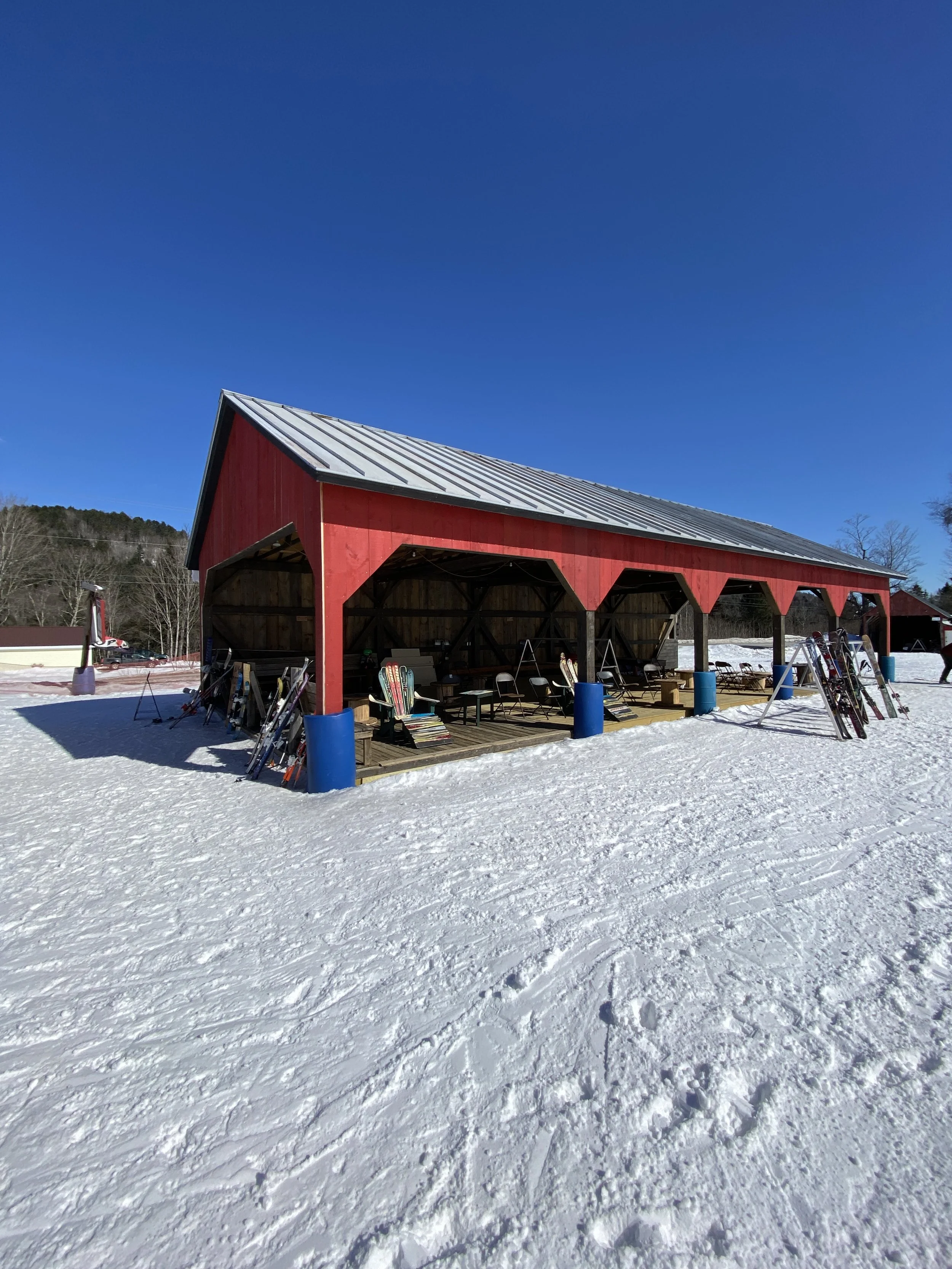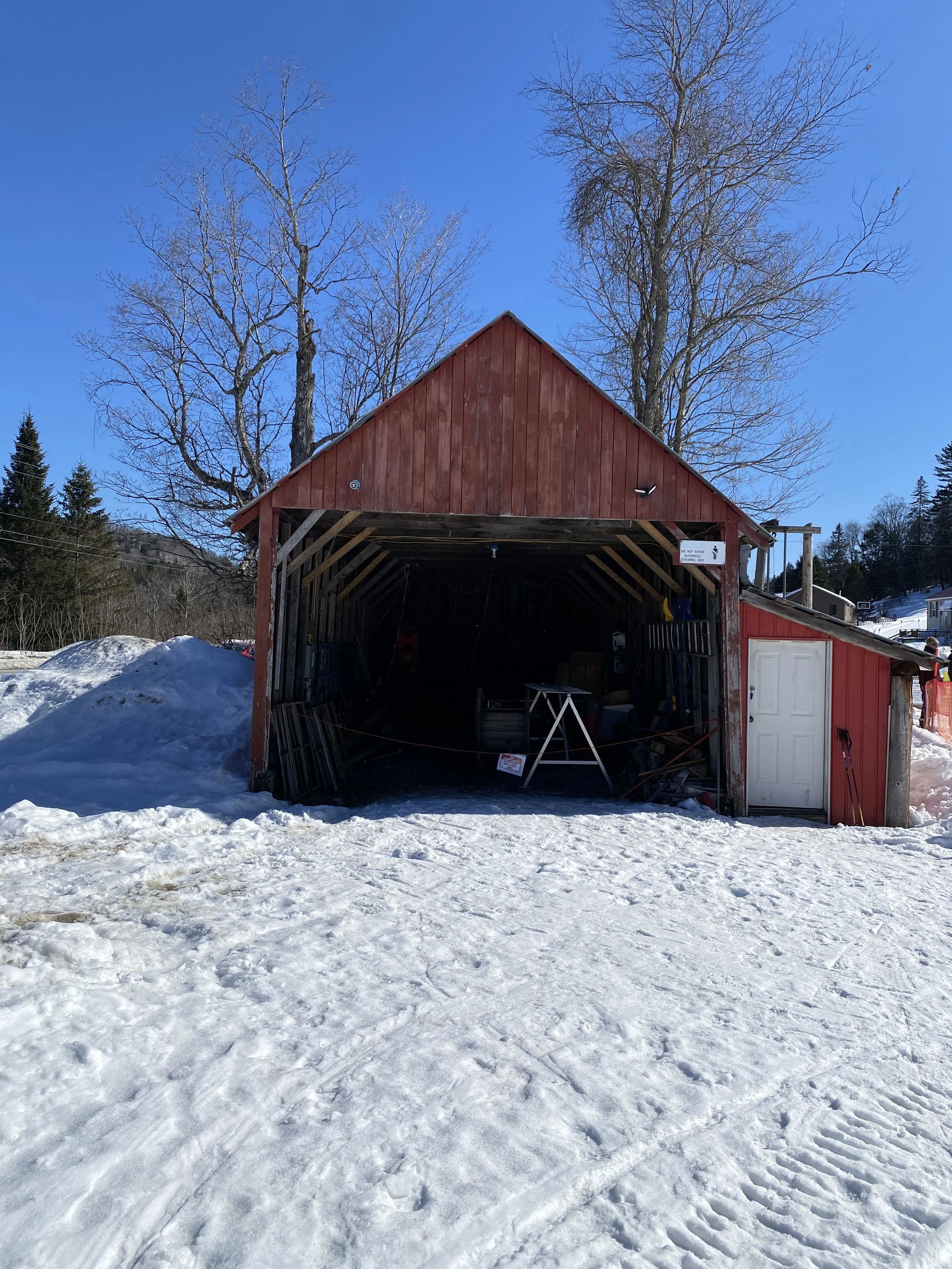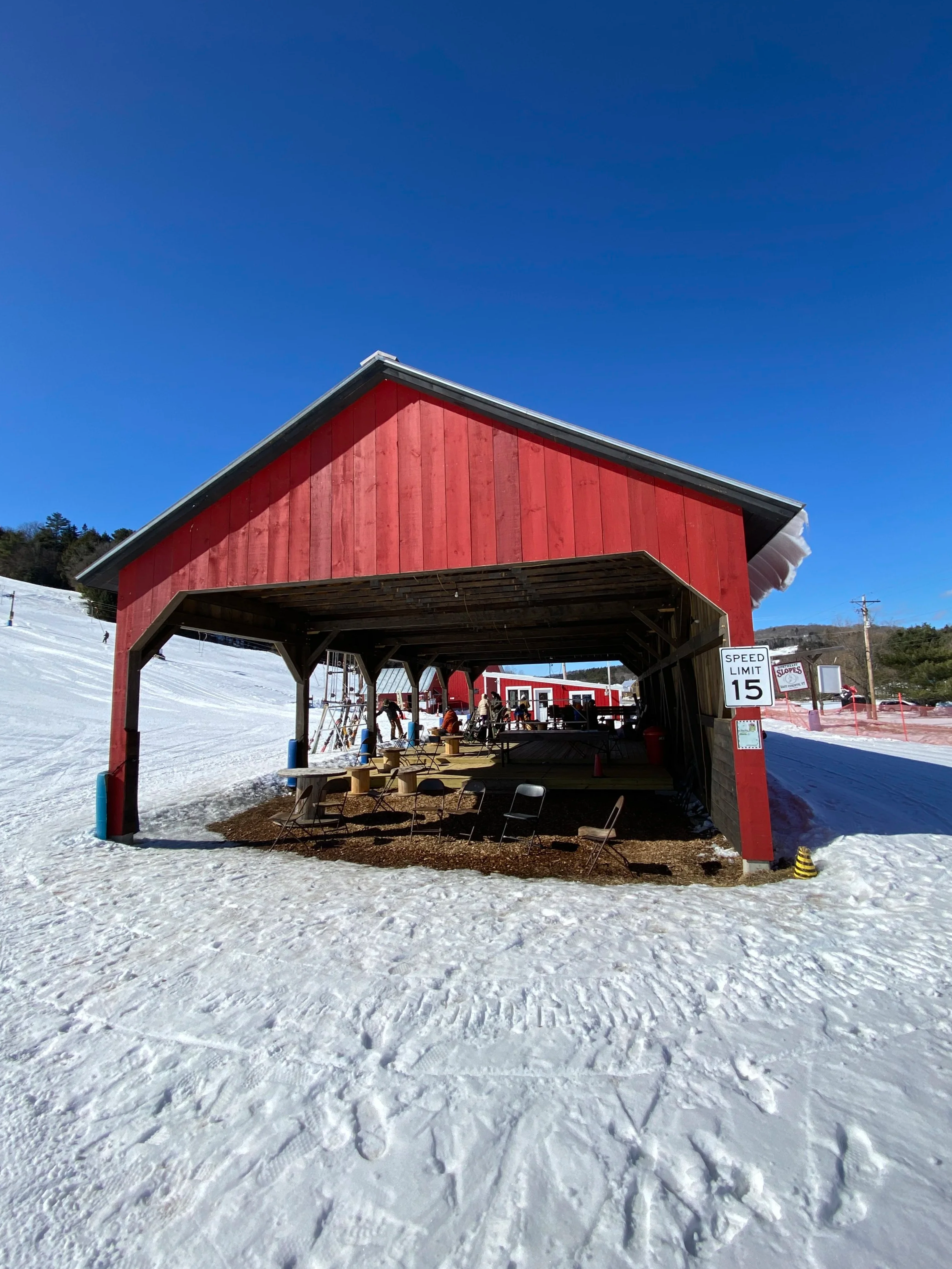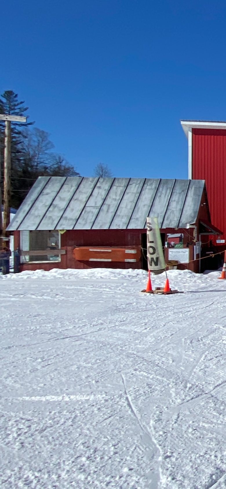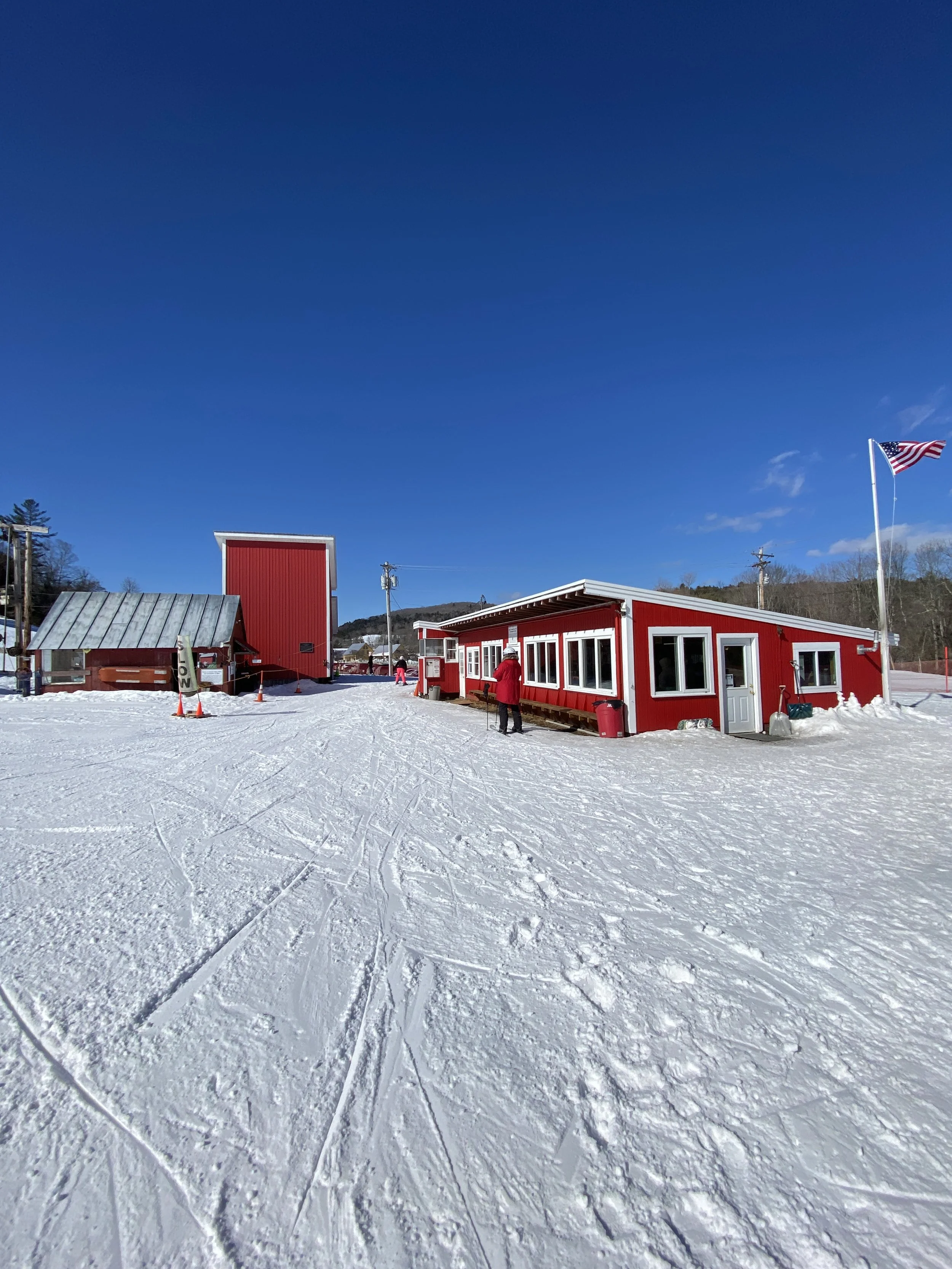 Northeast Slopes has been spinning rope tows since 1936 and it’s the oldest operating rope tow hill in the country. They have two. One is short, and the other goes almost to the top of the hill. If you want to get to the top, you’ll need to take the T-Bar. The hill is about 35 acres, with a vertical of 360 ft. There are 12 runs. They don’t make any snow. This is a natural snow-only ski area. On top of being the oldest rope tow hill in the country, Northeast Slopes is also home to some famous red buildings.
