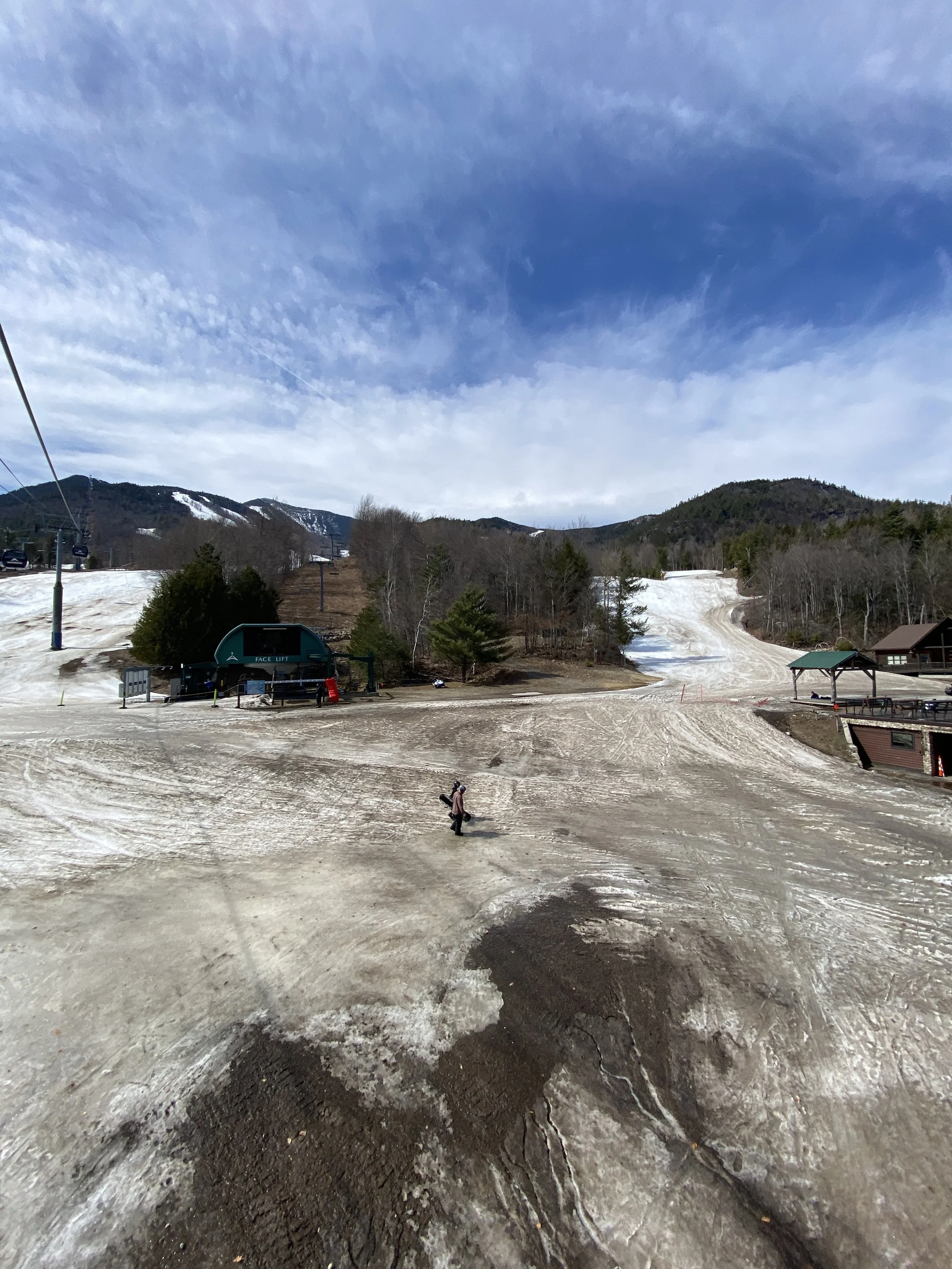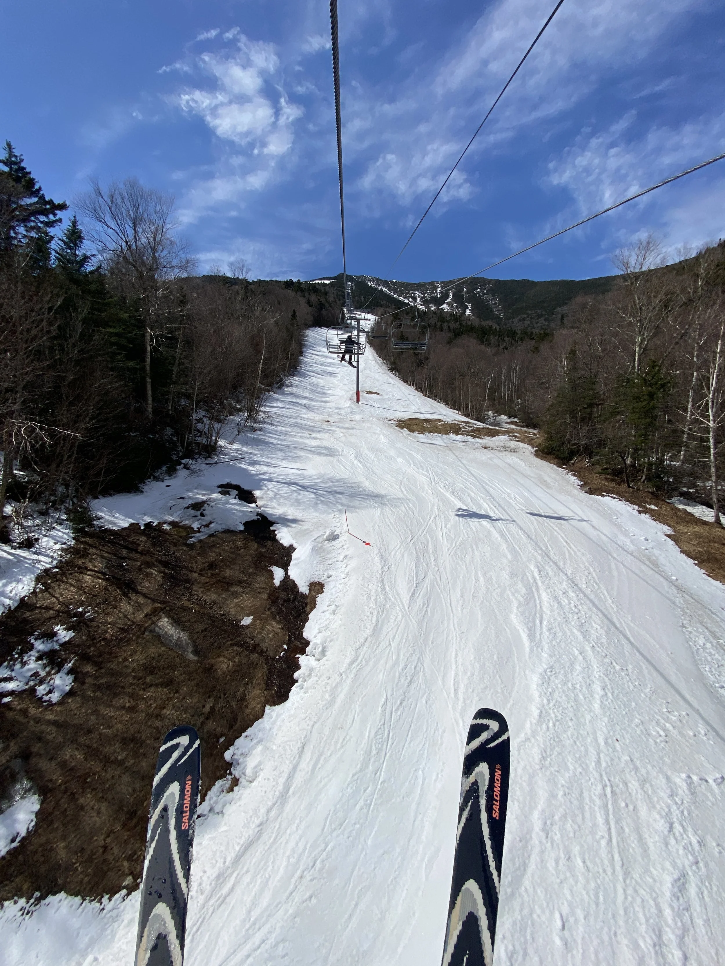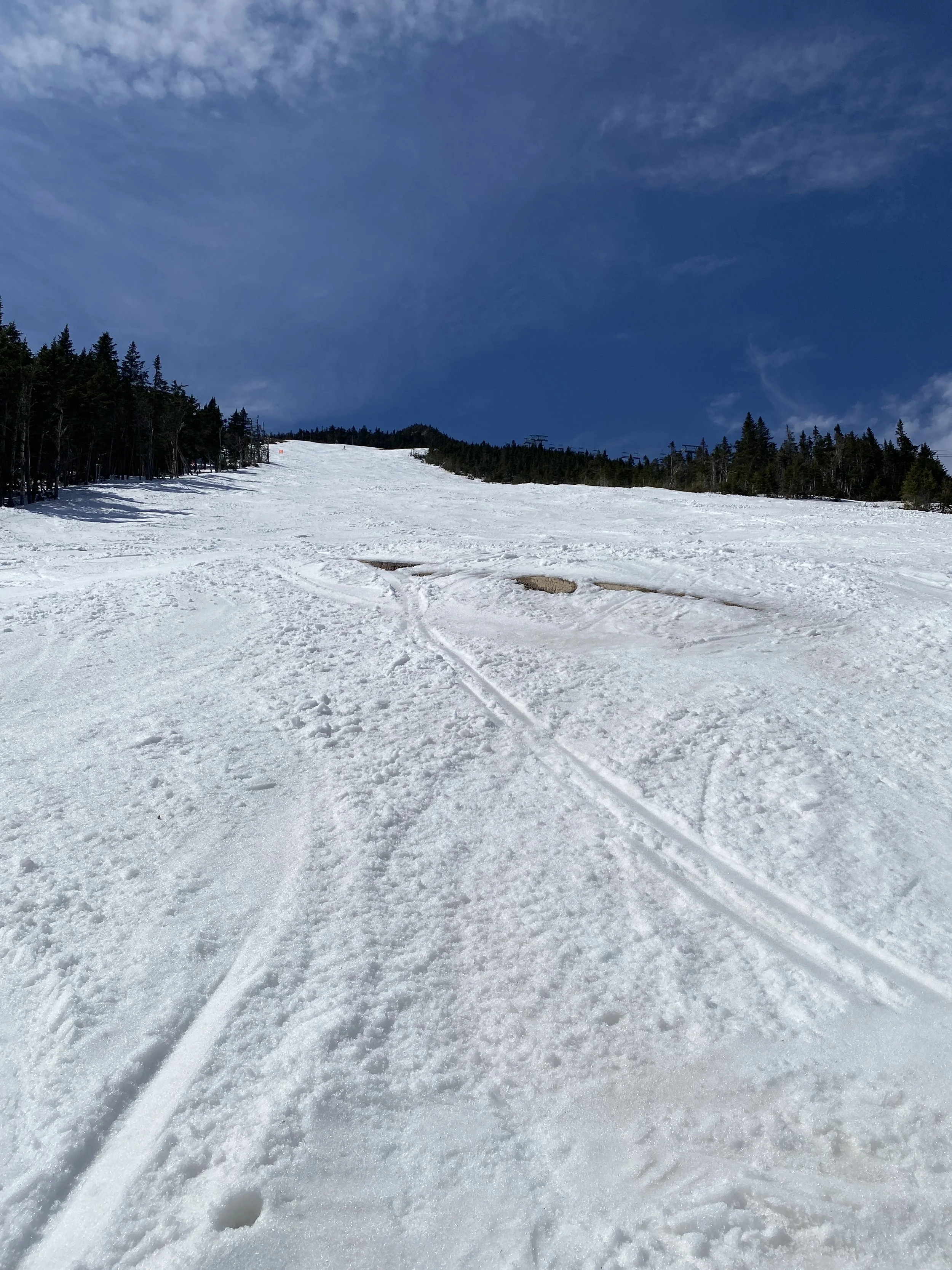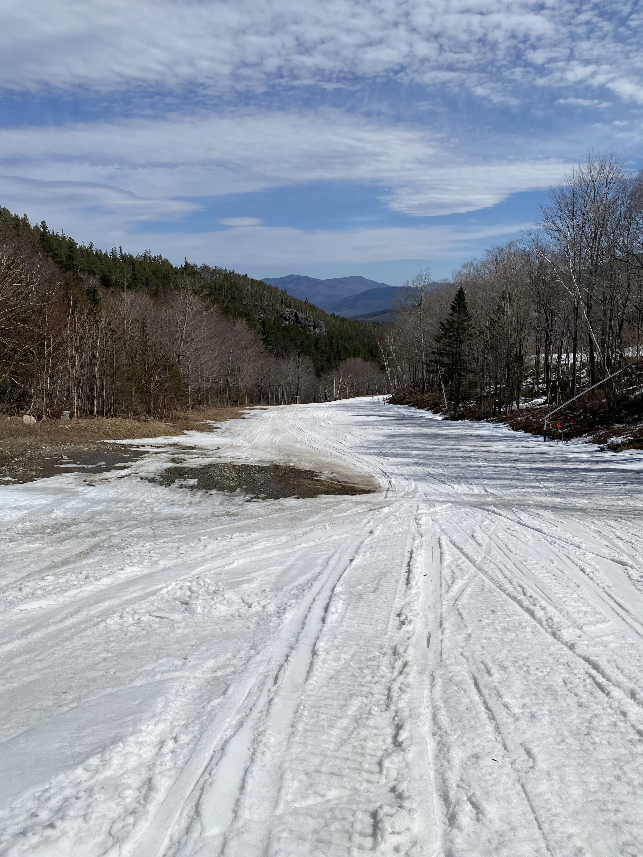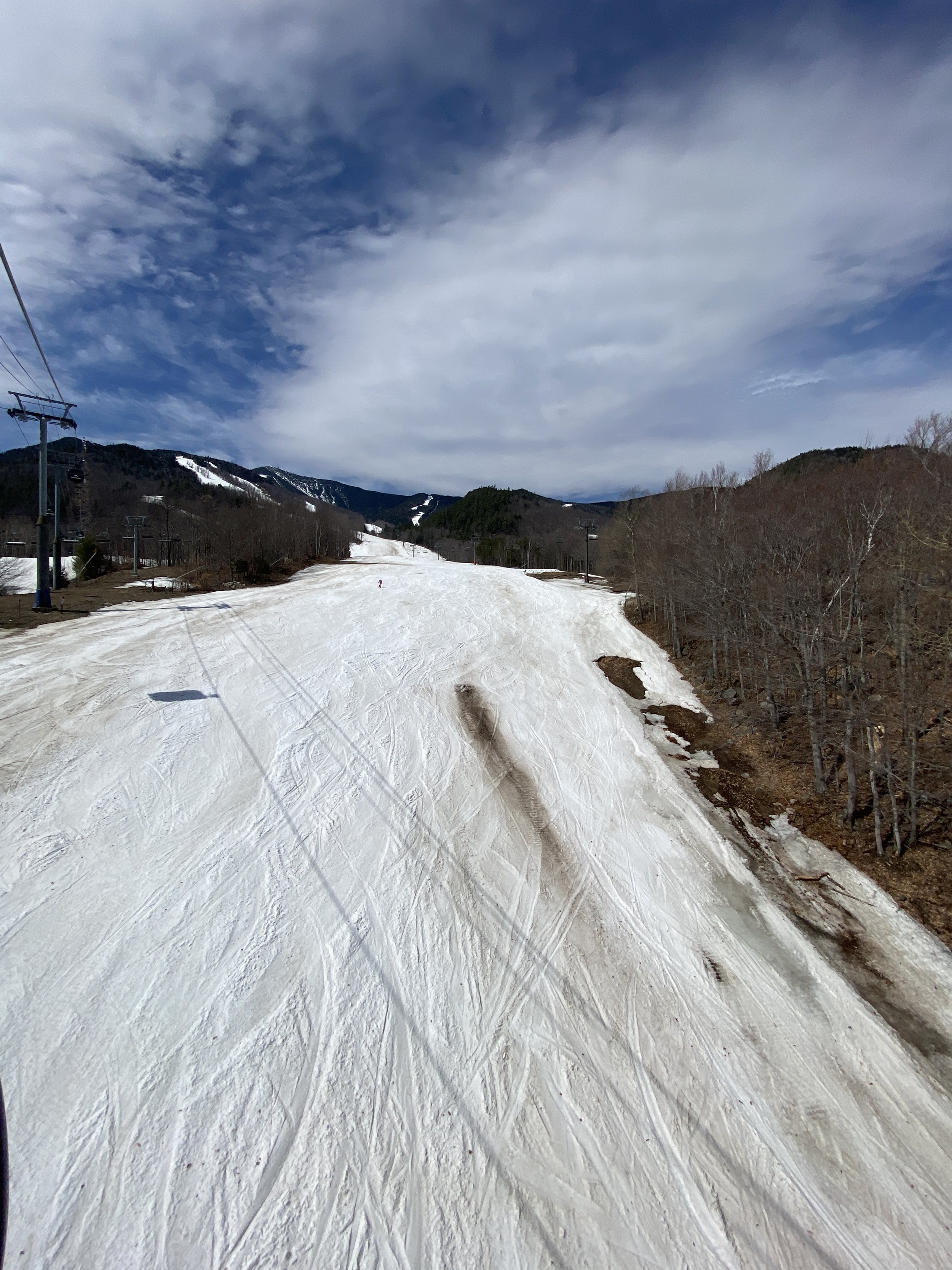 Aside from the base of the mountain, which is pretty rough, coverage is still decent to pretty good on most open trails, but the bare spots are there on a lot of them and they’re growing by the day. Some trails are rougher than others, such as Boreen and Paron’s Run. Upper Skyward is still basically edge to edge in coverage, but there were a few spots today where there was some rock poking through, and that will definitely be something to watch out for as the snow continues to melt.