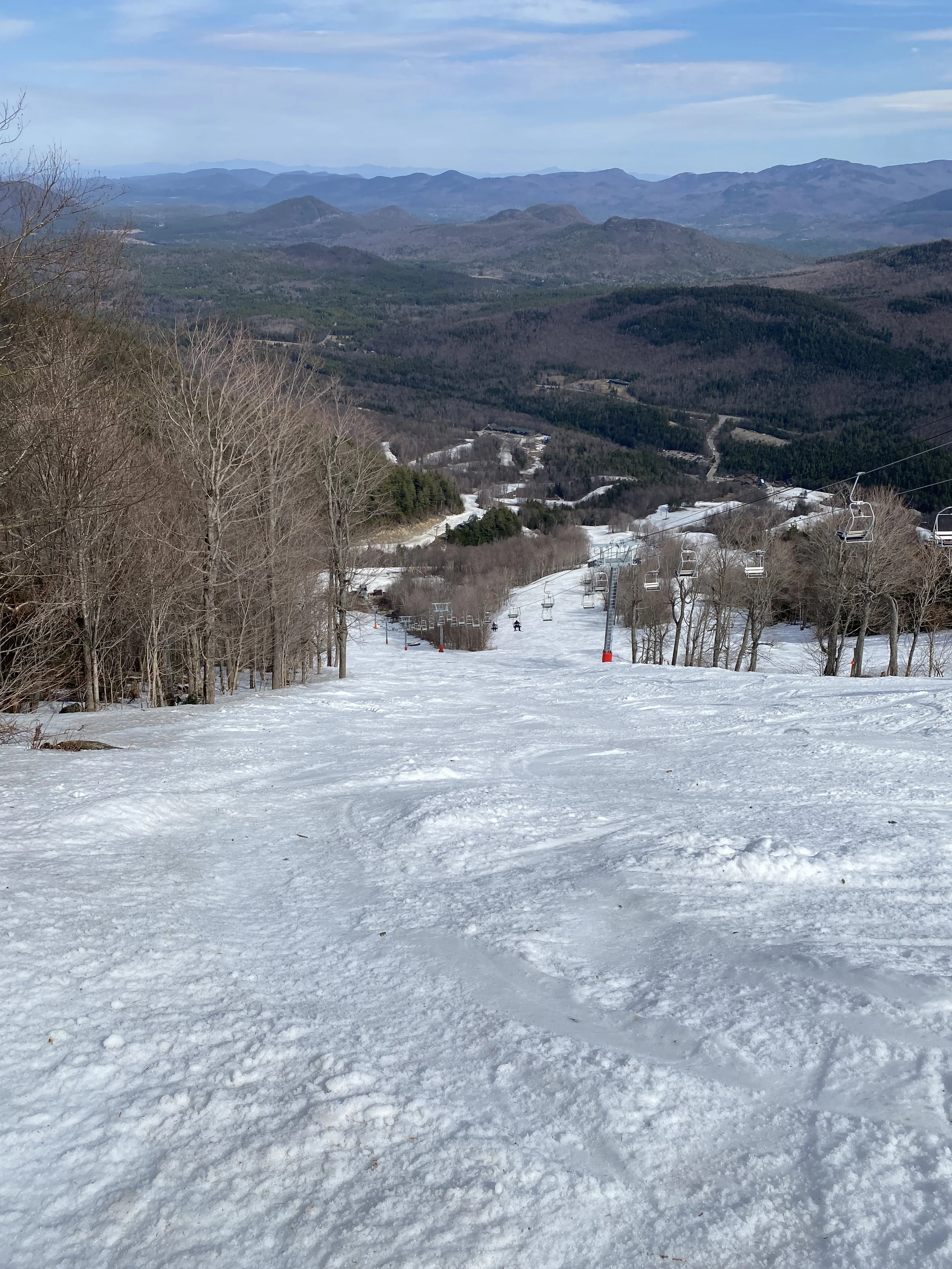 There were five lifts spinning providing access to 57 runs. The Bear Den Learning Center closed for the season yesterday, so the lifts out of there were all closed, including The Notch, though some of the terrain is still skiable. Prior to today, I’d only been on the new Little Whiteface Double two or three times, but that is no longer the case. It was a nice day to ride that lift, so I spent quite a bit of time lapping it off the mid-station.