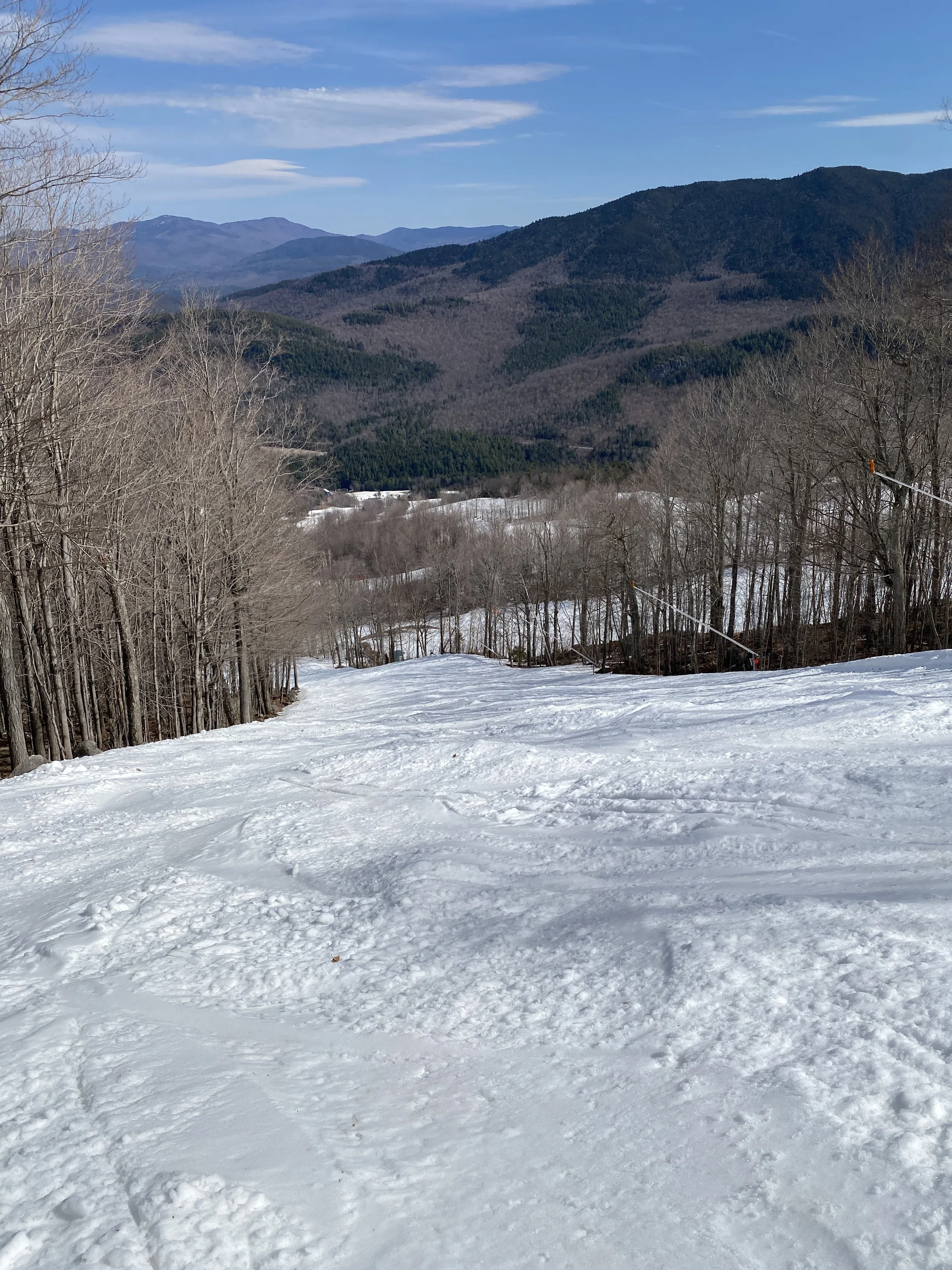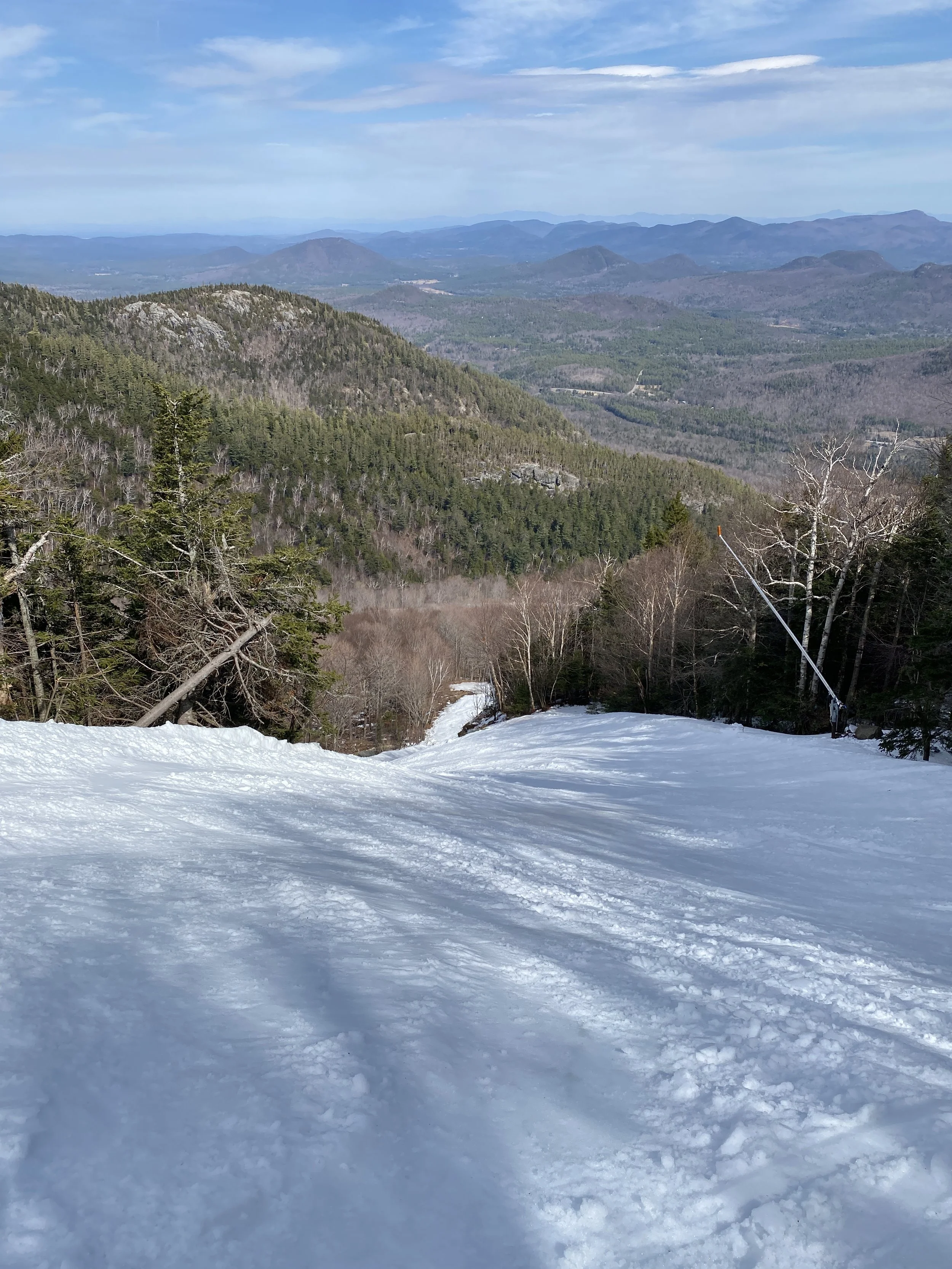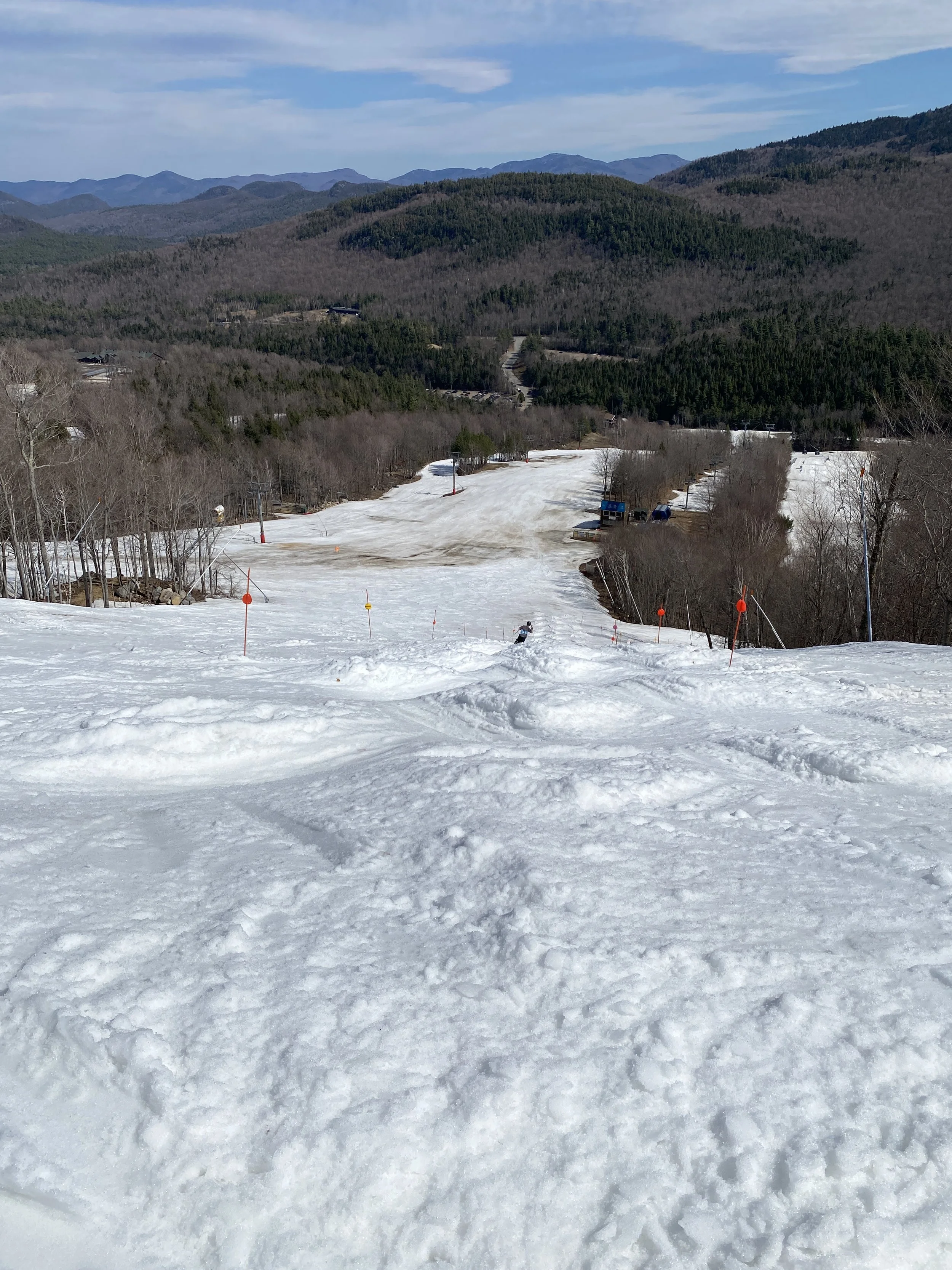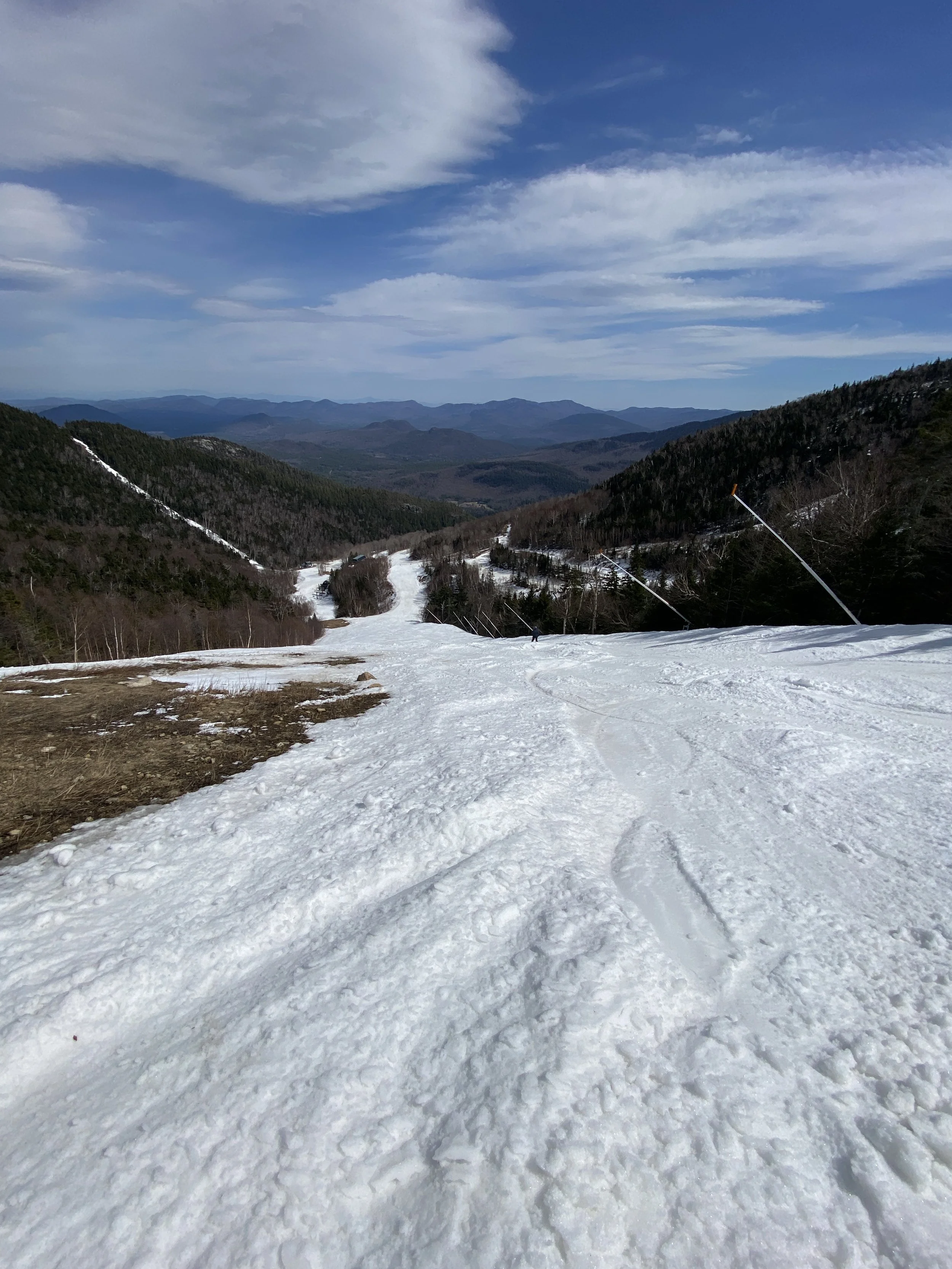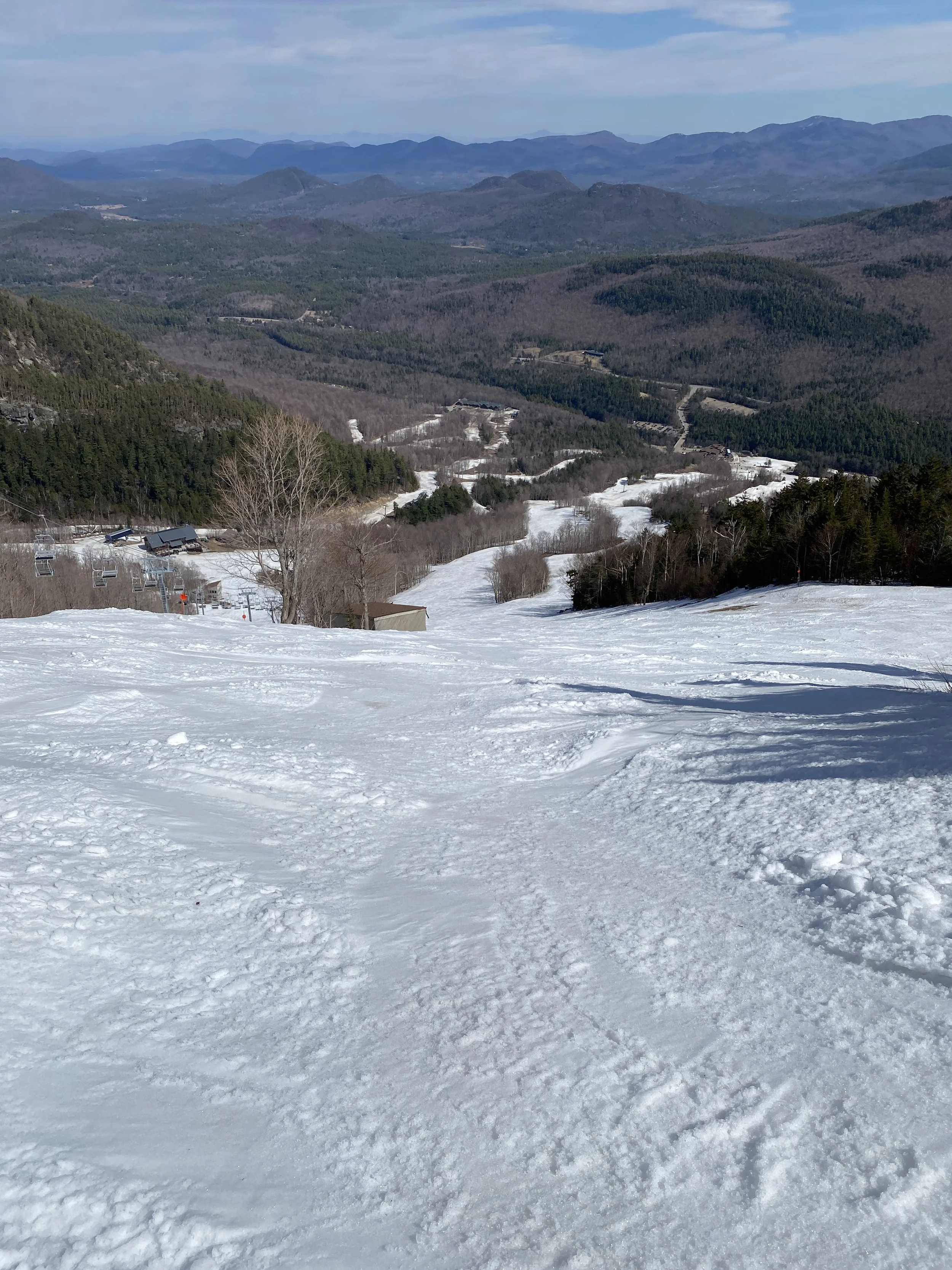 After a cold start to the week, and even a powder day on Tuesday, spring returned to Whiteface today. It was warm, with temperatures in the 50s, and sunny. In my mind it was a bluebird day, but there are in fact clouds in my pictures. It’s funny how that works!