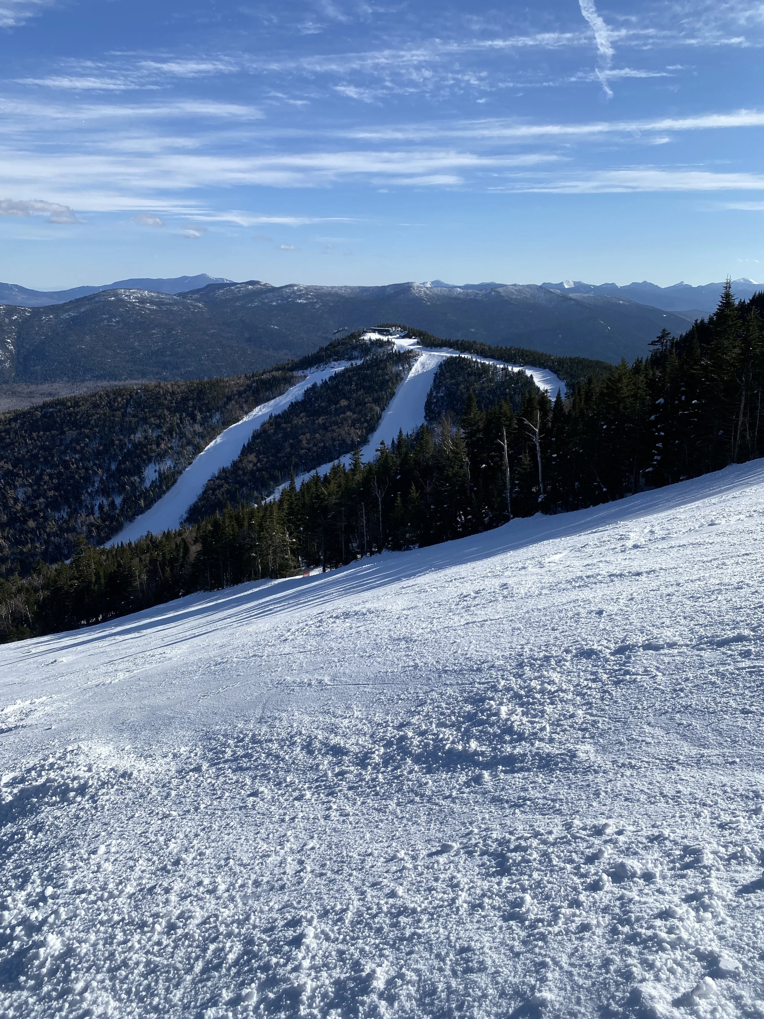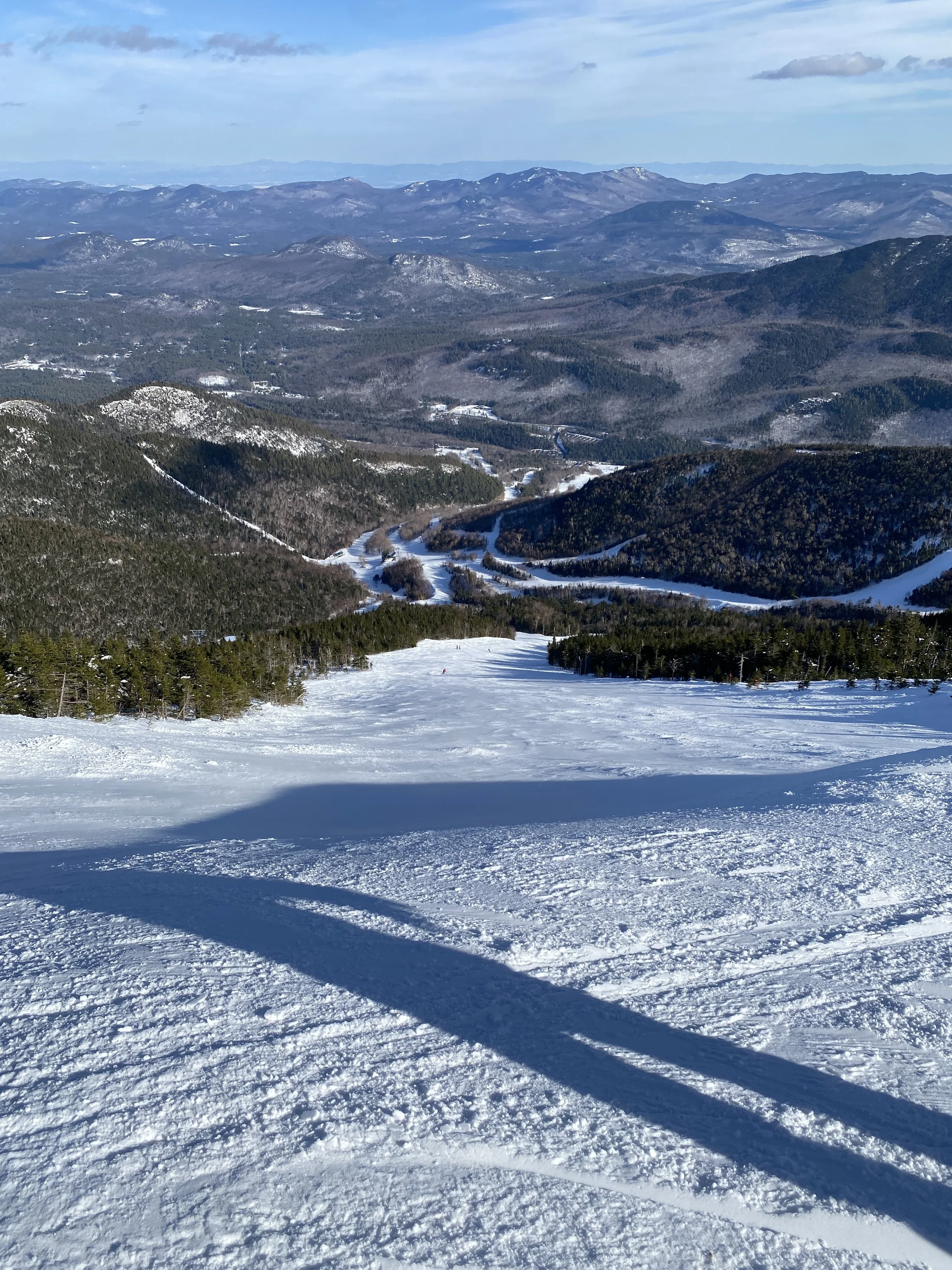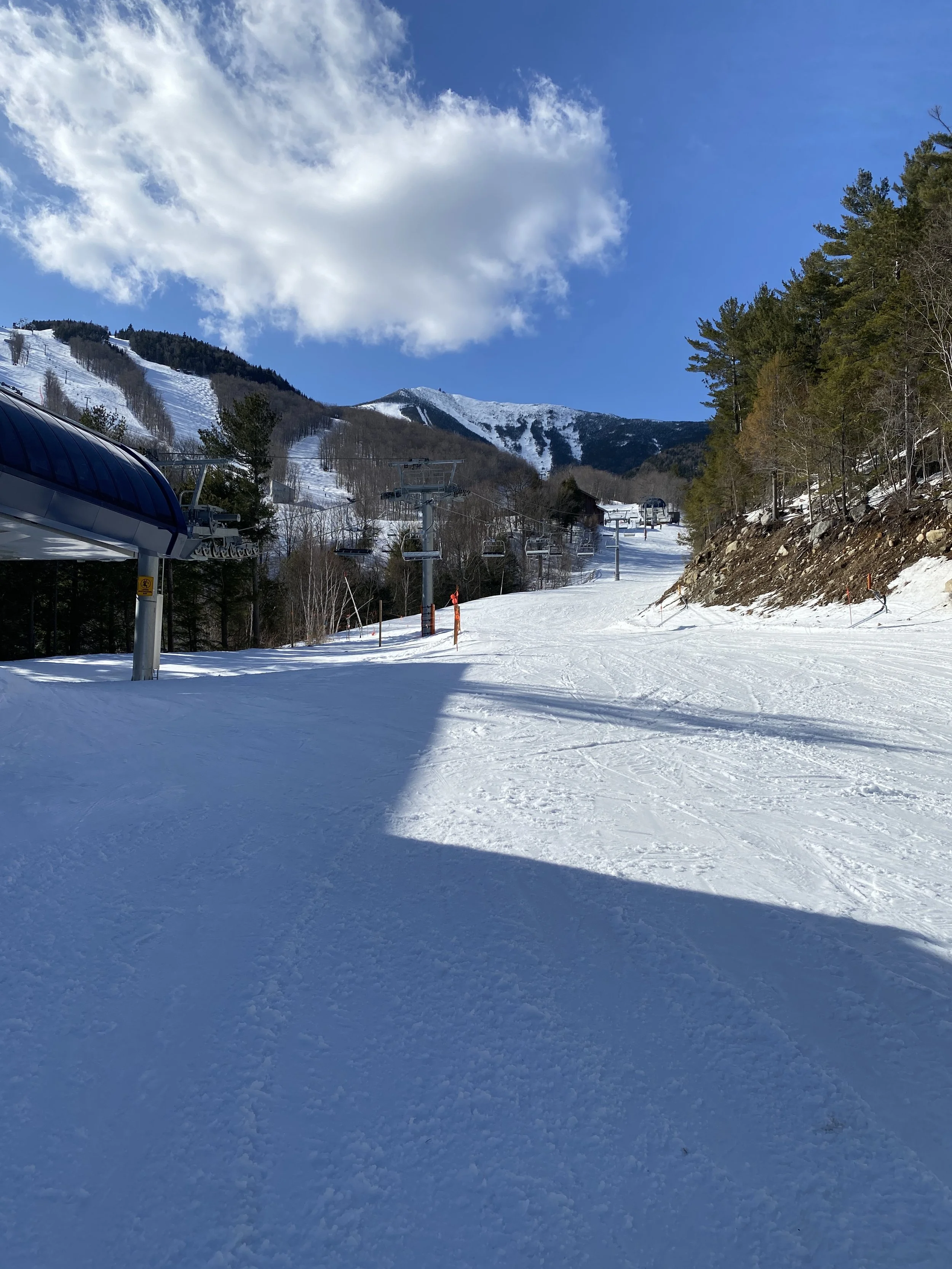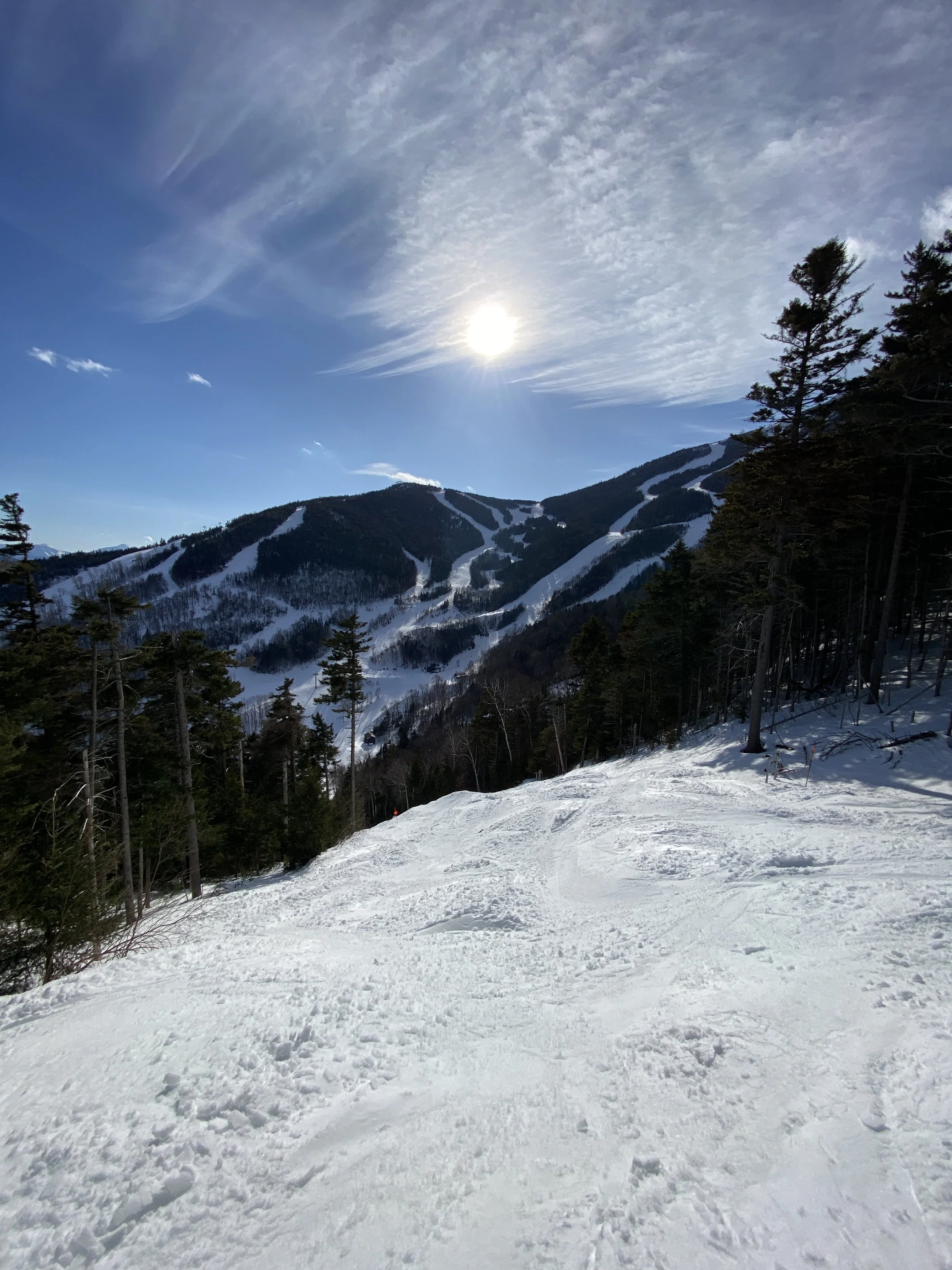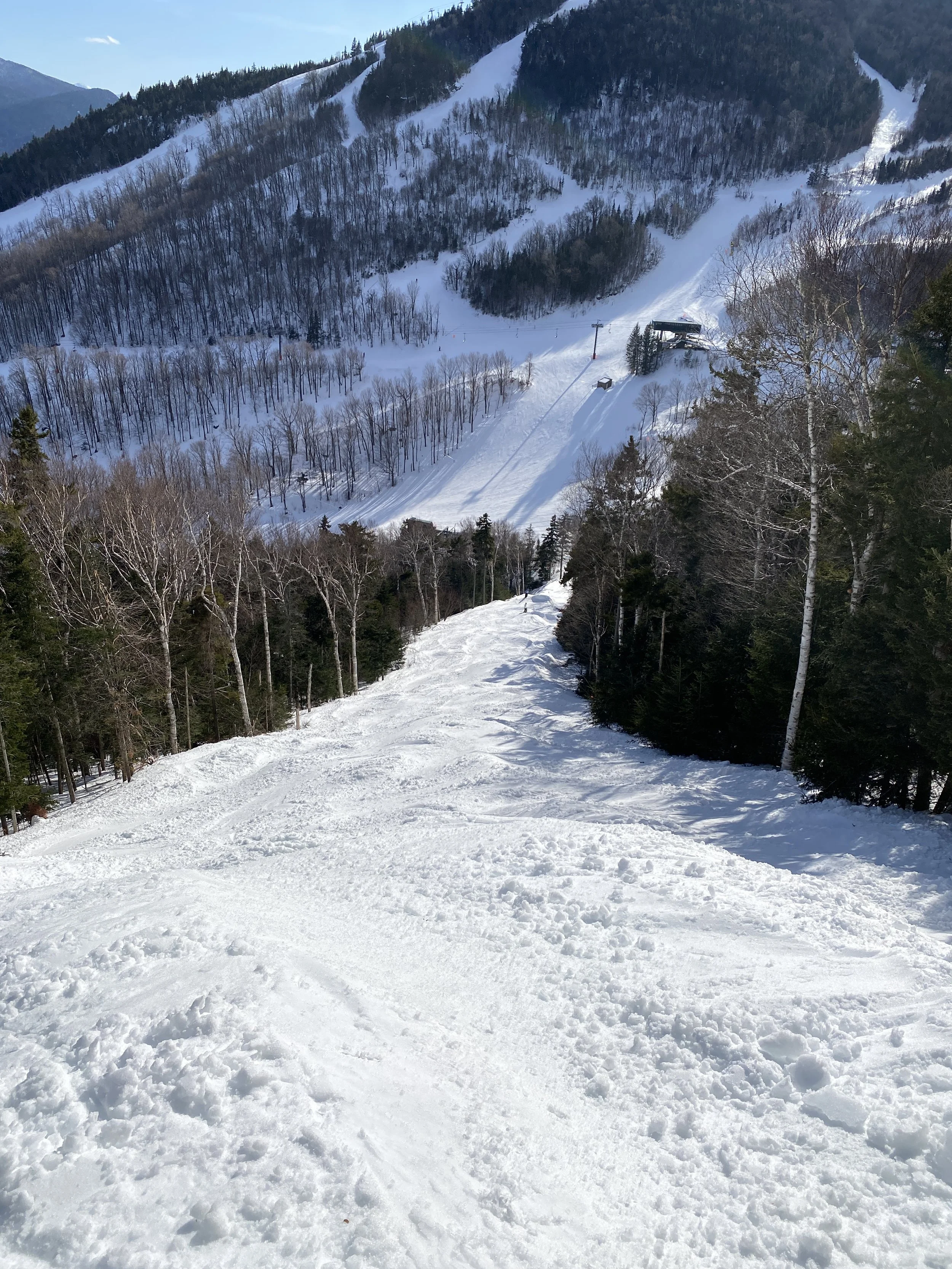 Though exposed to the sun, the temperatures must’ve stayed below freezing way up high, because Upper Skyward was sensational with packed powder most of the way down. The headwall was a little slick, but outside that, it was my run of the day. Lower Skyward was well in to the shade by the time I skied it, so it was a mix of soft snow and firm spots. Another run I really enjoyed was Upper Northway, which faces north. As a result, it held its packed powder conditions all day.