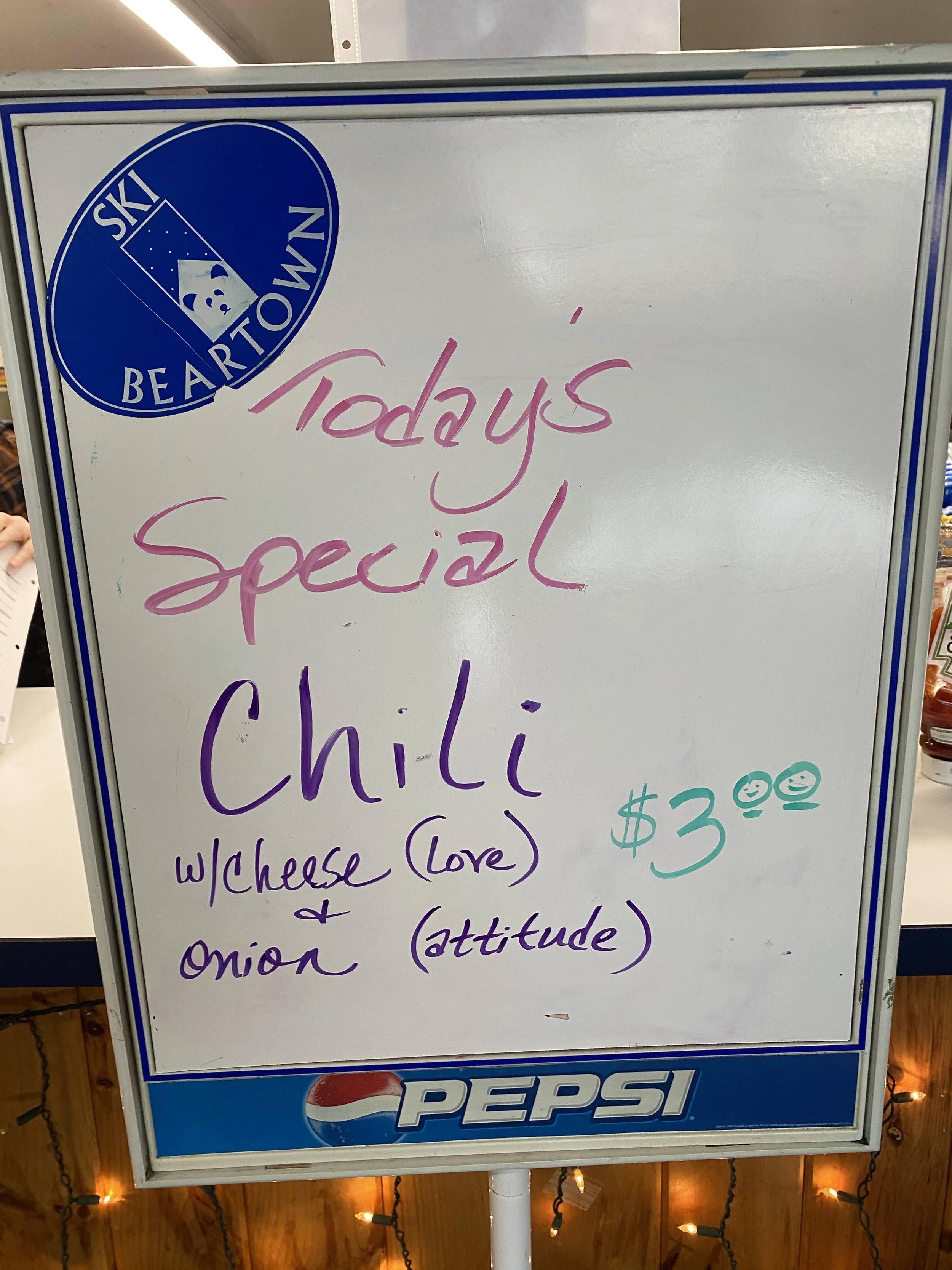 But what this place lacks in vertical and size, it makes up for in charm and character. Beartown is a mostly volunteer-run nonprofit ski area. Being a small ski area, a lot of kids, and even adults, have learned to ski here every winter since it opened in 1958. At a time when skiing is increasingly more corporate and expensive, Beartown offers a breath of fresh air and a step back in time. Everyone who works there is friendly. The lifts are old. The lodge is vintage and nostalgic. Lift tickets are cheap, as is the food. I mean, where else can you get a bowl of chili with love and attitude for $3? Or a burger for $4? There are very few ski areas that can compete with those prices.
