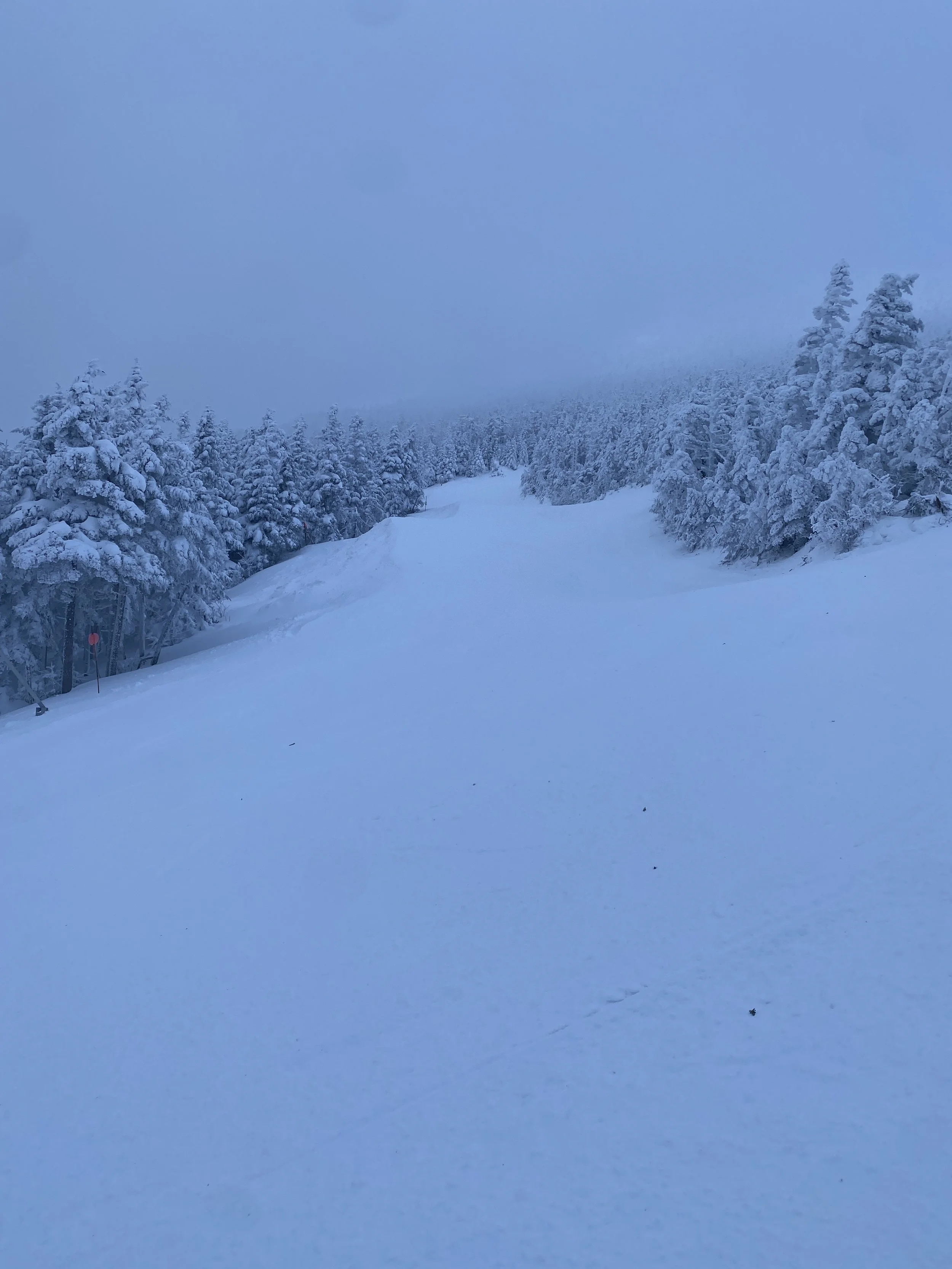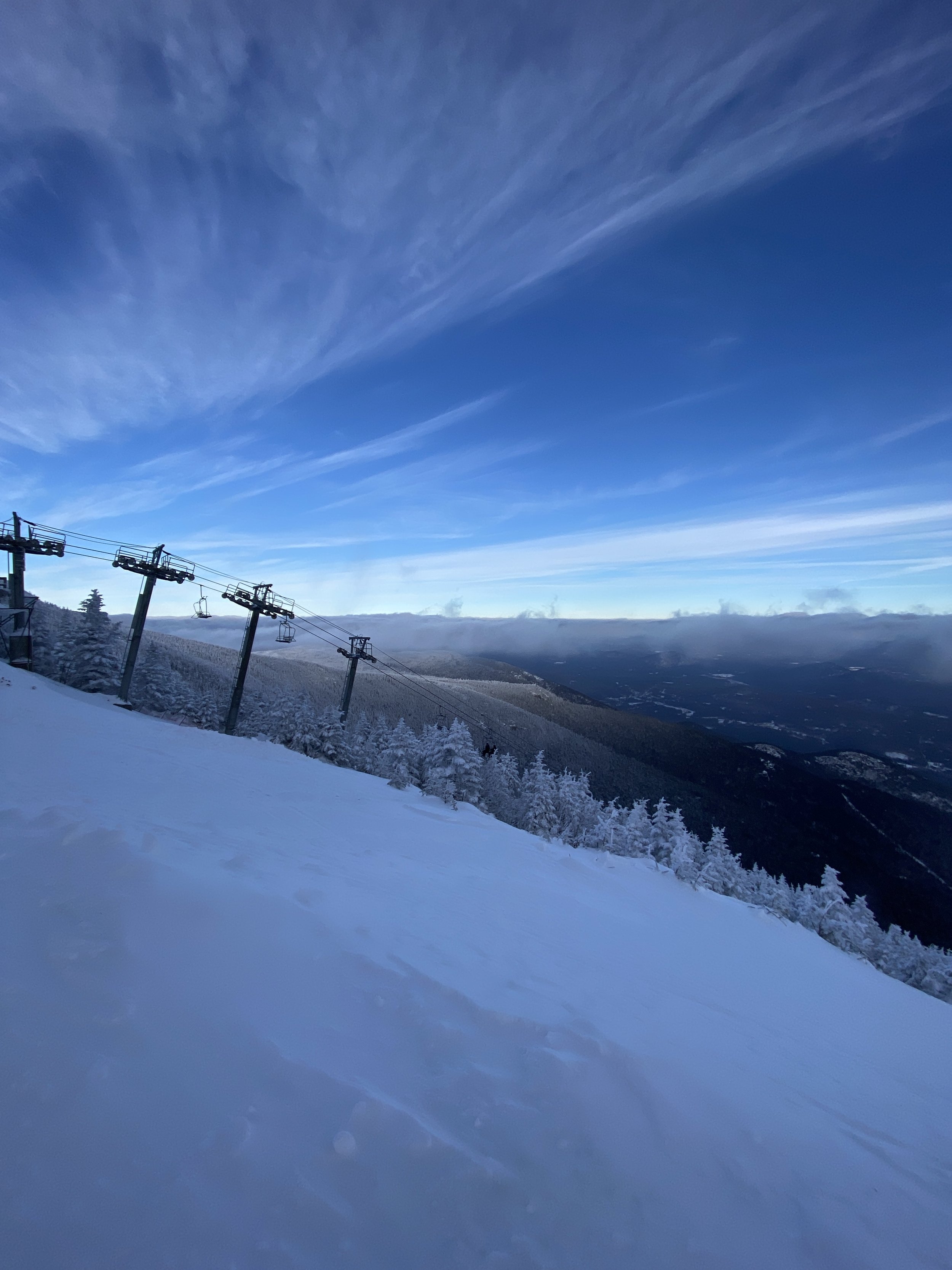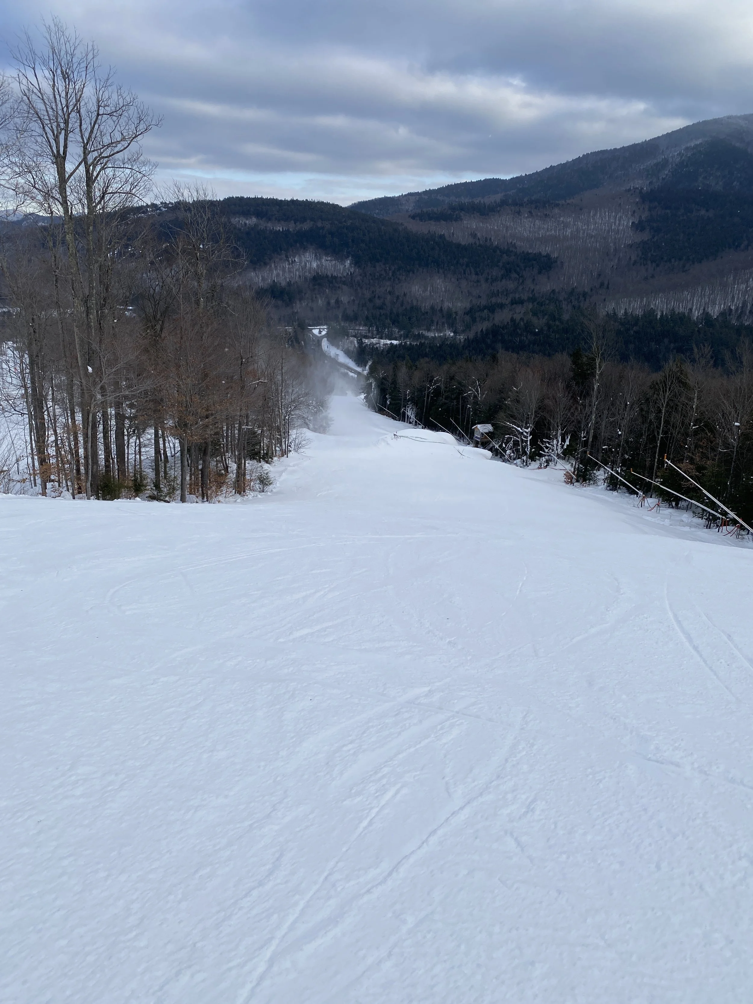 With my toe still bothering me from this past Saturday at Sugarbush, I took it easy this afternoon, but I still managed to ski most of the open terrain. They had six lifts spinning, providing access to around 64 runs. I don’t remember exactly how many runs they had open last Thursday, but I think it was in the low 50s. Over the weekend, a lot of great terrain opened up, including Mountain Run, Upper Thruway, Upper Parkway and Draper’s Drop.