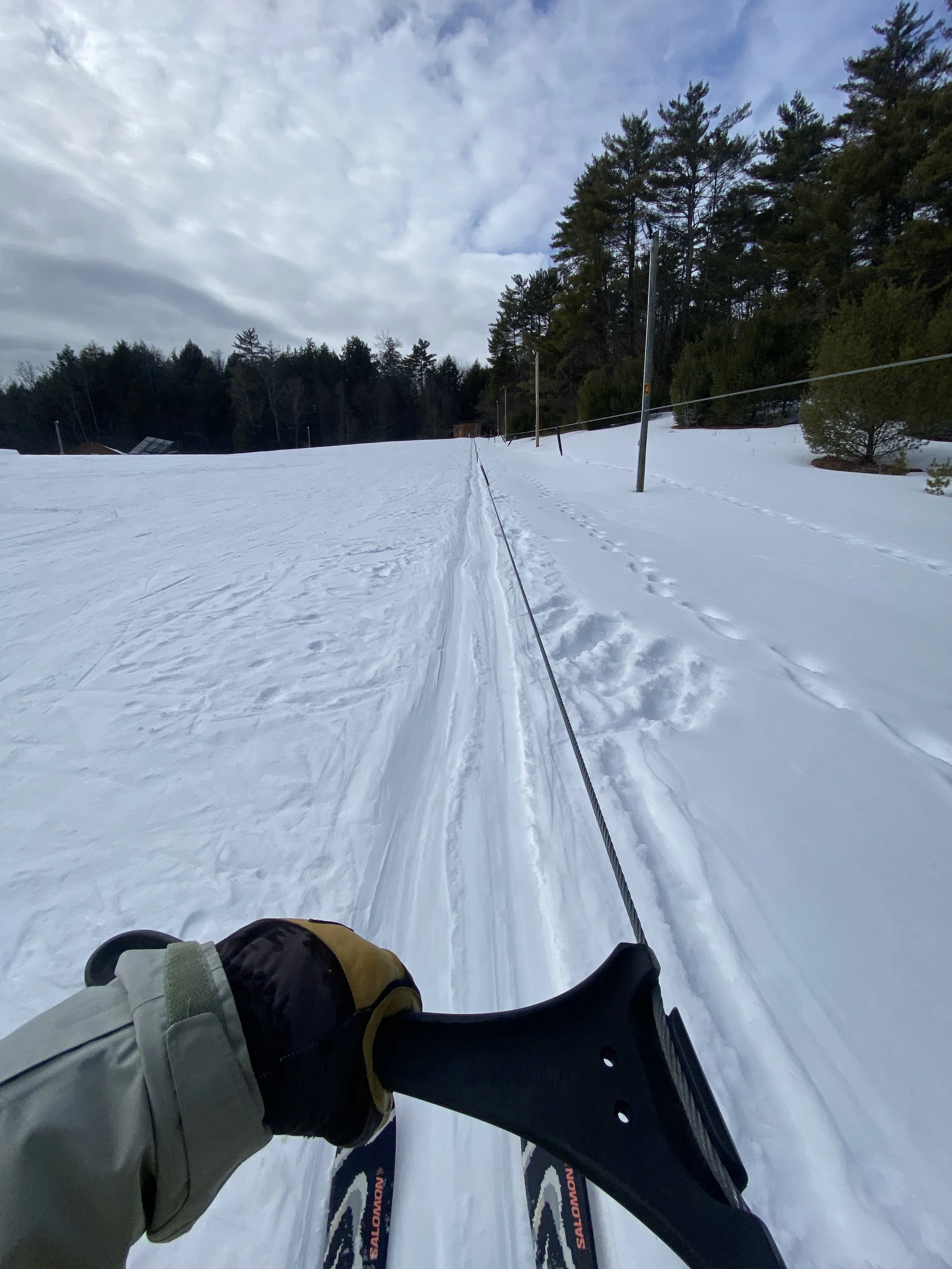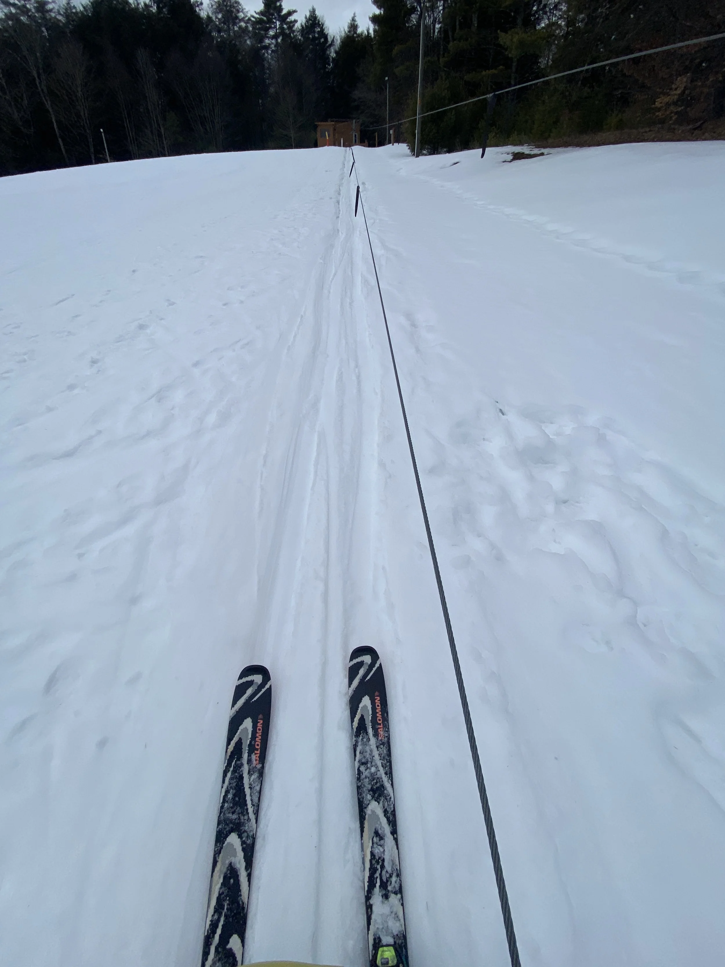They don’t normally operate the handle tow on Thursday’s, but with it being a holiday week, they were spinning the handle tow all day, which provided access to the one wide run. I’d never actually ridden a handle tow, so this was a first for me. When I first got on it I thought you were supposed to hold the handle with your hands. After a lap or two, my hands were starting to hurt, and the lift attendant showed me that I could actually put it behind my back. From then on it was a pretty comfortable ride.