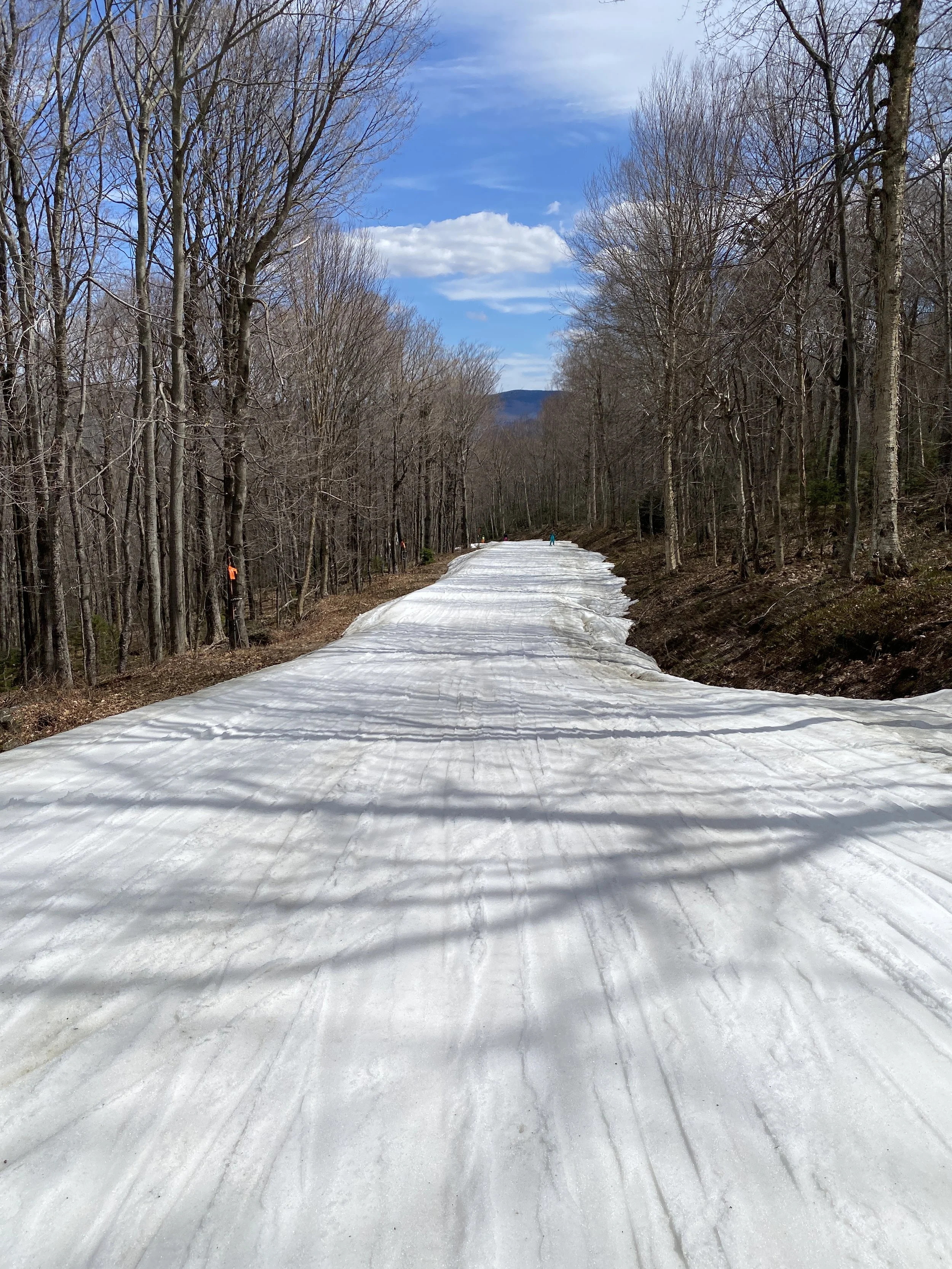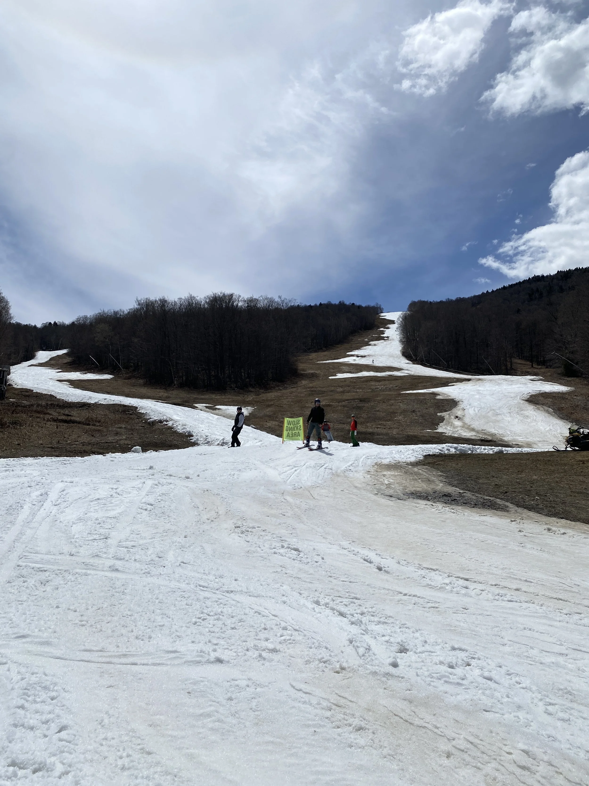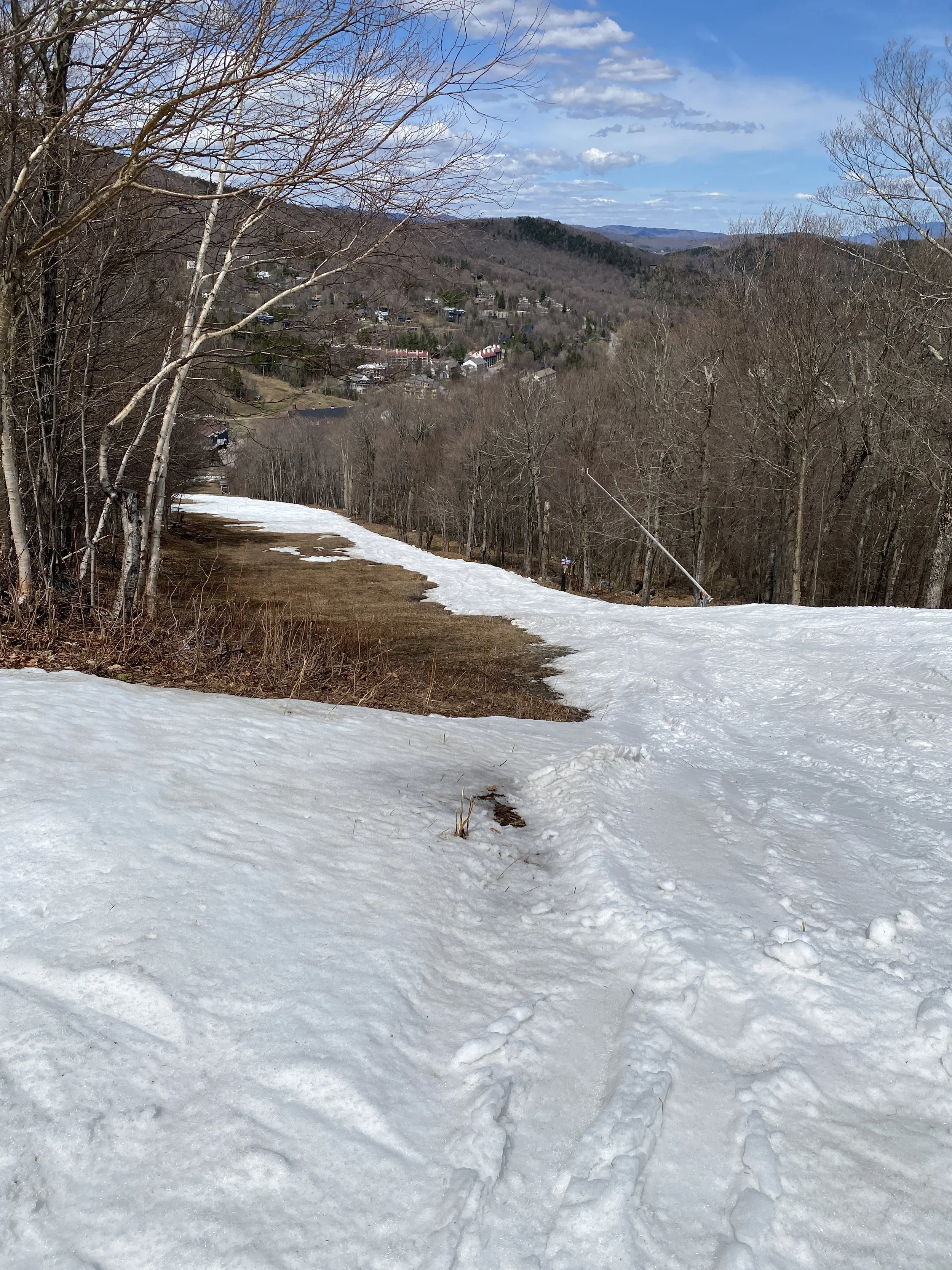 After skiing Stein’s some more, we decided to head back down Snowball to ski Spring Fling. Like Lower Snowball and Racer’s Edge, the snow on Spring Fling was soft and mashed up, but not bumped up. There were large bare spots on the right side, but the left side had good coverage. I’d say Spring Fling was my favorite run of the day in terms of conditions, with Lower Snowball and Racer’s Edge coming in second. With the walking required, this part of the mountain was also not as busy as Stein’s, which was nice.