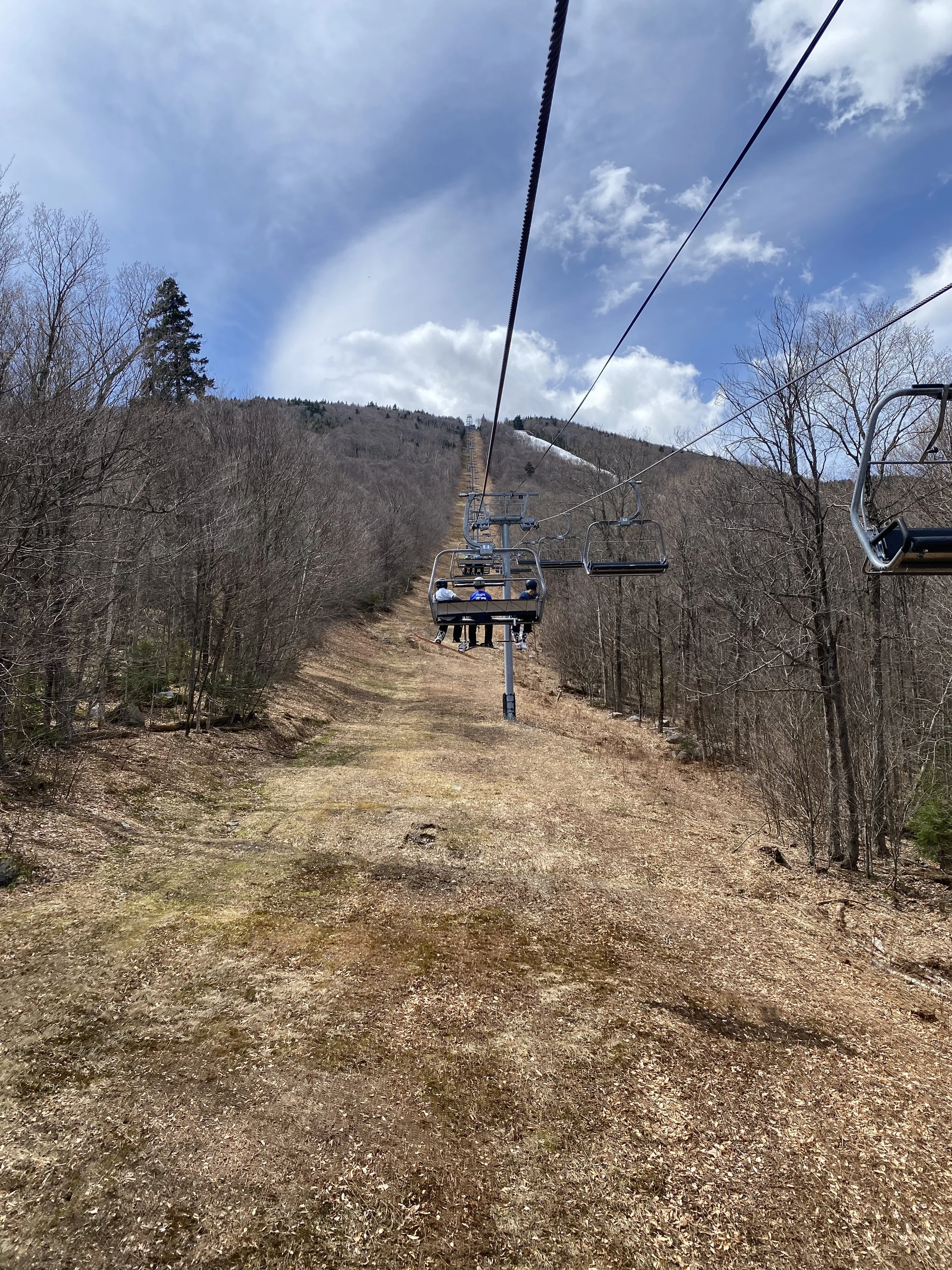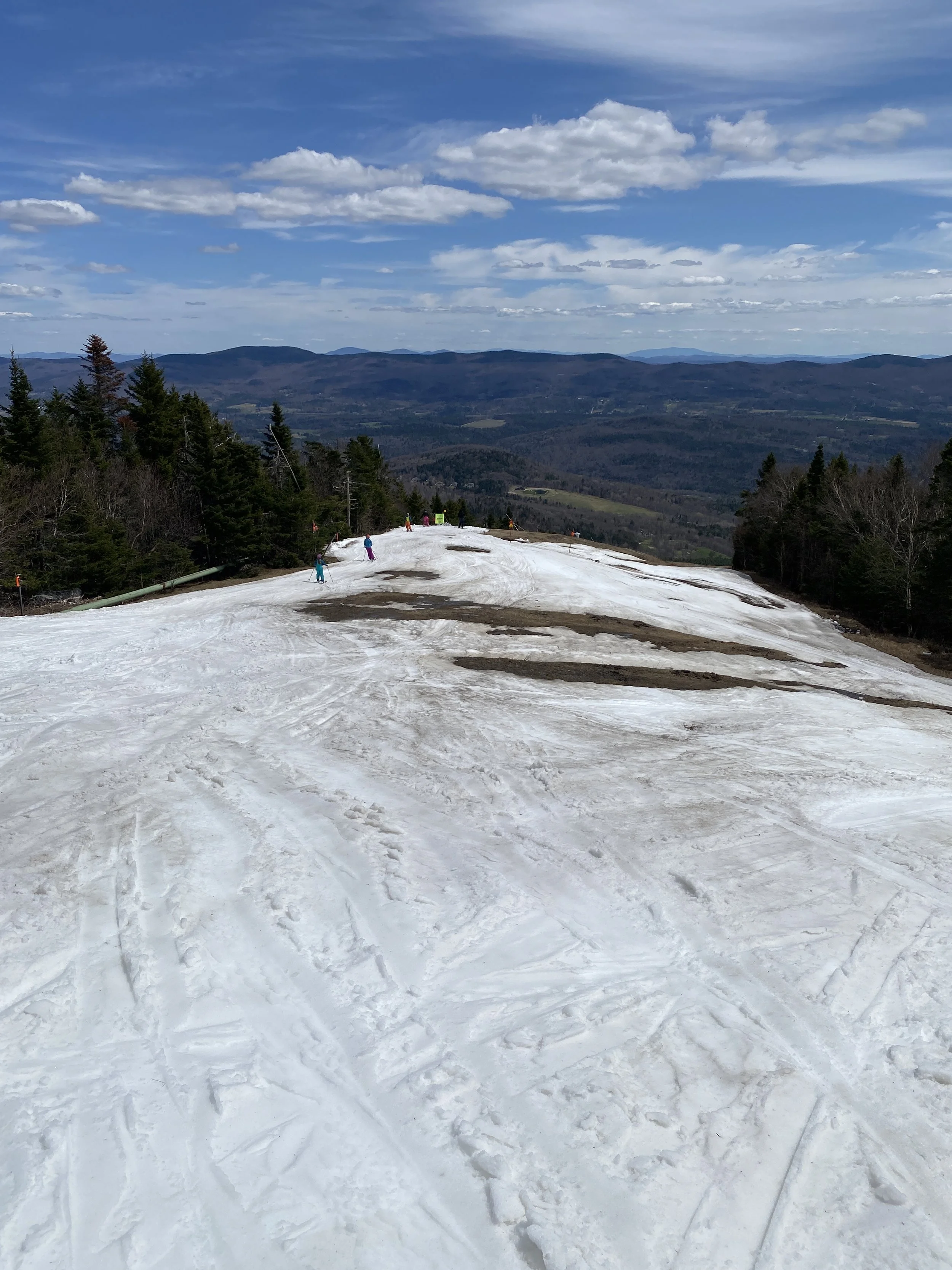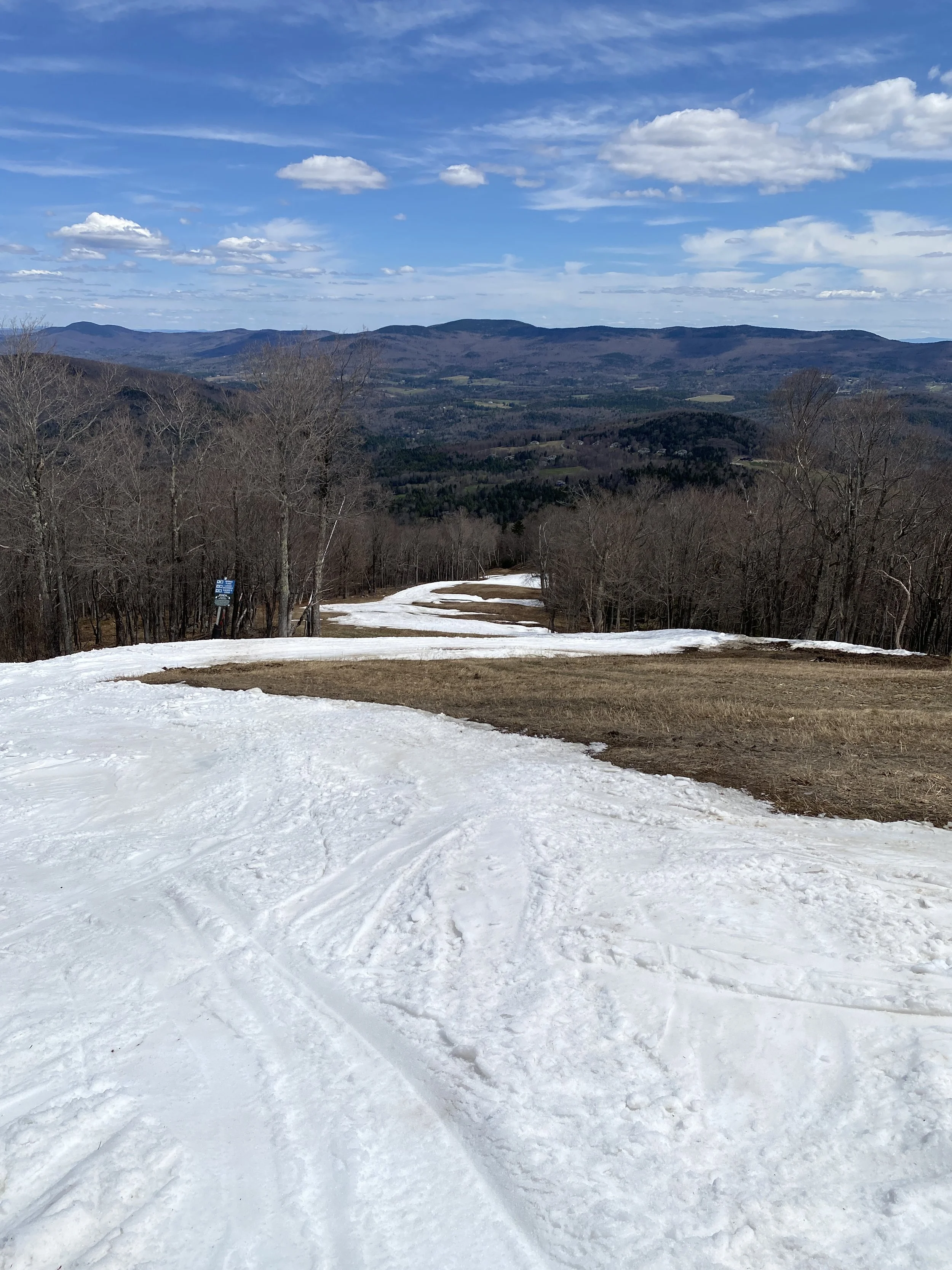After skiing Stein’s some more, we decided to head back down Snowball to ski Spring Fling. Like Lower Snowball and Racer’s Edge, the snow on Spring Fling was soft and mashed up, but not bumped up. There were large bare spots on the right side, but the left side had good coverage. I’d say Spring Fling was my favorite run of the day in terms of conditions, with Lower Snowball and Racer’s Edge coming in second. With the walking required, this part of the mountain was also not as busy as Stein’s, which was nice.
