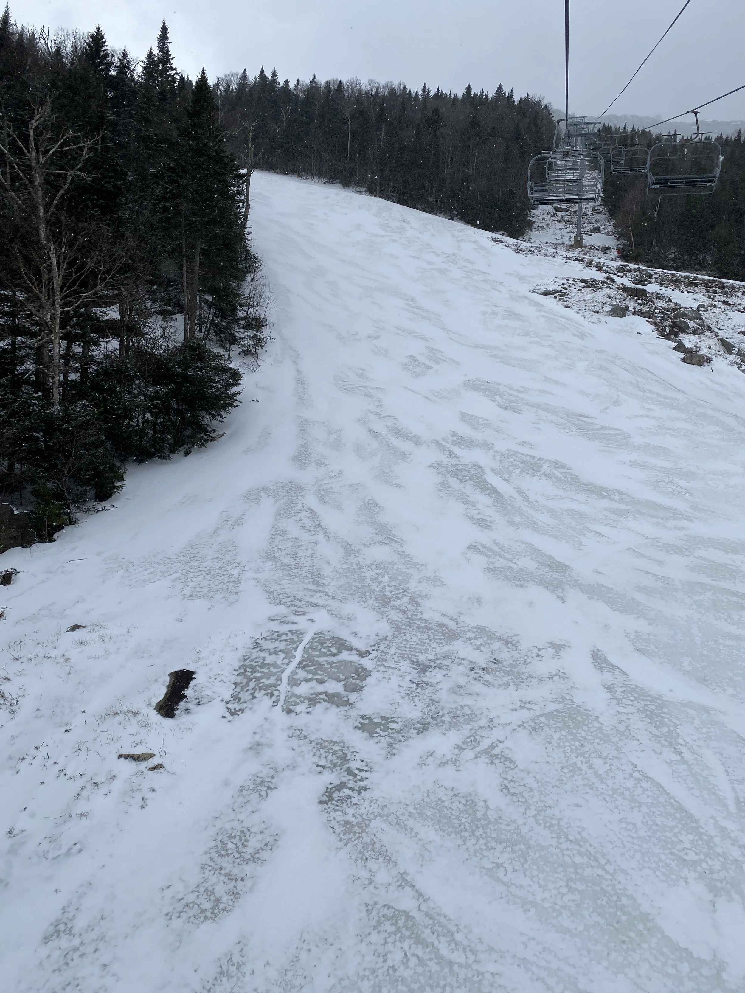 Since it was warm over the weekend, and then cold last night and today, there was some terrain closed due to icy conditions. This included Upper and Lower Skyward, Upper Parkway, and probably more runs that I can’t remember right now. The Follies was closed, and at least right off the top, that looked to be a coverage issue, though it may be skiable from the entrance a little ways down Paron’s Run. That said, that entrance was also closed today.